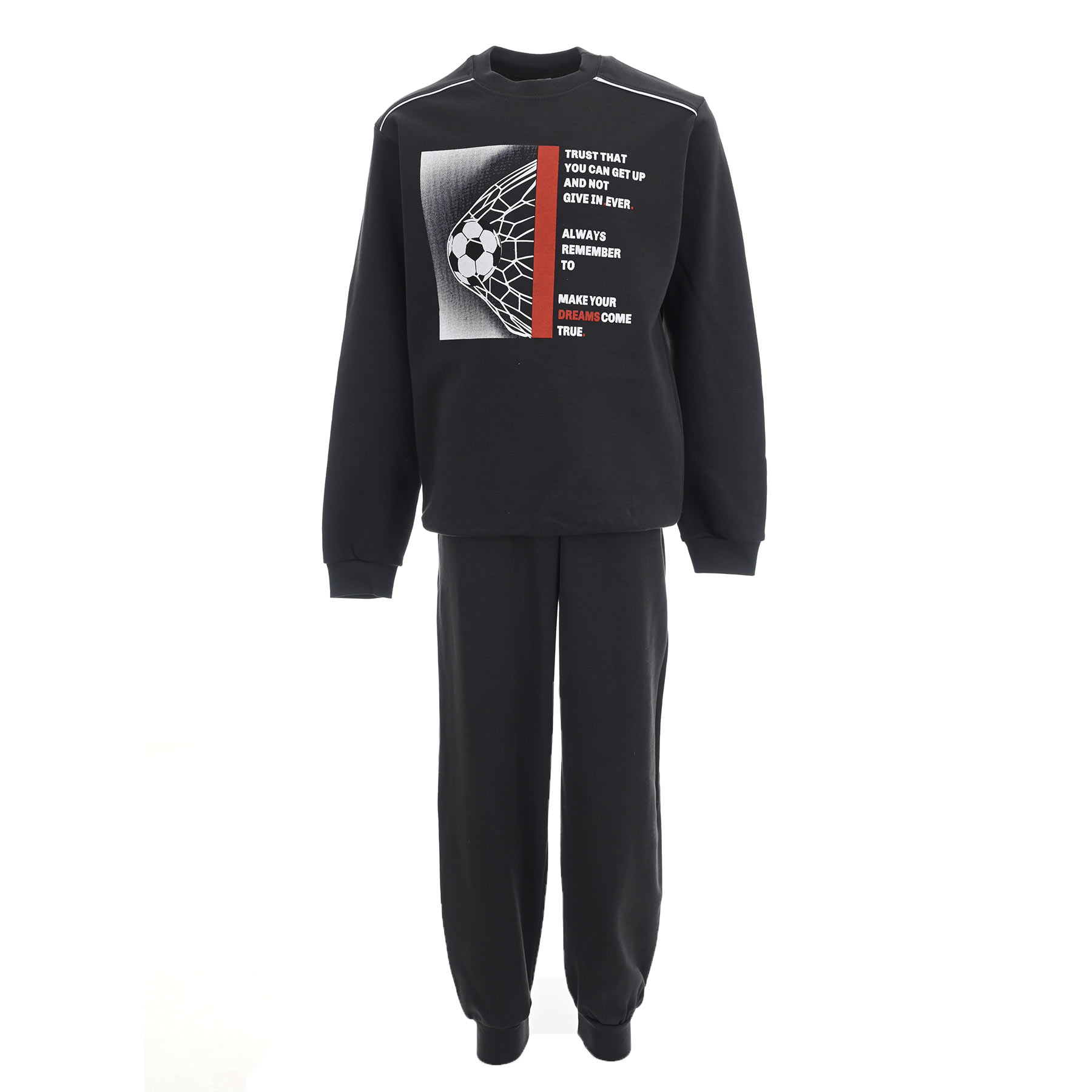 Η παιδική πυζάμα για αγόρια Joyce σε ανθρακί χρώμα συνδυάζει άνεση, στυλ και έμπνευση για μικρούς ονειροπόλους και λάτρεις του ποδοσφαίρου! Η μακρυμάνικη μπλούζα διαθέτει μοντέρνο print με ποδοσφαιρική μπάλα και ενθαρρυντικό μήνυμα Trust that you can get up and not give in ever Make your dreams come true, προσθέτοντας δυναμισμό και θετική ενέργεια.