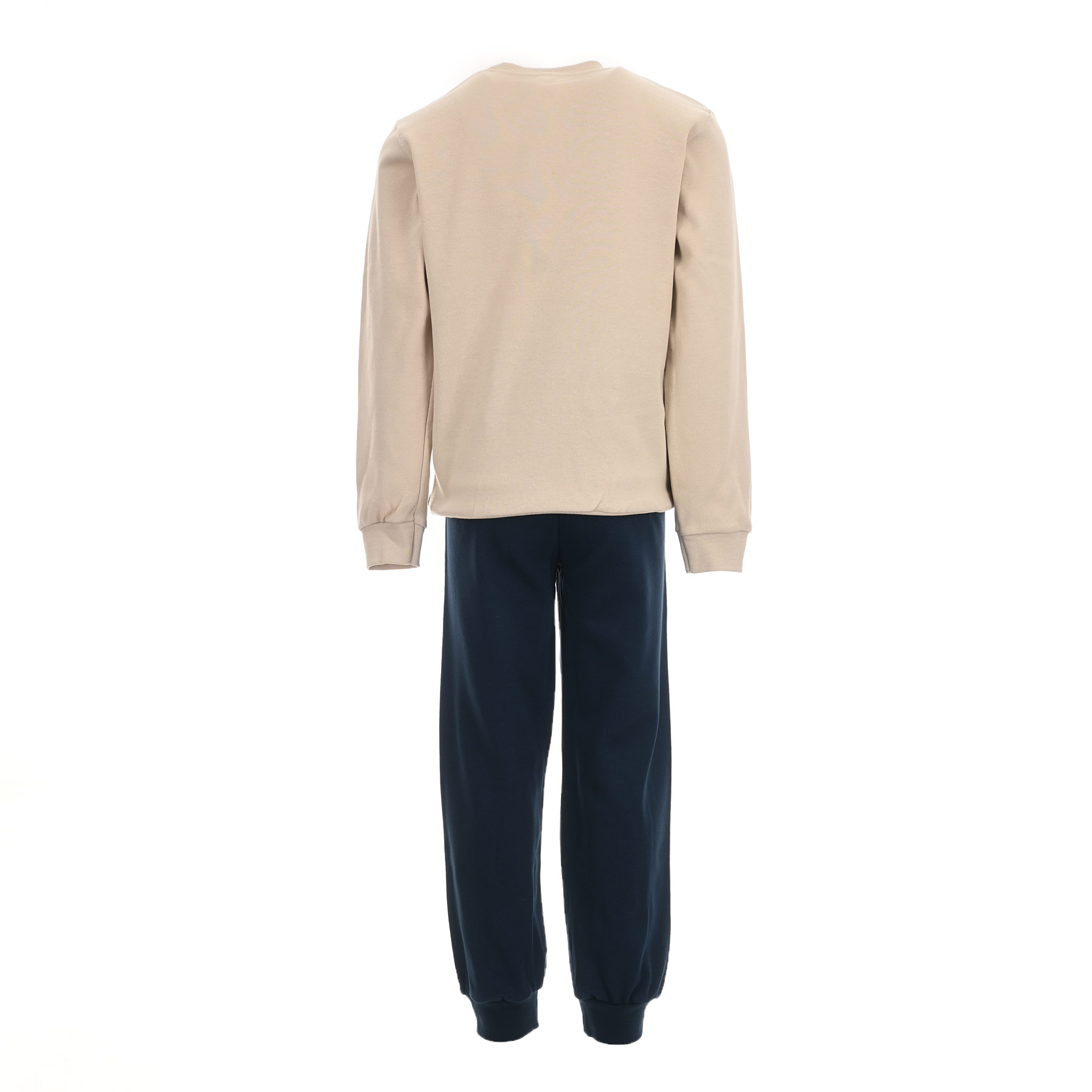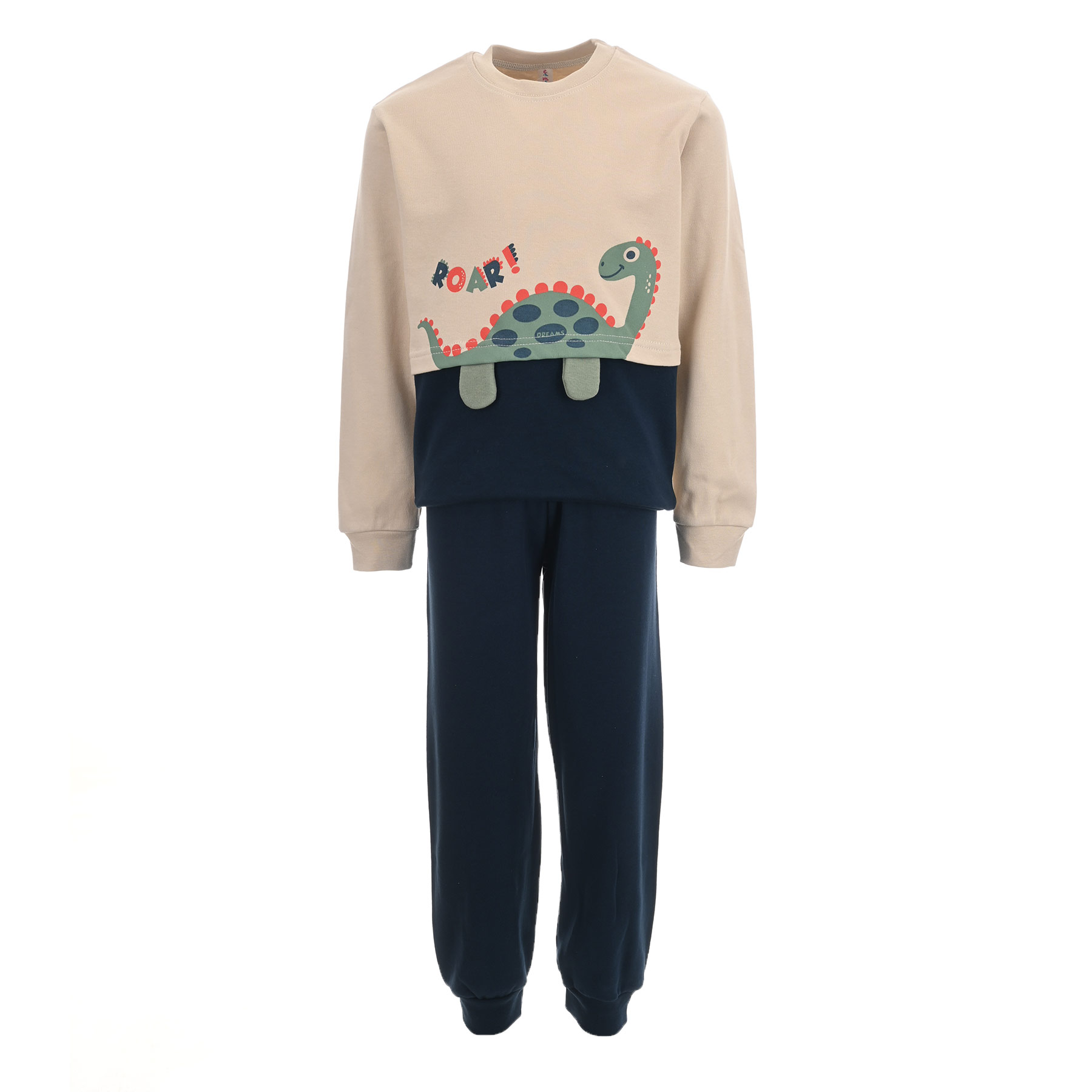 Χαρίστε στο μικρό σας άνετο και ζεστό ύπνο με την παιδική πιτζάμα Joyce για αγόρια, σε εκρού χρώμα με εντυπωσιακό σχέδιο δεινόσαυρο που θα ξετρελάνει κάθε μικρό εξερευνητή. Το σετ περιλαμβάνει μπλούζα με μακρύ μανίκι και διασκεδαστικό print "ROAR!" που συνδυάζεται με παντελόνι σε σκούρο μπλε, διαθέτοντας λάστιχο στη μέση και στο τελείωμα για άψογη εφαρμογή και ελευθερία κινήσεων.
