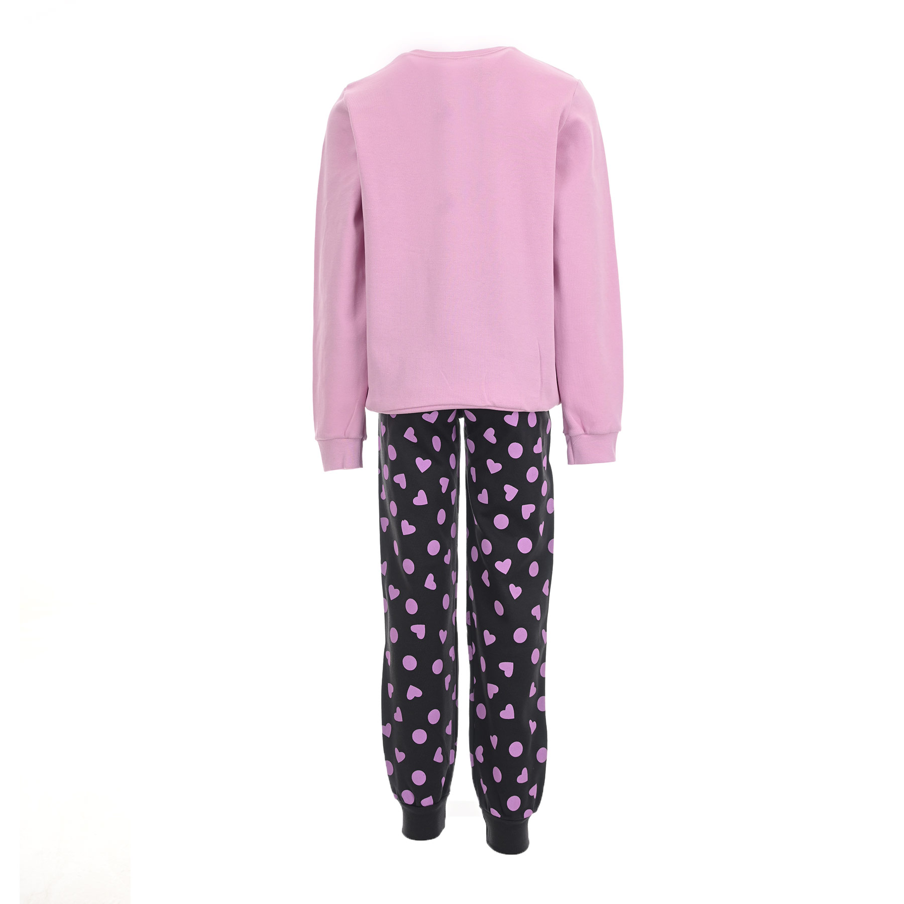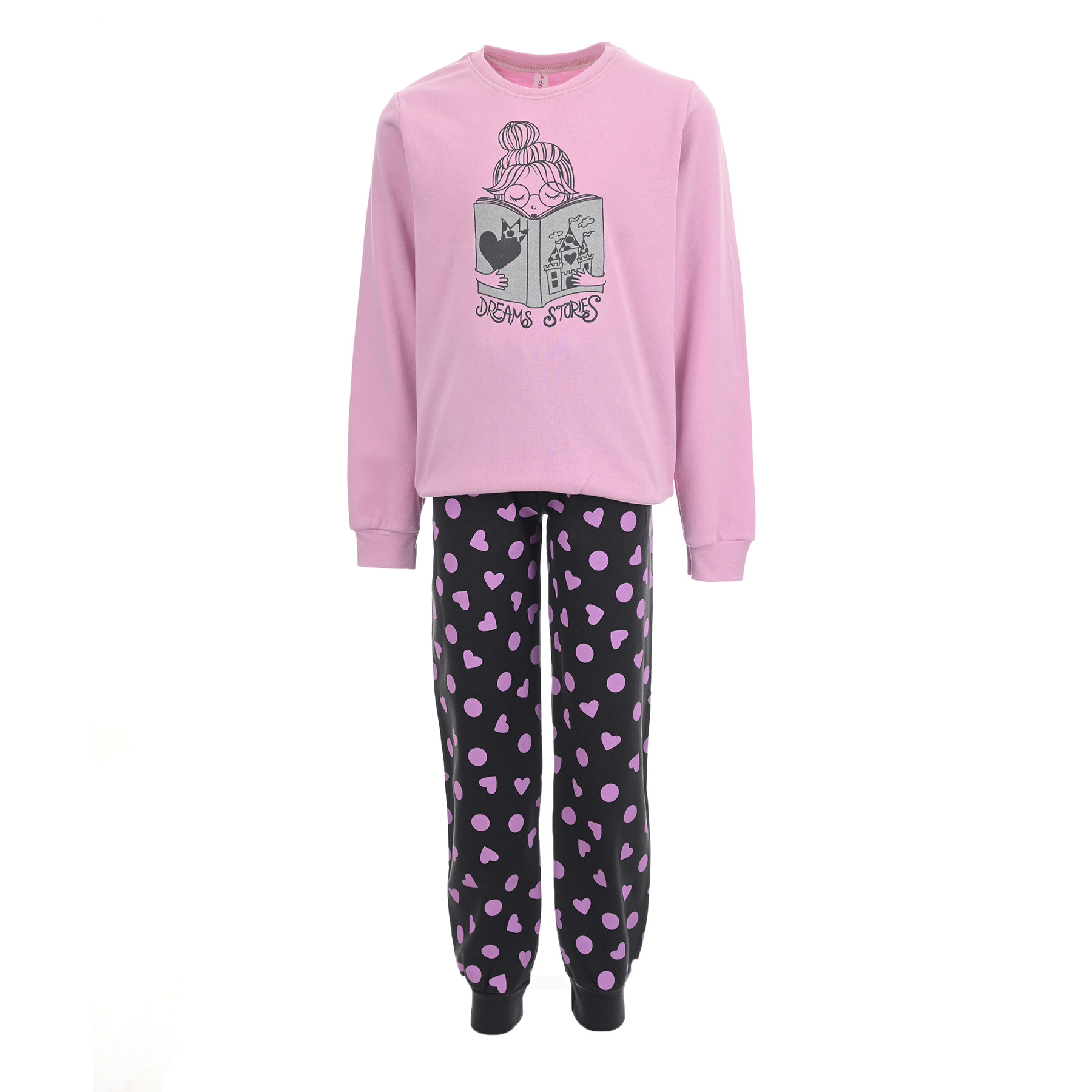 Παιδική πυζάμα Joyce για κορίτσια σε λιλά-μαύρο χρώμα, που συνδυάζει χαριτωμένο σχέδιο και άνεση για έναν ξεκούραστο ύπνο. Το σετ περιλαμβάνει μακρυμάνικη μπλούζα σε λιλά απόχρωση με εντυπωσιακό print Dream Stories και κοριτσίστικη φιγούρα που διαβάζει παραμύθια, καθώς και παντελόνι σε μαύρο χρώμα με ροζ καρδιές και βούλες.