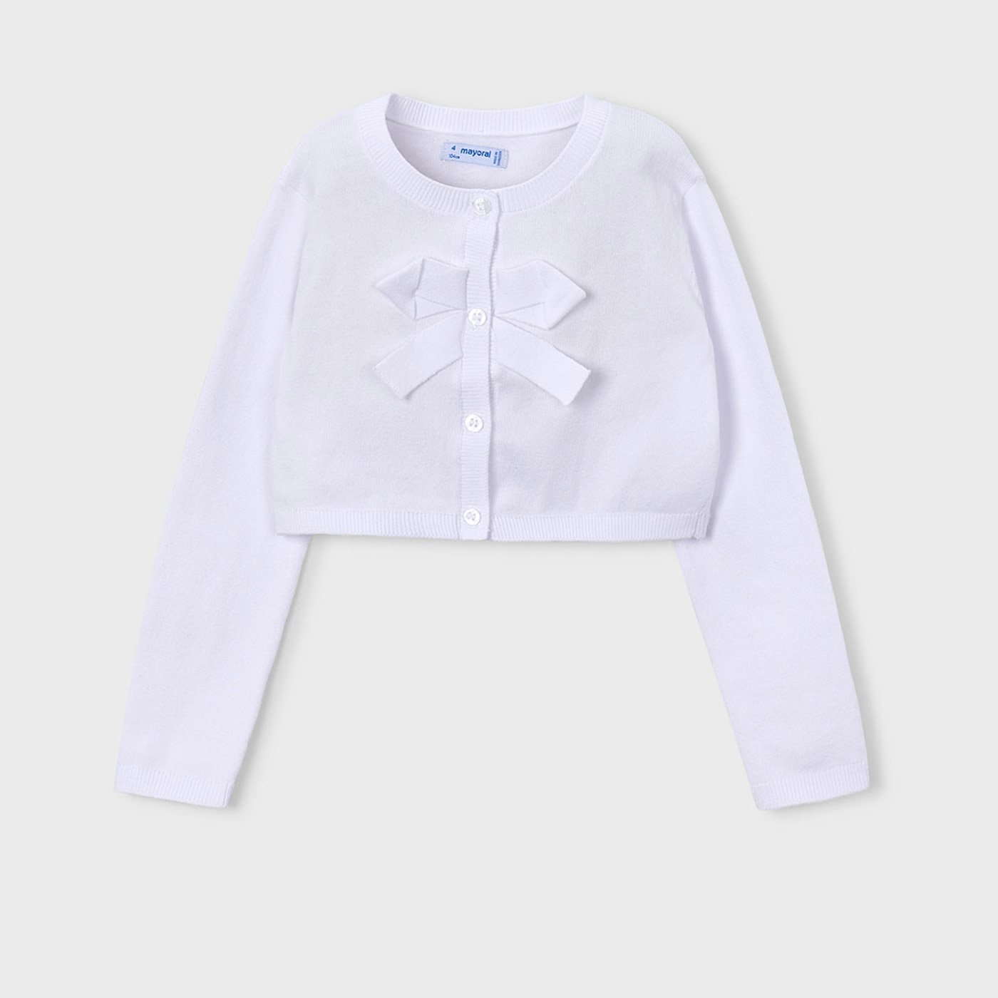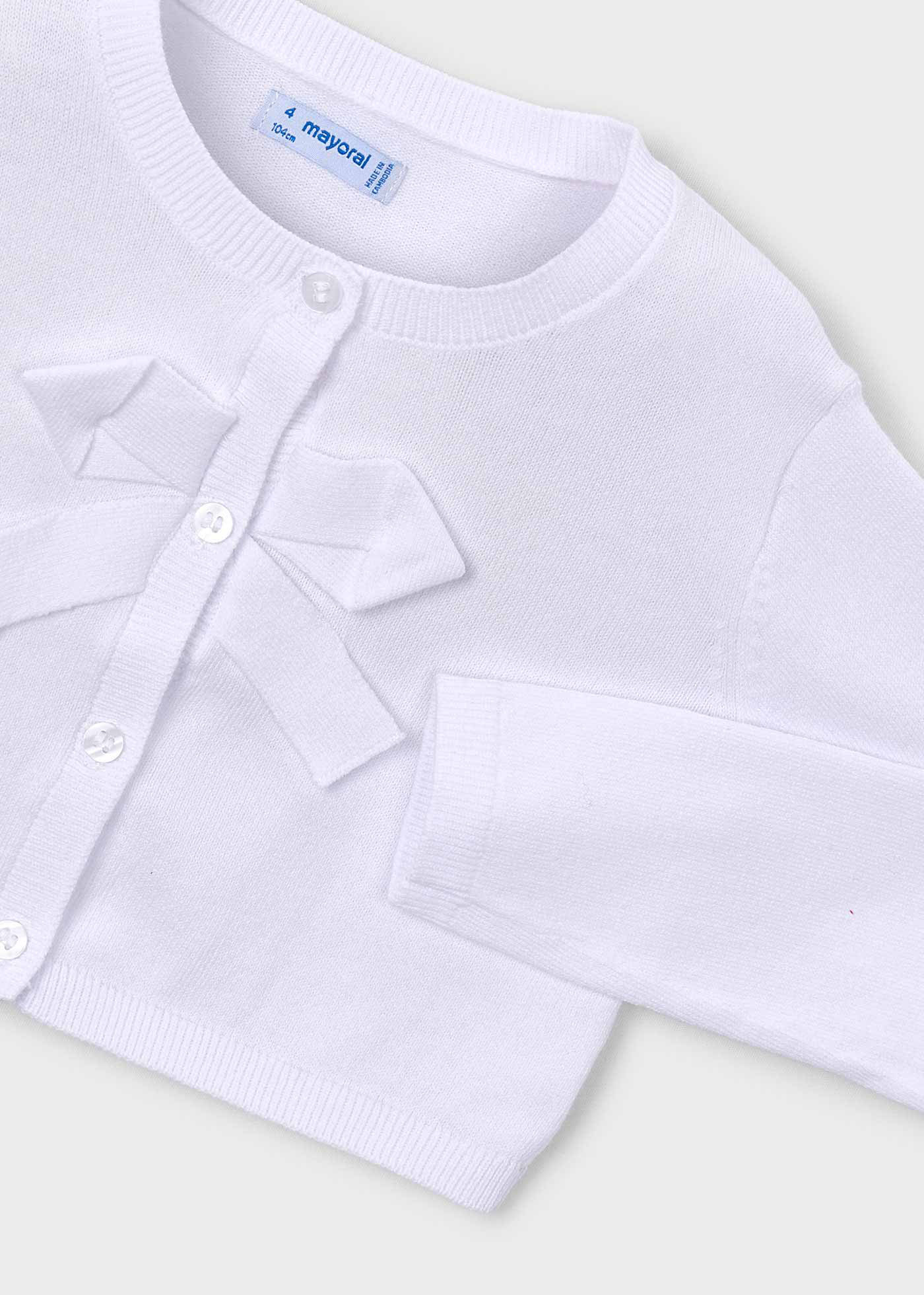 Χαρίστε κομψότητα στις εμφανίσεις της μικρής σας με την παιδική ζακέτα Mayoral σε λευκό χρώμα. Πρόκειται για ένα κομψό και άνετο κομμάτι, ιδανικό για καθημερινές αλλά και πιο ιδιαίτερες περιστάσεις, που συνδυάζει πρακτικότητα και girly αισθητική.Η ζακέτα διαθέτει κλασική στρογγυλή λαιμόκοψη και κουμπώνει μπροστά με κουμπιά, ενώ το διακριτικό πλεκτό φιόγκο στο στήθος προσθέτει μια χαριτωμένη και elegant πινελιά. Η απαλή πλεκτή υφή της προσφέρει άνεση και ζεστασιά, χωρίς να βαραίνει, καθιστώντας την ιδανική για άνοιξη, φθινόπωρο αλλά και δροσερά καλοκαιρινά βράδια.Συνδυάζεται εύκολα με φορέματα, φούστες ή παντελόνια και αποτελεί βασικό κομμάτι της παιδικής γκαρνταρόμπας.