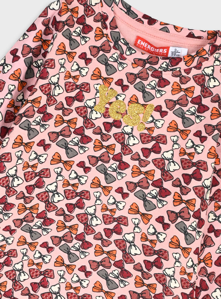 Ανανεώστε την παιδική γκαρνταρόμπα με αυτό το υπέροχο παιδικό φόρεμα φούτερ Energiers για κορίτσια σε ροζ χρώμα. Το φόρεμα ξεχωρίζει με το παιχνιδιάρικο all-over print με φιογκάκια και τη χρυσή λεπτομέρεια με τη λέξη Yes! που χαρίζει επιπλέον λάμψη στο στυλ.