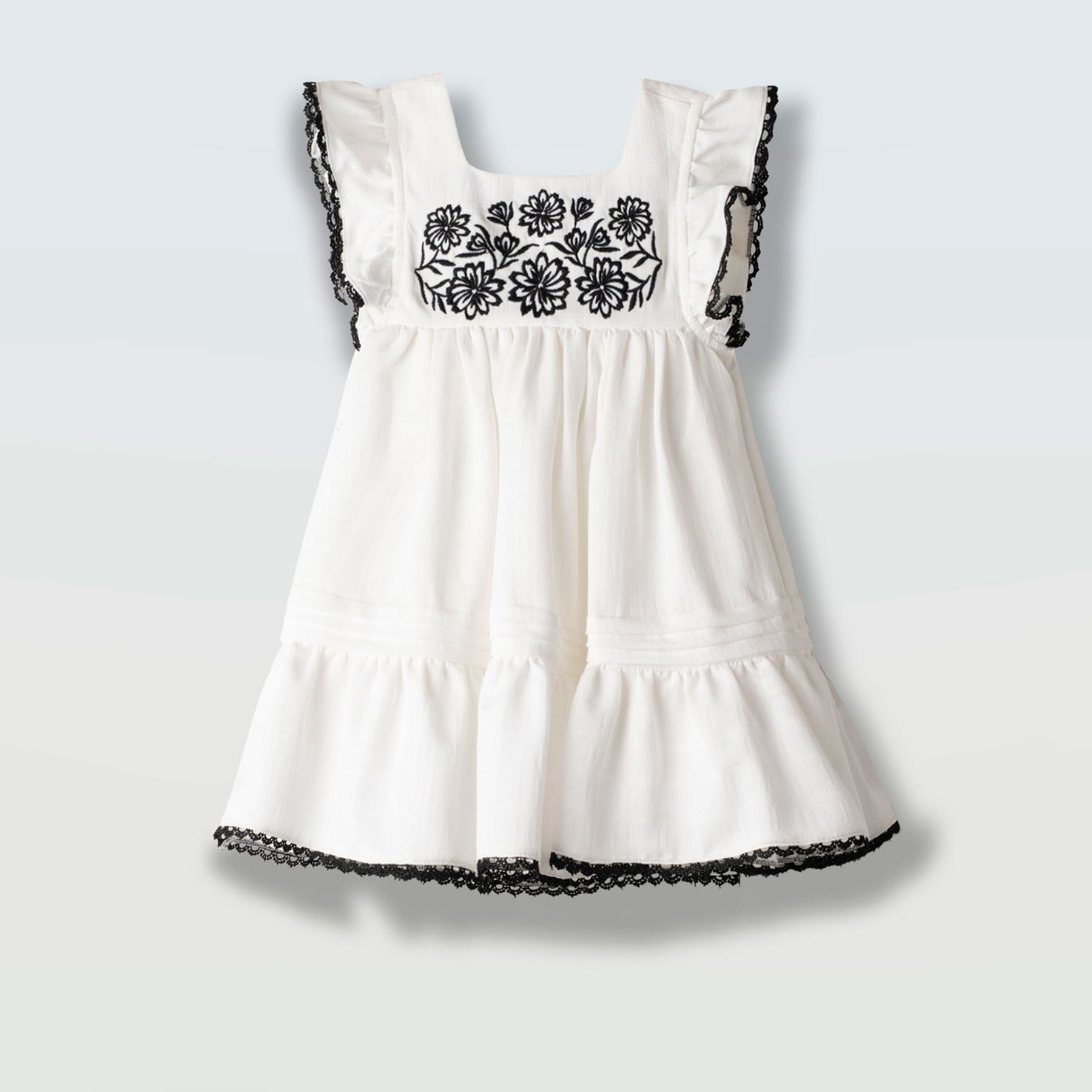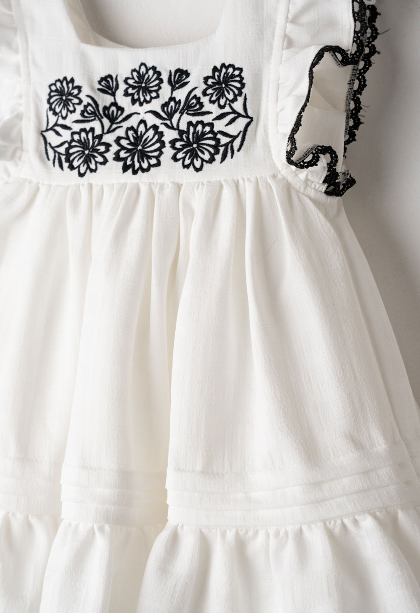 Το φόρεμα διαθέτει εντυπωσιακό κέντημα με μαύρα λουλούδια στο επάνω μέρος, δημιουργώντας μια όμορφη αντίθεση με τη λευκή βάση. Τα βολάν στους ώμους και οι διακριτικές δαντελένιες λεπτομέρειες στο τελείωμα προσθέτουν κομψότητα και ρομαντική αισθητική. Η αέρινη γραμμή με διακριτικές πιέτες προσφέρει άνεση και ελευθερία κινήσεων.
