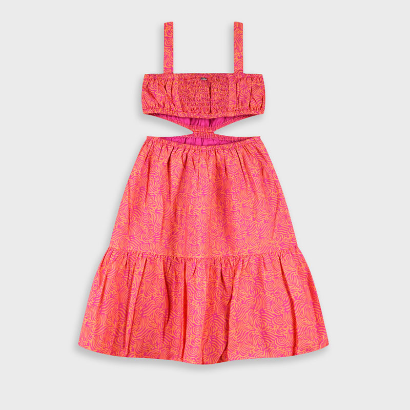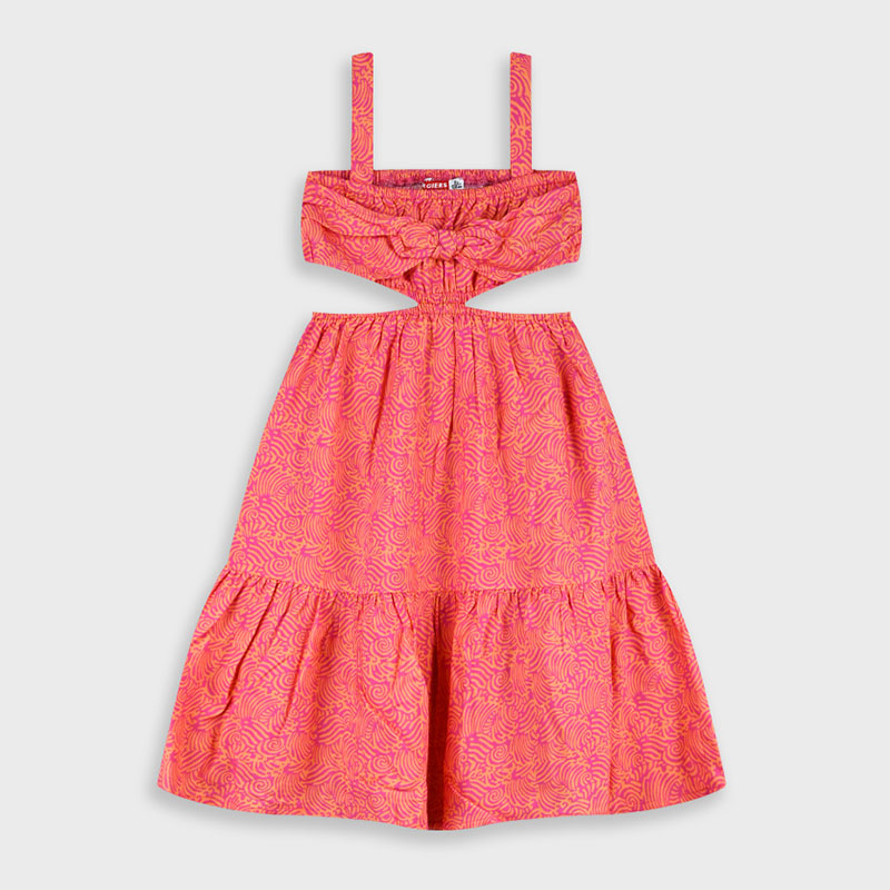 Παιδικό καλοκαιρινό φόρεμα για κορίτσια από την Energiers, σε ζωηρό πορτοκαλί-φούξια συνδυασμό, ιδανικό για εμφανίσεις που ξεχωρίζουν. Το έντονο μοτίβο με καλοκαιρινά σχέδια προσδίδει παιχνιδιάρικο χαρακτήρα, ενώ ο μοντέρνος σχεδιασμός με τιράντες και άνοιγμα στη μέση δημιουργεί ένα άνετο και ταυτόχρονα στιλάτο αποτέλεσμα.Κατασκευασμένο από ελαφρύ και απαλό ύφασμα, επιτρέπει στο δέρμα να αναπνέει, προσφέροντας δροσιά και ελευθερία κινήσεων όλη την ημέρα. Η ελαστική μέση και η φαρδιά γραμμή στη φούστα εξασφαλίζουν άψογη εφαρμογή και άνεση, καθιστώντας το ιδανική επιλογή για βόλτες, διακοπές, παιδικά πάρτι αλλά και καθημερινές καλοκαιρινές δραστηριότητες.