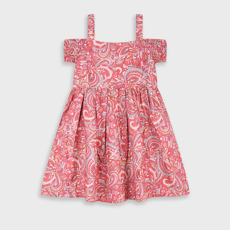Παιδικό φόρεμα για κορίτσια σε εντυπωσιακό ροζ λαχούρ σχέδιο, ιδανικό για ανοιξιάτικες και καλοκαιρινές εμφανίσεις. Το φόρεμα διαθέτει τιράντες και έξω ώμους (cold shoulder), προσφέροντας μοντέρνο και δροσερό στυλ. Η ανάλαφρη γραμμή του με σούρες στη μέση χαρίζει άνεση και ελευθερία κινήσεων, ενώ το απαλό ύφασμα είναι φιλικό προς το παιδικό δέρμα.Ένα κομψό και χαρούμενο φόρεμα που φοριέται εύκολα από το πρωί μέχρι το βράδυ από τη βόλτα και το πάρτι μέχρι τις διακοπές.
