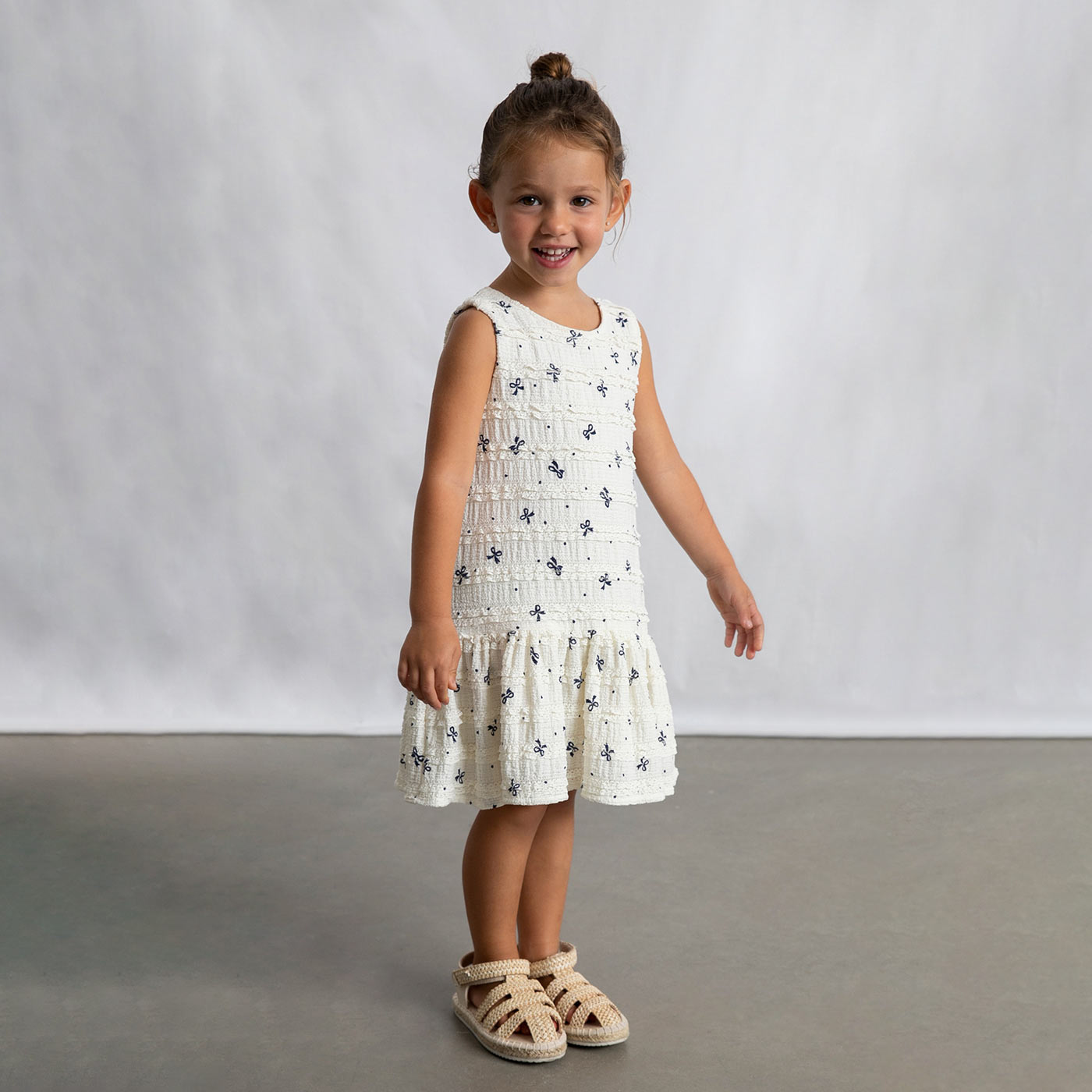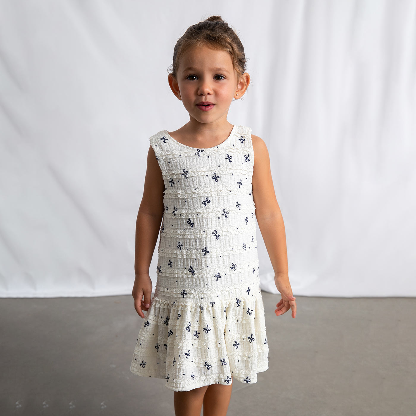 Το παιδικό φόρεμα Mayoral για κορίτσια σε κομψό εκρού χρώμα αποτελεί μια διαχρονική και elegant επιλογή για τις πιο ξεχωριστές αλλά και καθημερινές εμφανίσεις. Διακοσμημένο με διακριτικό μπλε print φιόγκους, προσδίδει ρομαντικό και φίνο ύφος, ιδανικό για μικρές κυρίες.Το φόρεμα είναι αμάνικο, με ανάγλυφη υφή υφάσματος και βολάν στο τελείωμα, που χαρίζουν κίνηση και άνεση. Το κούμπωμα στο πίσω μέρος εξασφαλίζει εύκολη εφαρμογή, ενώ η άνετη γραμμή επιτρέπει ελευθερία κινήσεων καθ όλη τη διάρκεια της ημέρας.Ιδανικό για γιορτές, βαπτίσεις, οικογενειακές εκδηλώσεις, αλλά και προσεγμένες καθημερινές εμφανίσεις, συνδυάζει άψογα την ποιότητα της Mayoral με κομψό παιδικό στυλ.