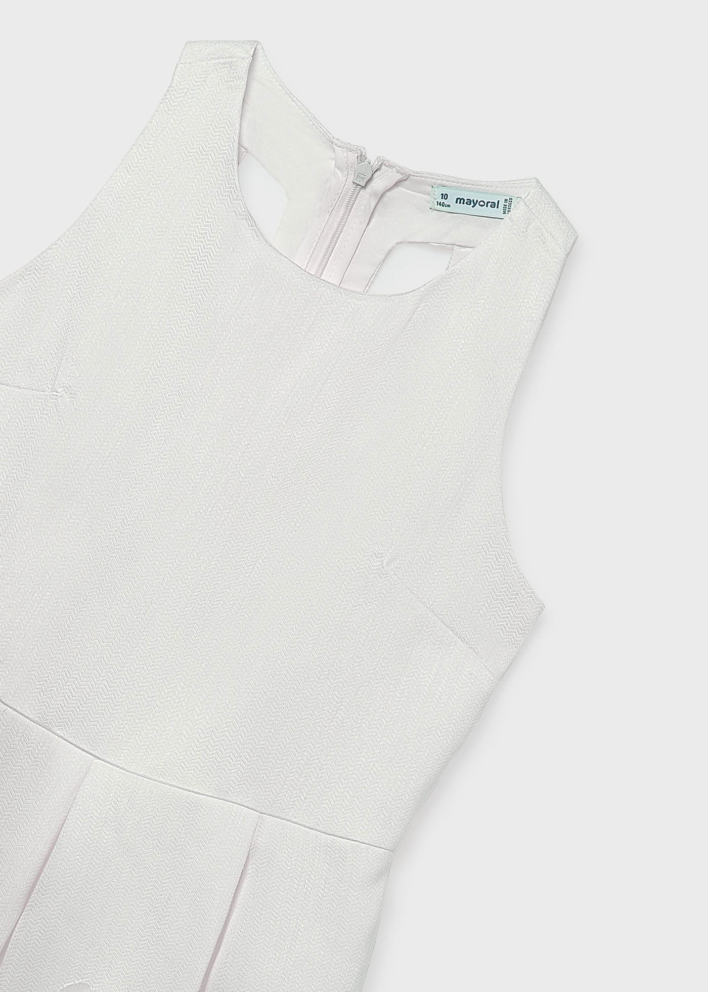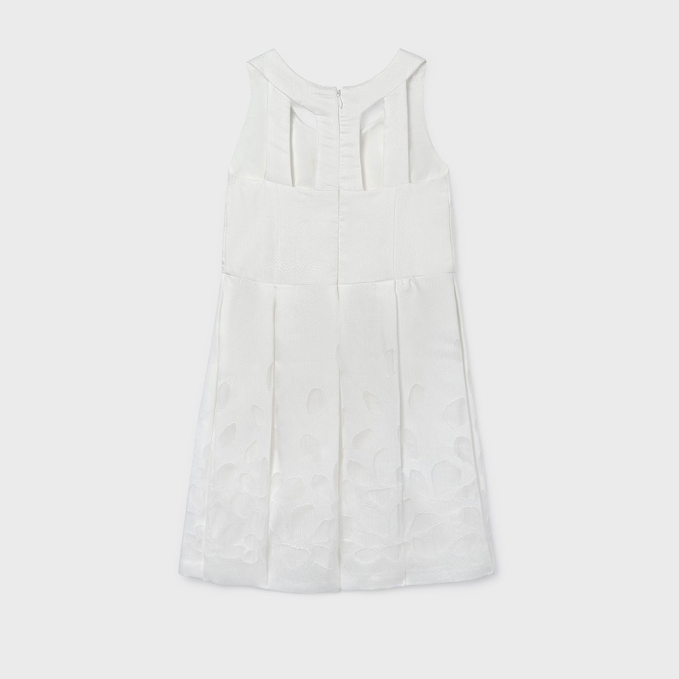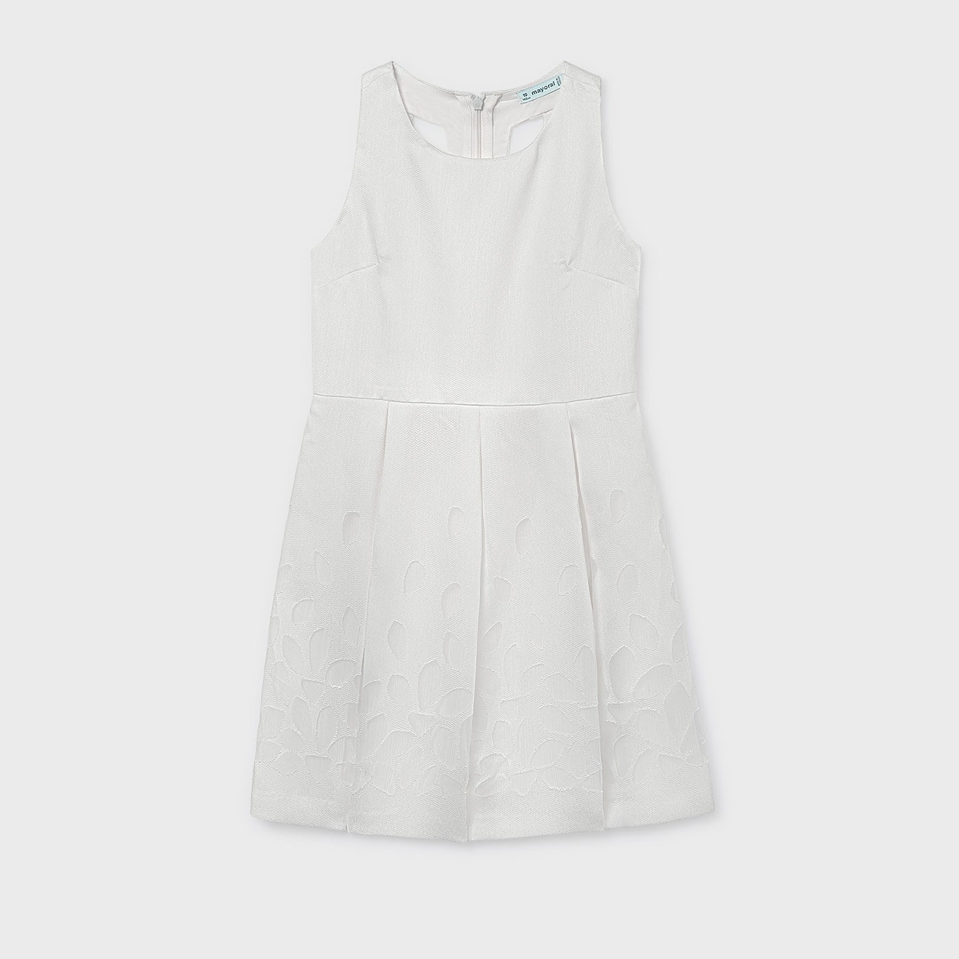 Το φόρεμα διαθέτει αμάνικο σχέδιο και κλασική στρογγυλή λαιμόκοψη, προσφέροντας καθαρή και κομψή γραμμή. Το ύφασμα έχει διακριτική ανάγλυφη υφή, που χαρίζει πολυτελή όψη χωρίς υπερβολές, ενώ στο κάτω μέρος ξεχωρίζει το ανάγλυφο floral μοτίβο, που προσθέτει ρομαντικό χαρακτήρα και βάθος στο σχέδιο.Η Α-line γραμμή με απαλές πιέτες επιτρέπει φυσική κίνηση και όμορφη εφαρμογή στο σώμα, δημιουργώντας ένα αποτέλεσμα που είναι ταυτόχρονα κομψό και παιδικά χαριτωμένο. Η εσωτερική φόδρα εξασφαλίζει άνεση και απαλή αίσθηση στο δέρμα, ώστε να φοριέται ευχάριστα για πολλές ώρες.Το κρυφό φερμουάρ στο πίσω μέρος διευκολύνει την εφαρμογή και διατηρεί την καθαρή αισθητική του φορέματος.