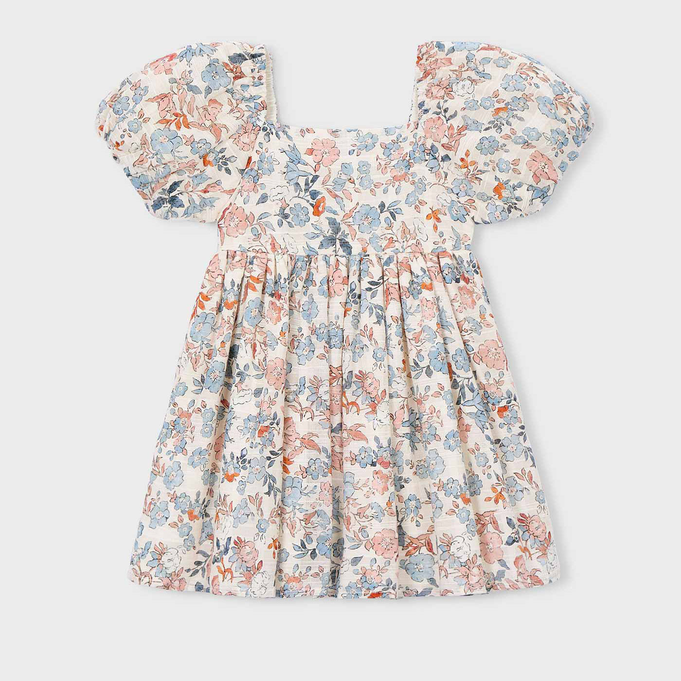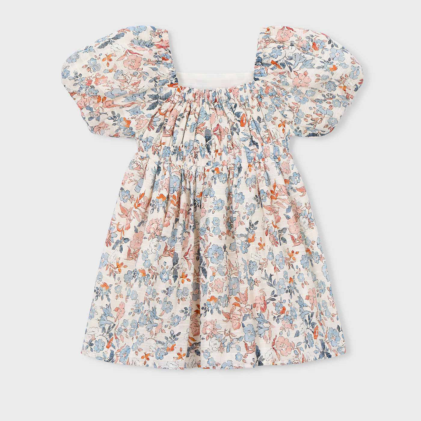 Χαρίστε ρομαντικό και ανοιξιάτικο στυλ στις εμφανίσεις της μικρής σας με αυτό το υπέροχο παιδικό φόρεμα Mayoral σε φλοράλ μοτίβο σομόν και σιέλ αποχρώσεων. Ένα κομμάτι που συνδυάζει διαχρονική κομψότητα με παιδική φρεσκάδα, ιδανικό για κάθε περίσταση.Το φόρεμα διαθέτει αμπίρ γραμμή που προσφέρει άνετη εφαρμογή και ελευθερία κινήσεων, ενώ τα κοντά, φουσκωτά μανίκια προσθέτουν ρομαντικό χαρακτήρα. Το ελαφρύ και δροσερό ύφασμα το καθιστά ιδανικό για τις ζεστές ημέρες της άνοιξης και του καλοκαιριού. Η ελαστική λαιμόκοψη στο πίσω μέρος εξασφαλίζει εύκολη εφαρμογή και άνεση.