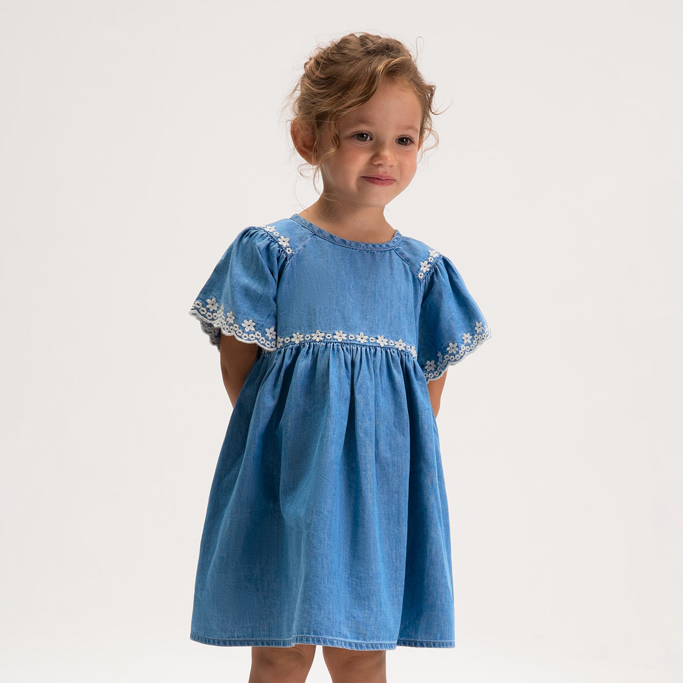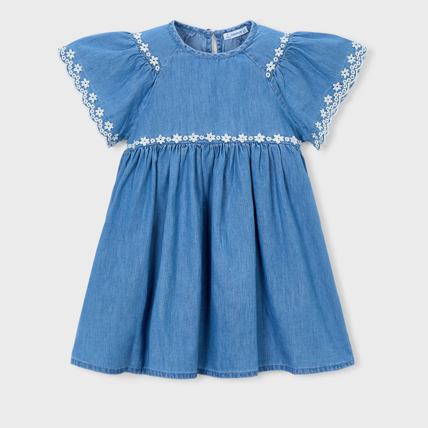 Αναδείξτε τις καλοκαιρινές εμφανίσεις με αυτό το κομψό παιδικό φόρεμα Mayoral σε μπλε τζιν απόχρωση, σχεδιασμένο για άνεση και στυλ. Το φόρεμα ξεχωρίζει για το λεπτό κέντημα με λευκά λουλουδάκια στο στήθος και στα μανίκια τύπου πεταλούδα, χαρίζοντας ρομαντική και διαχρονική αισθητική.Η άνετη, αμπίρ γραμμή προσφέρει ελευθερία κινήσεων, ενώ το ελαφρύ τζιν ύφασμα το καθιστά ιδανικό για τις ζεστές ημέρες. Διαθέτει κουμπάκι στο πίσω μέρος για εύκολη εφαρμογή και σταθερή εφαρμογή στον λαιμό. Ένα φόρεμα που συνδυάζει ποιότητα, πρακτικότητα και κομψότητα, υπογεγραμμένο από τη Mayoral.