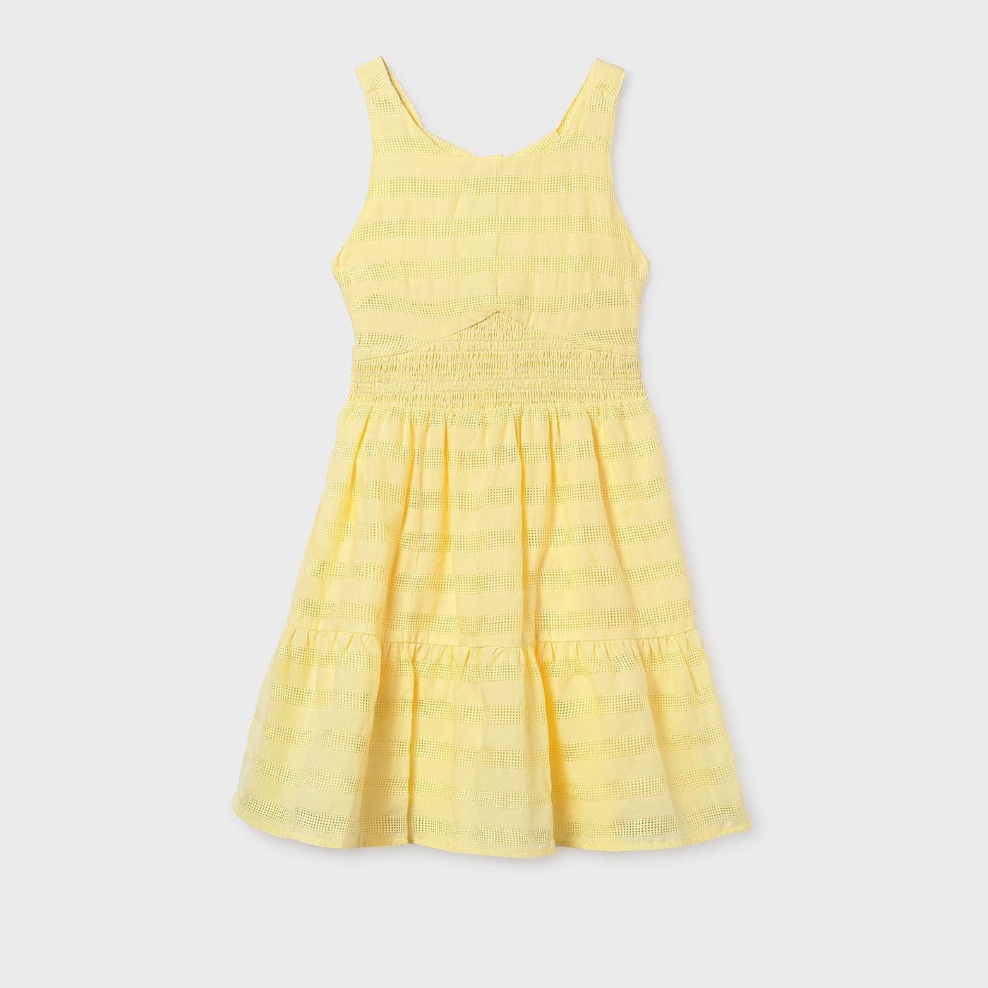 Φωτεινό, ανάλαφρο και απόλυτα καλοκαιρινό, αυτό το παιδικό φόρεμα για κορίτσια Mayoral σε χαρούμενη κίτρινη απόχρωση είναι η τέλεια επιλογή για ξεχωριστές καθημερινές εμφανίσεις. Ένα φόρεμα που συνδυάζει άνεση, κομψότητα και παιχνιδιάρικο στιλ.Κατασκευασμένο από απαλό και δροσερό ύφασμα, διαθέτει αμάνικο σχέδιο και ελαστική μέση που αγκαλιάζει απαλά το σώμα, προσφέροντας άνετη εφαρμογή και ελευθερία κινήσεων. Η ανάγλυφη υφή με διακριτικές ρίγες και η φαρδιά, αέρινη φούστα χαρίζουν κίνηση και καλοκαιρινή διάθεση σε κάθε βήμα. Το κίτρινο χρώμα αποπνέει φρεσκάδα και αισιοδοξία, ιδανικό για ηλιόλουστες ημέρες.Ιδανικό για βόλτες, διακοπές, γιορτές αλλά και casual εμφανίσεις, αυτό το φόρεμα αποτελεί must-have επιλογή για την παιδική καλοκαιρινή γκαρνταρόμπα.