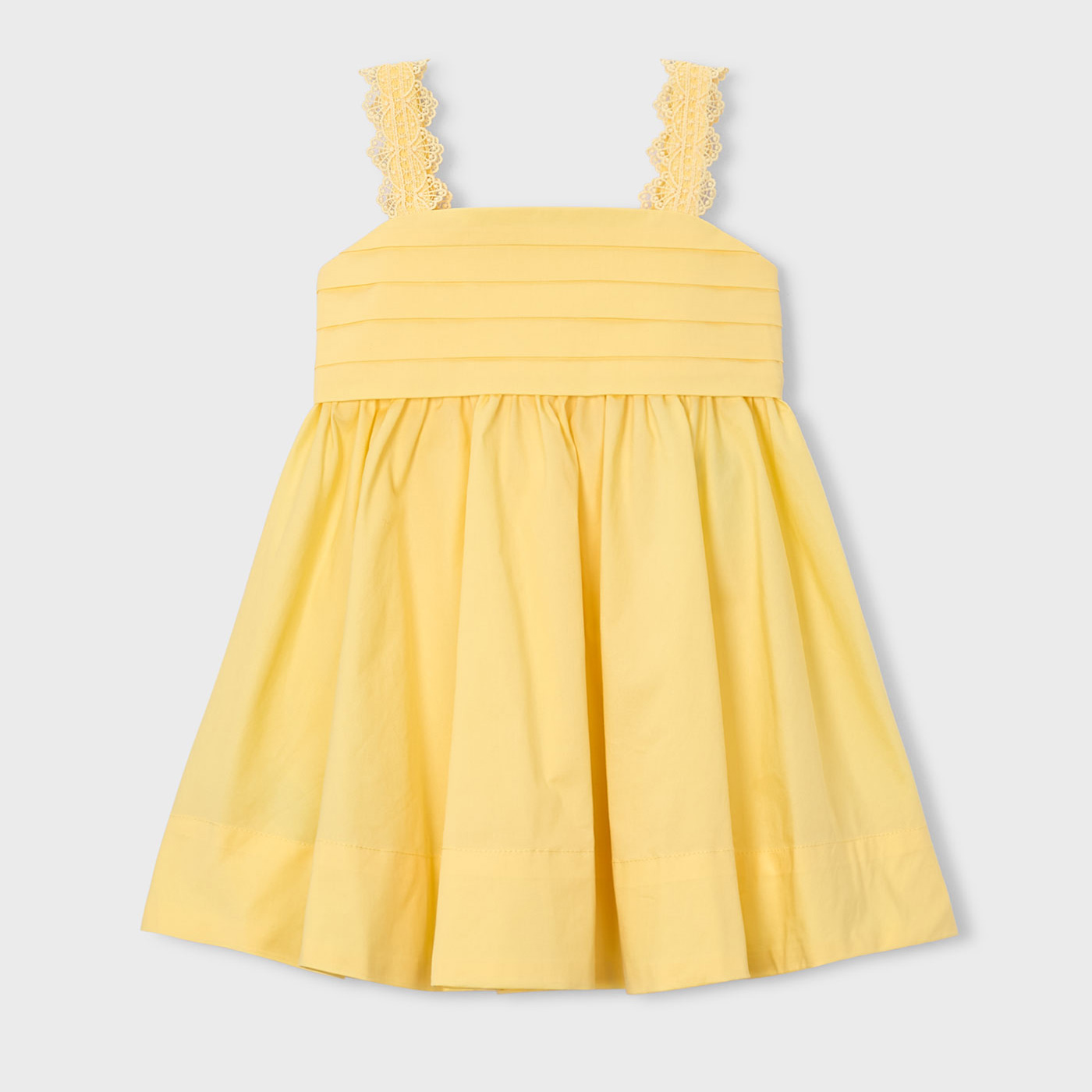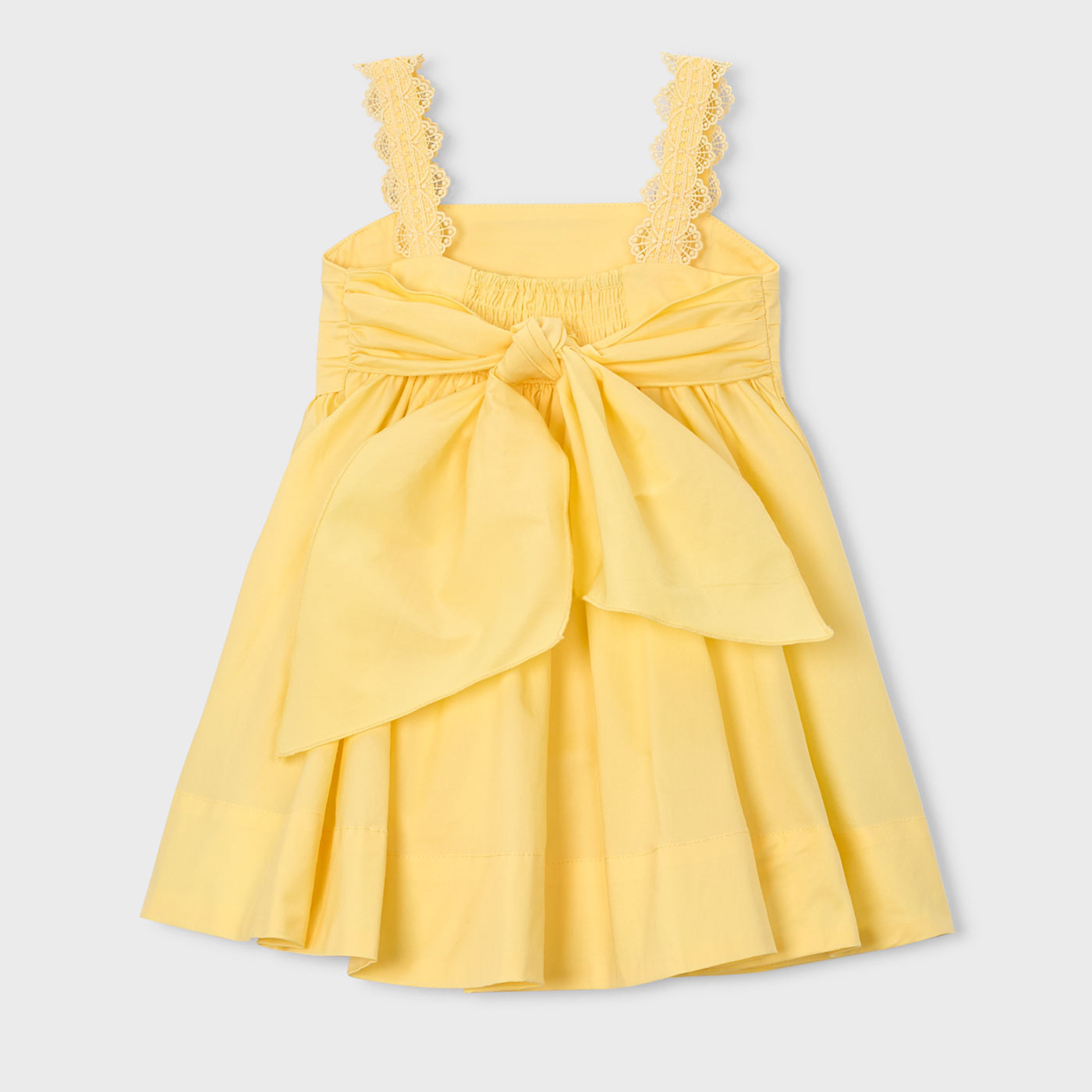 Το παιδικό φόρεμα Mayoral σε εντυπωσιακό κίτρινο χρώμα είναι η ιδανική επιλογή για κορίτσια που αγαπούν τη κομψότητα με μια παιχνιδιάρικη πινελιά. Κατασκευασμένο από ελαφρύ και δροσερό ύφασμα, προσφέρει άνεση όλη την ημέρα, ενώ παράλληλα ξεχωρίζει για τον προσεγμένο σχεδιασμό του.Το φόρεμα διαθέτει φαρδιές τιράντες με δαντελένια λεπτομέρεια, κομψό πλισέ μπούστο και ζώνη που δένει φιόγκο στην πλάτη, χαρίζοντας μία ρομαντική και ιδιαίτερα θηλυκή εμφάνιση. Η άνετη γραμμή και η αέρινη φούστα επιτρέπουν ελευθερία κινήσεων, καθιστώντας το ιδανικό τόσο για καθημερινές εμφανίσεις όσο και για πιο επίσημες περιστάσεις.