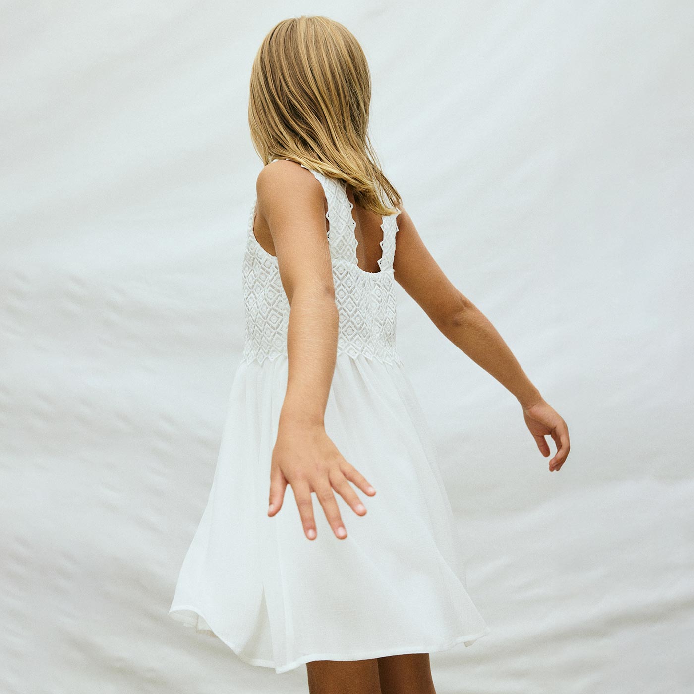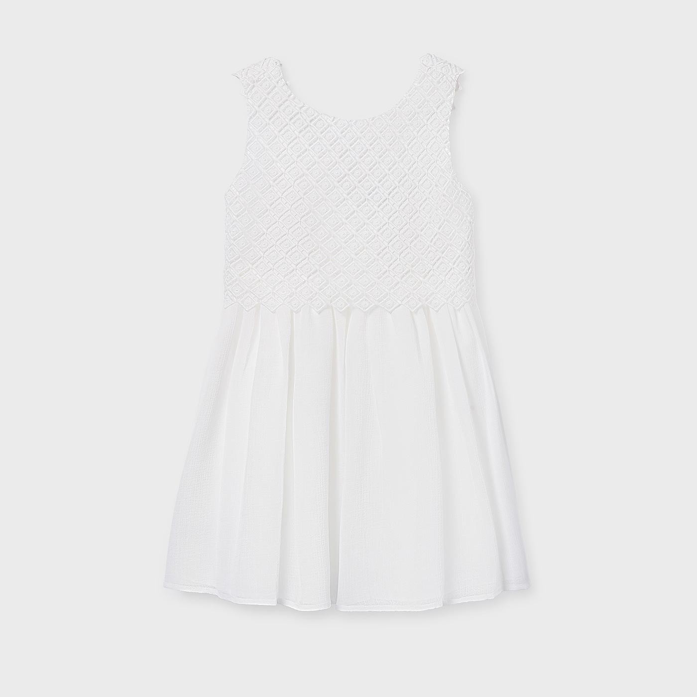 Χαρίστε στη μικρή σας μια κομψή και ρομαντική εμφάνιση με το παιδικό φόρεμα Mayoral σε κρεμ απόχρωση, ένα διαχρονικό κομμάτι που ξεχωρίζει για τη φίνα αισθητική και την εξαιρετική ποιότητά του. Ιδανικό για ξεχωριστές περιστάσεις, αυτό το φόρεμα συνδυάζει άνεση και κομψότητα με τρόπο μοναδικό.Το επάνω μέρος είναι διακοσμημένο με λεπτοδουλεμένη δαντέλα σε γεωμετρικό μοτίβο, προσδίδοντας ρομαντικό και elegant χαρακτήρα, ενώ το κάτω μέρος από αέρινο ύφασμα με απαλή κίνηση δημιουργεί μια ανάλαφρη, θηλυκή σιλουέτα. Η ανοιχτή πλάτη με φαρδιές τιράντες από δαντέλα προσθέτει μια ξεχωριστή λεπτομέρεια που κάνει το φόρεμα να εντυπωσιάζει χωρίς υπερβολές.