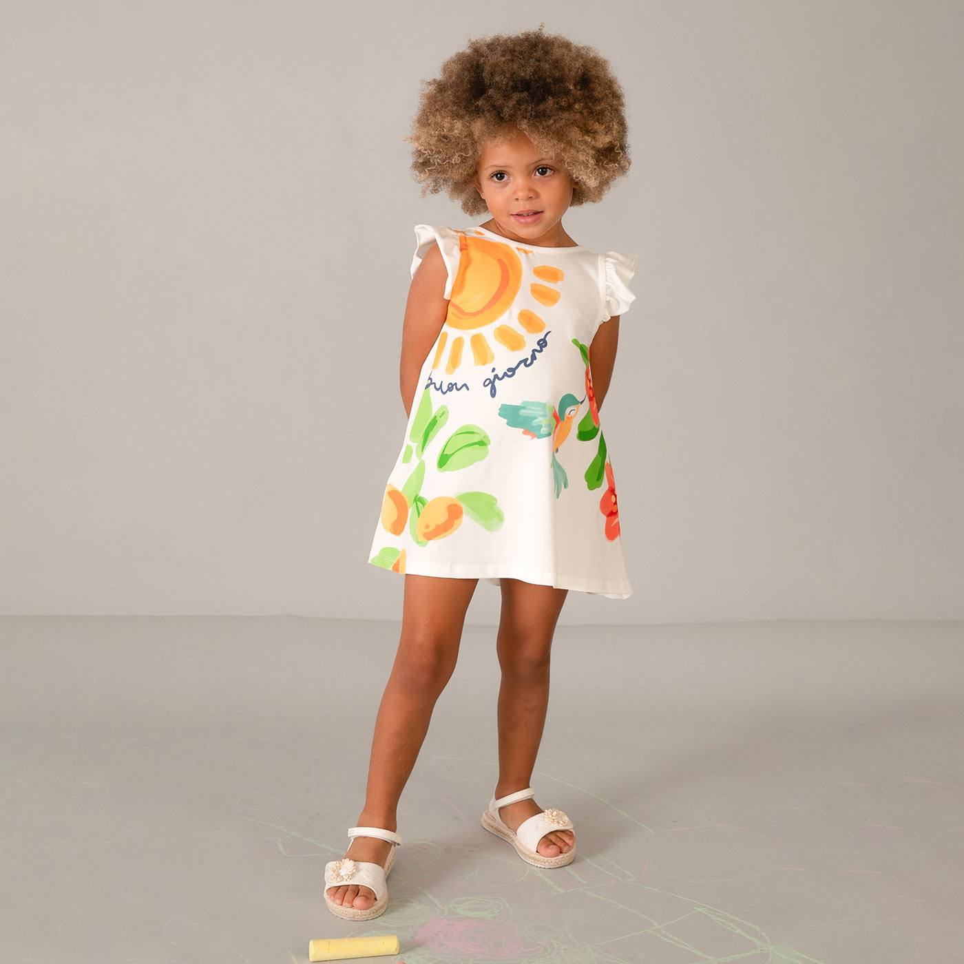 Φωτεινό, χαρούμενο και απόλυτα καλοκαιρινό, αυτό το παιδικό φόρεμα Mayoral για κορίτσια είναι ιδανικό για άνετες και στιλάτες εμφανίσεις. Κατασκευασμένο από μαλακό μακό ύφασμα σε κομψή εκρού απόχρωση, προσφέρει ευχάριστη αίσθηση στο δέρμα και ελευθερία κινήσεων όλη μέρα.Το φόρεμα ξεχωρίζει για το πολύχρωμο print με ήλιο, λουλούδια και κολιμπρί, που χαρίζει παιχνιδιάρικο χαρακτήρα και καλοκαιρινή διάθεση. Τα μικρά βολάν στα μανίκια προσθέτουν μια γλυκιά, κοριτσίστικη πινελιά, ενώ η άνετη γραμμή το καθιστά ιδανικό για καθημερινή χρήση.