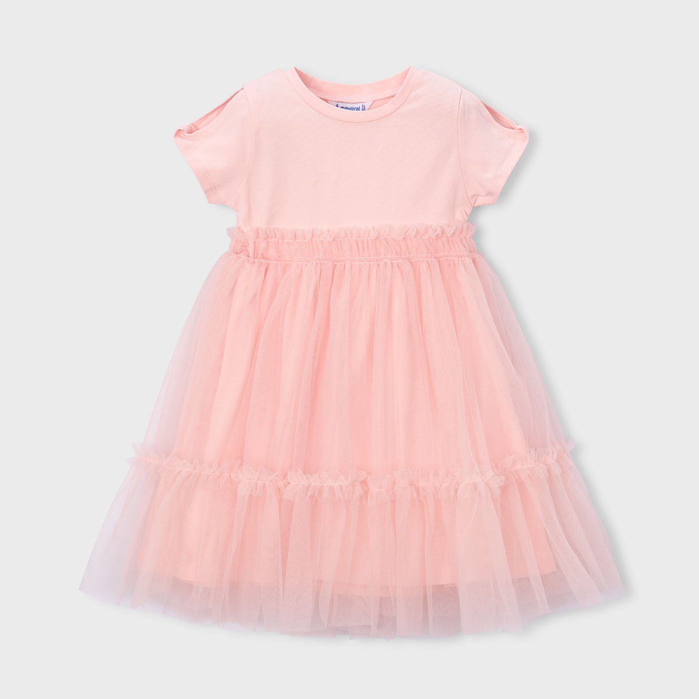 Το παιδικό φόρεμα Mayoral σε υπέροχη ροζ απαλή απόχρωση είναι η ιδανική επιλογή για κομψές και παραμυθένιες εμφανίσεις. Συνδυάζει άνεση και ρομαντικό στυλ, με μαλακό βαμβακερό επάνω μέρος και φούστα από αέρινο τούλι, δημιουργώντας ένα εντυπωσιακό αλλά ταυτόχρονα ευχάριστο στο φόρεμα αποτέλεσμα.Η ελαστική μέση με διακριτικό βολάν τονίζει απαλά τη γραμμή του φορέματος, ενώ η πολυεπίπεδη τούλινη φούστα χαρίζει όγκο και κίνηση, ιδανική για κάθε μικρή πριγκίπισσα. Τα κοντά μανίκια και η άνετη εφαρμογή το καθιστούν κατάλληλο για πολύωρη χρήση.Ιδανικό για γιορτές, γενέθλια, βαπτίσεις, σχολικές εκδηλώσεις αλλά και για ιδιαίτερες καθημερινές εμφανίσεις.