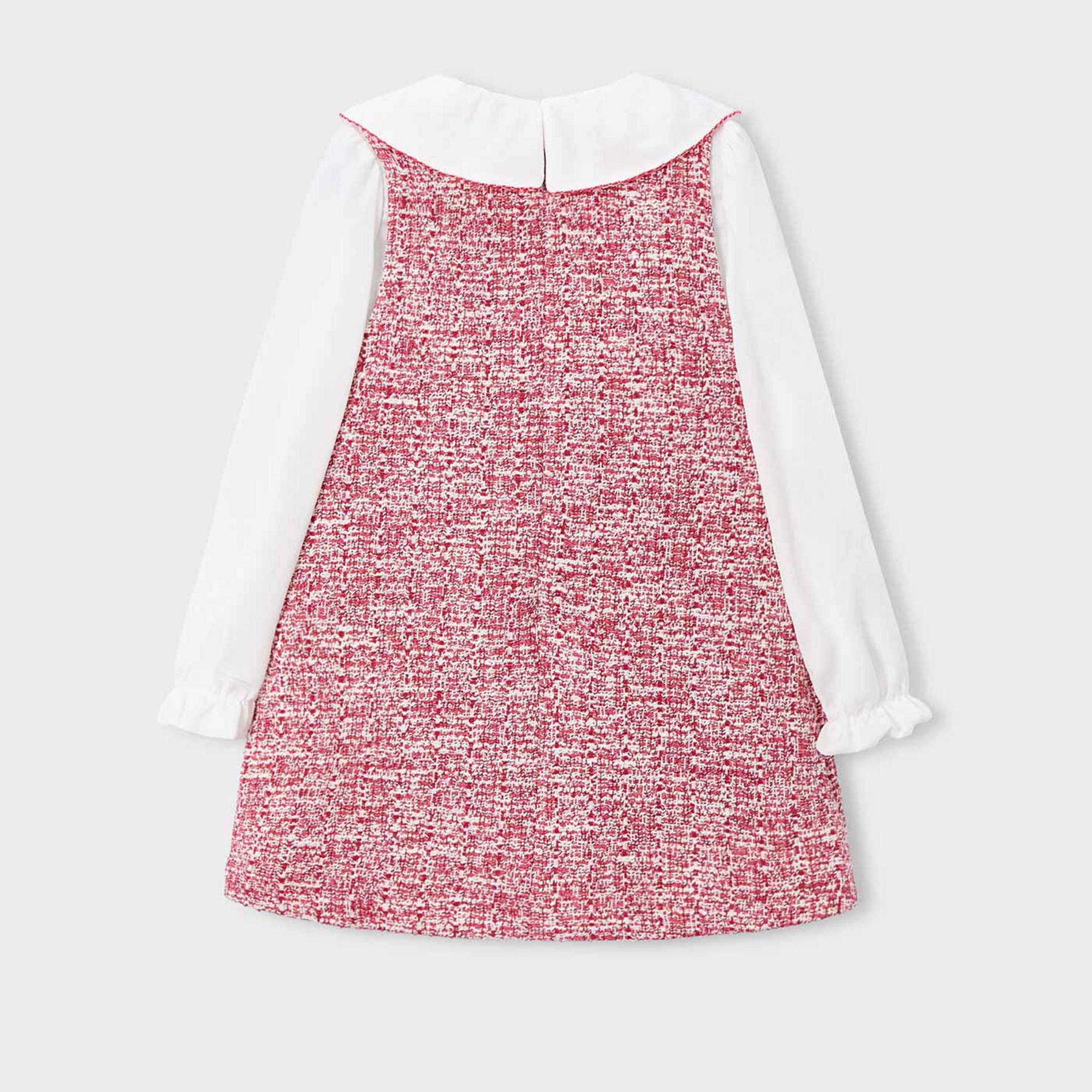 Αναδείξτε την κομψότητα και το στυλ της μικρής σας με αυτό το υπέροχο παιδικό φόρεμα Mayoral για κορίτσια, σε μοναδικό κερασί χρώμα με ρομαντικές λεπτομέρειες. Το φόρεμα συνδυάζει το tweed look στο εξωτερικό με λευκά μακριά μανίκια και μεγάλο στρογγυλό γιακαδάκι, προσφέροντας μια vintage αλλά και μοντέρνα αισθητική. Οι εντυπωσιακοί σατέν φιόγκοι στη μέση χαρίζουν ξεχωριστό χαρακτήρα και κάνουν το φόρεμα ιδανικό για ιδιαίτερες περιστάσεις, γιορτές και πάρτι.