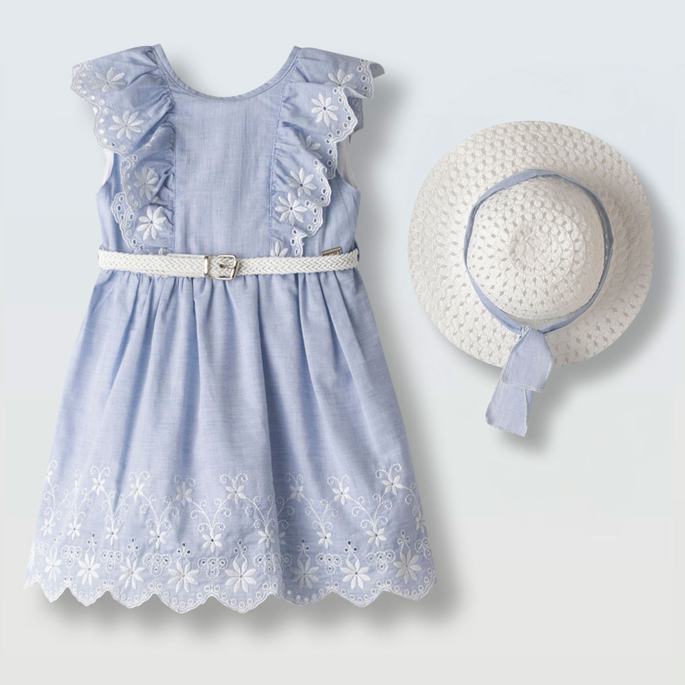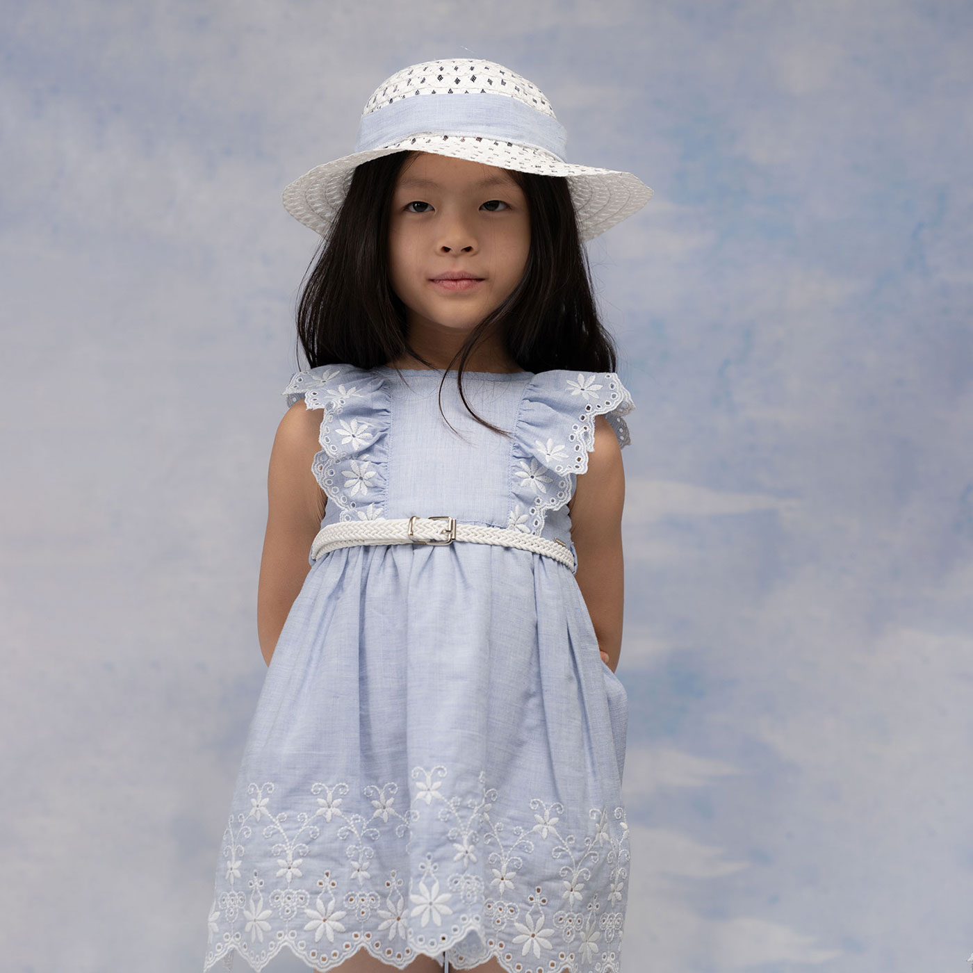 Παιδικό φόρεμα κηπούρ για κορίτσια από τη Ebita σε δροσερή σιέλ απόχρωση, ένα κομψό και καλοκαιρινό σύνολο που συνδυάζει ρομαντικό στυλ με πρακτικότητα. Το φόρεμα διαθέτει κεντητές λεπτομέρειες στο μπούστο και στο τελείωμα με floral μοτίβα, διακοσμητικά βολάν στους ώμους και πλεκτή ζώνη μέσης με αγκράφα που χαρίζει όμορφη εφαρμογή και φίνα αισθητική. Συνοδεύεται από ασορτί ψάθινο καπέλο με υφασμάτινη κορδέλα για ολοκληρωμένο summer look.Κατασκευασμένο από ελαφρύ, αναπνεύσιμο ύφασμα τύπου λινό/βαμβακερό, προσφέρει άνεση και δροσιά ακόμα και στις πιο ζεστές ημέρες. Η άνετη γραμμή επιτρέπει ελευθερία κινήσεων, καθιστώντας το ιδανικό για πολύωρη χρήση. Οι κηπούρ κεντητές λεπτομέρειες προσθέτουν διαχρονική κομψότητα και ποιοτική αίσθηση στο ρούχο.Ιδανική επιλογή για βαπτίσεις, γιορτές, διακοπές και καλοκαιρινές βόλτες, συνδυάζεται υπέροχα με πέδιλα ή μπαλαρίνες. Ένα φόρεμα που ενώνει άνεση, ποιότητα και κοριτσίστικη φινέτσα, καλύπτοντας κάθε ιδιαίτερη περίσταση.