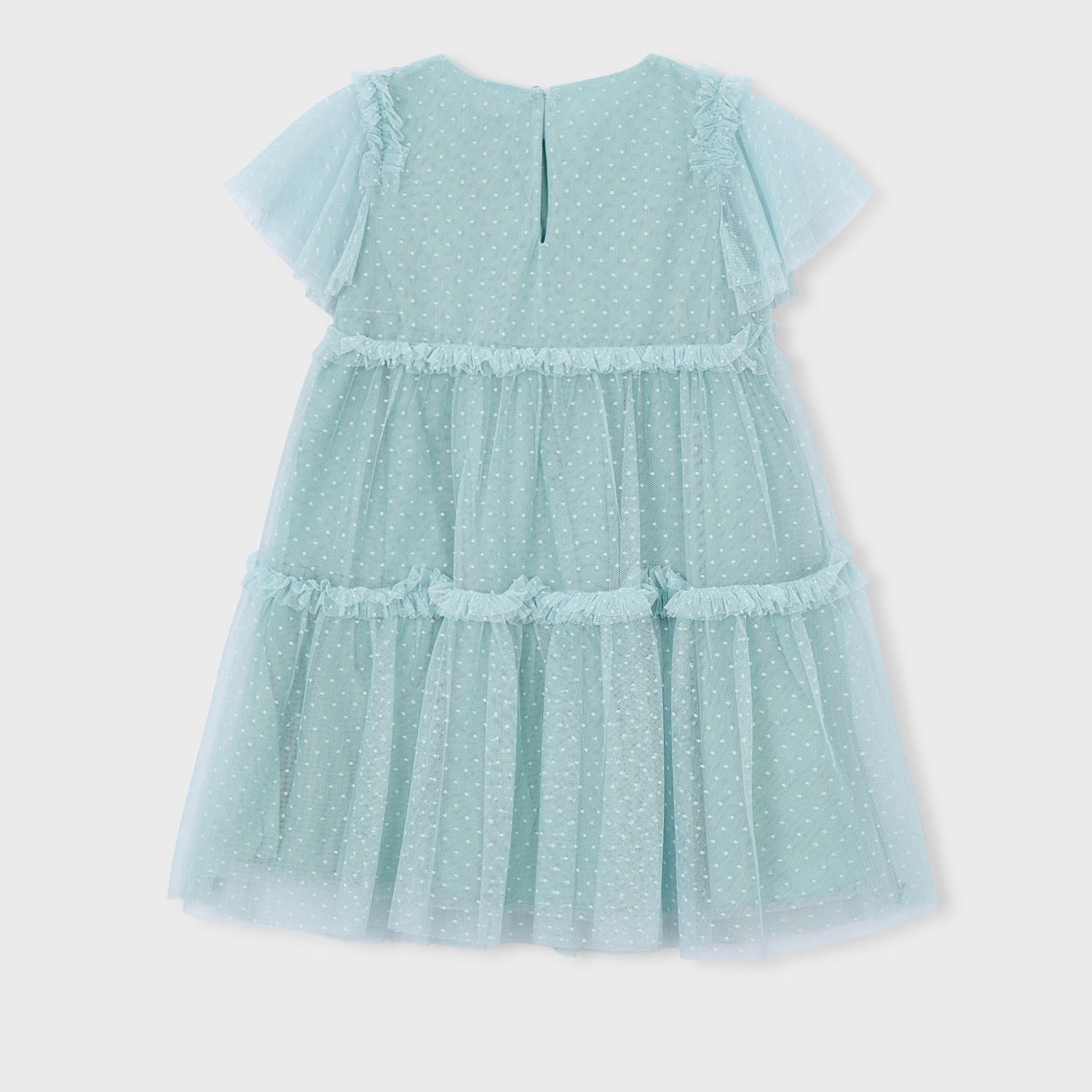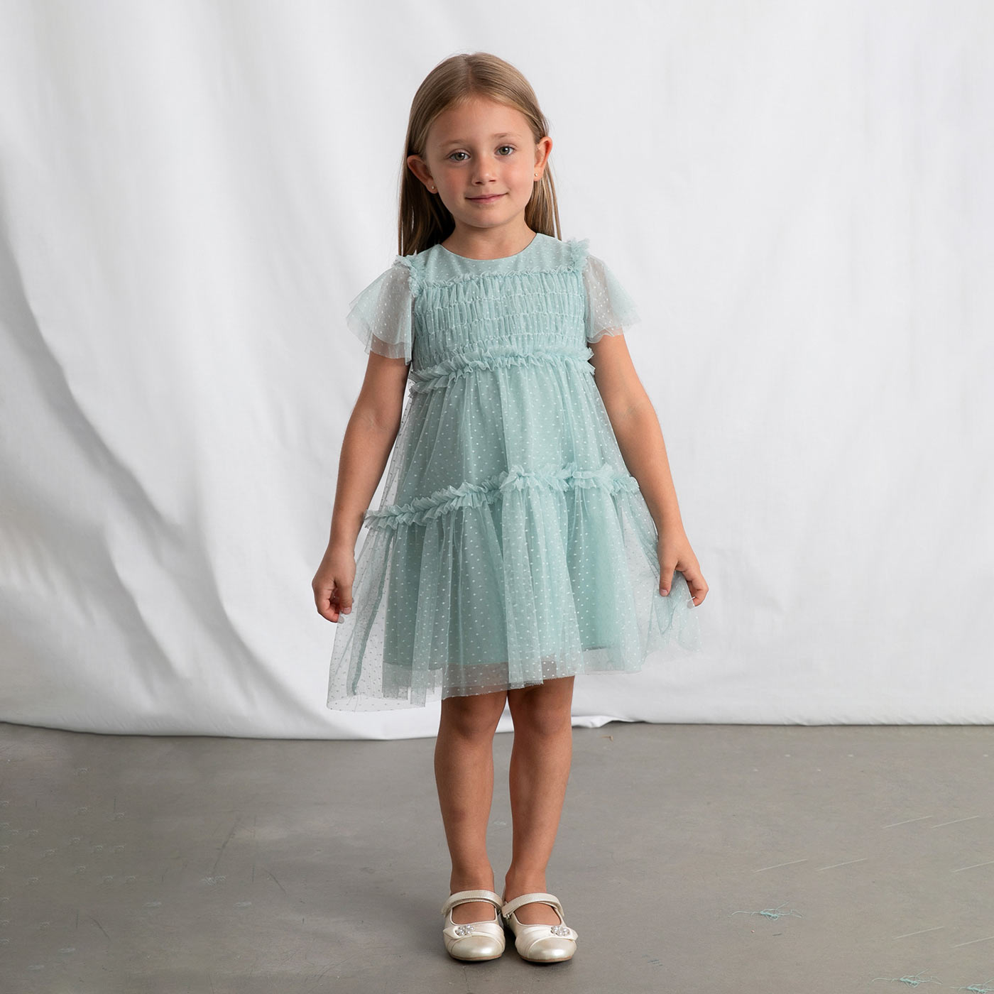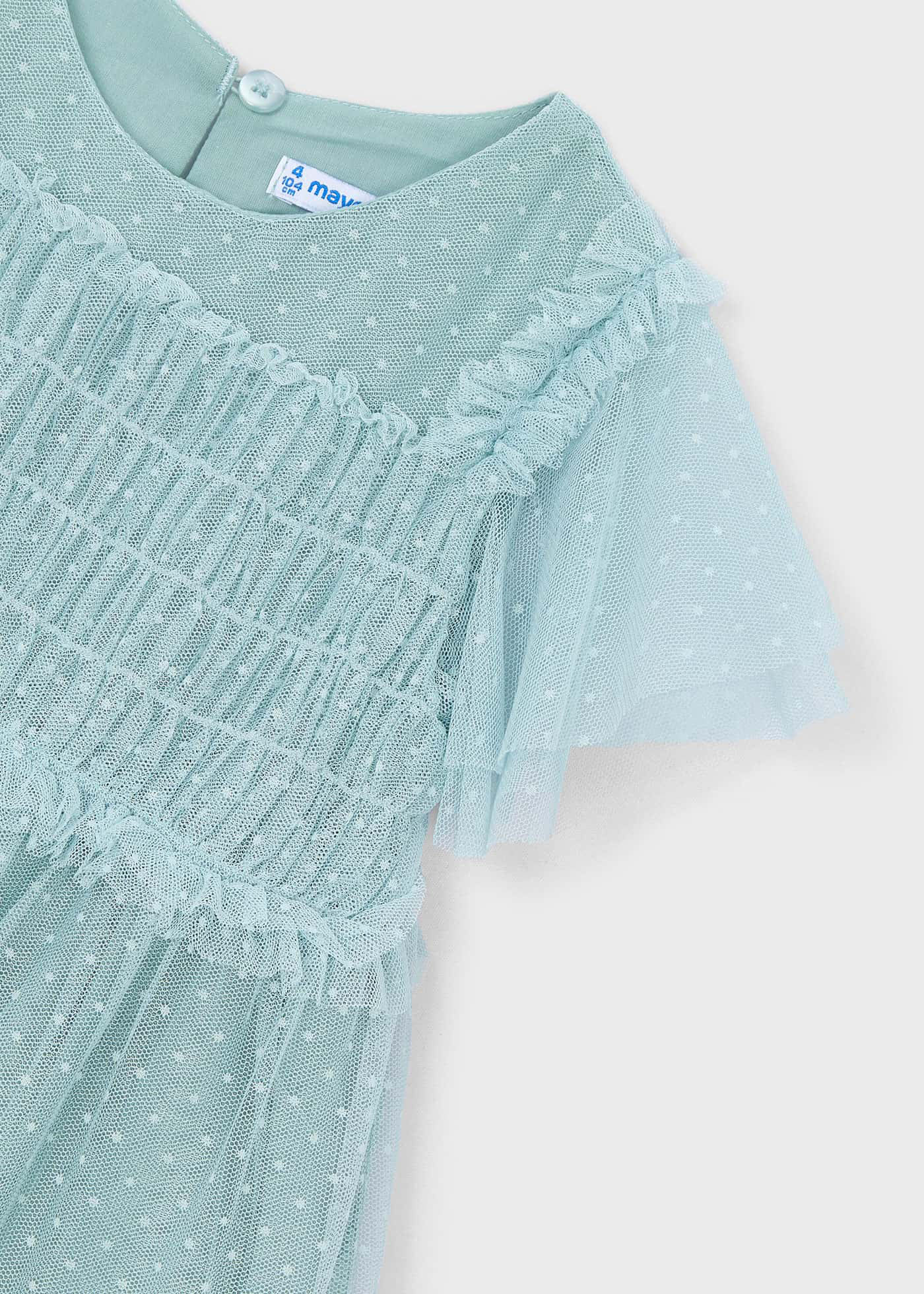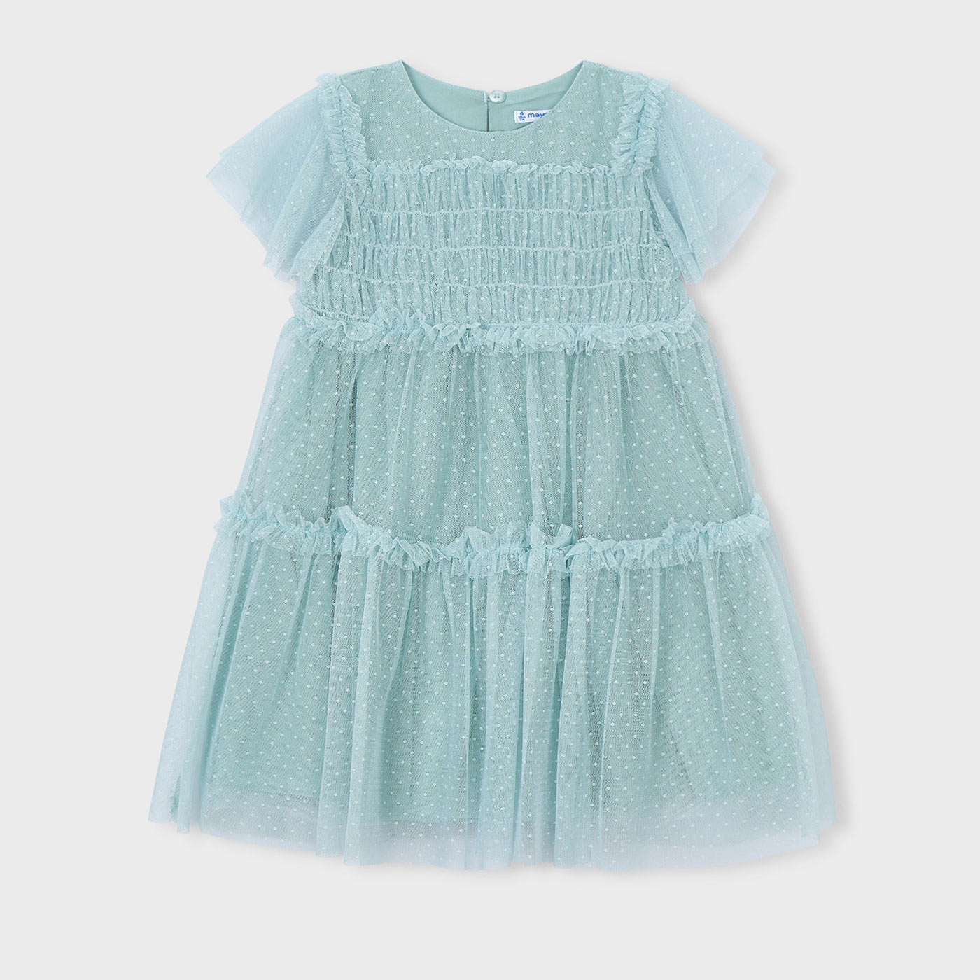 Το παιδικό φόρεμα Mayoral σε υπέροχη απόχρωση μέντα είναι η ιδανική επιλογή για κορίτσια που αγαπούν τις ρομαντικές και κομψές εμφανίσεις. Κατασκευασμένο από απαλό τούλι με διακριτικό πουά σχέδιο, χαρίζει αέρινη κίνηση και ξεχωριστό στυλ, ιδανικό για ξεχωριστές στιγμές.Το επάνω μέρος διαθέτει σφηκοφωλιά (smock) που αγκαλιάζει άνετα το σώμα, προσφέροντας τέλεια εφαρμογή, ενώ τα κοντά μανίκια από διαφανές τούλι προσθέτουν μια φίνα, παραμυθένια πινελιά. Η φούστα σε επίπεδα (layers) με διακοσμητικά βολάν χαρίζει όγκο και κίνηση, κάνοντας το φόρεμα ιδανικό για περιστροφές και παιχνίδι.