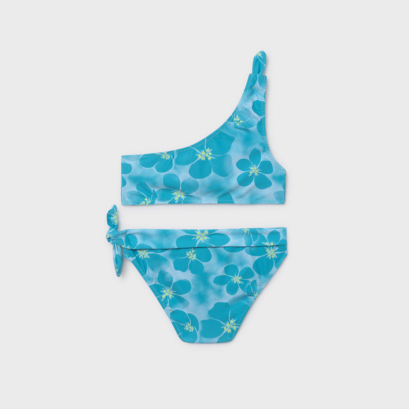 Το μπικίνι ξεχωρίζει για το ζωντανό φλοράλ σχέδιο σε αποχρώσεις του πετρόλ και του τιρκουάζ, που αποπνέει καλοκαιρινή διάθεση. Το τοπ διαθέτει μοντέρνο one-shoulder σχέδιο με διακοσμητικό φιόγκο στον ώμο, προσθέτοντας κομψή και παιχνιδιάρικη πινελιά.Το σλιπ είναι άνετο και σταθερό, με πλαϊνό φιόγκο που ολοκληρώνει το σύνολο με χαριτωμένη λεπτομέρεια. Το ύφασμα είναι ελαστικό, απαλό και γρήγορο στο στέγνωμα, προσφέροντας άνεση και ελευθερία κινήσεων.Η ποιότητα της Mayoral διασφαλίζει αντοχή στο νερό, τον ήλιο και τη συχνή χρήση.