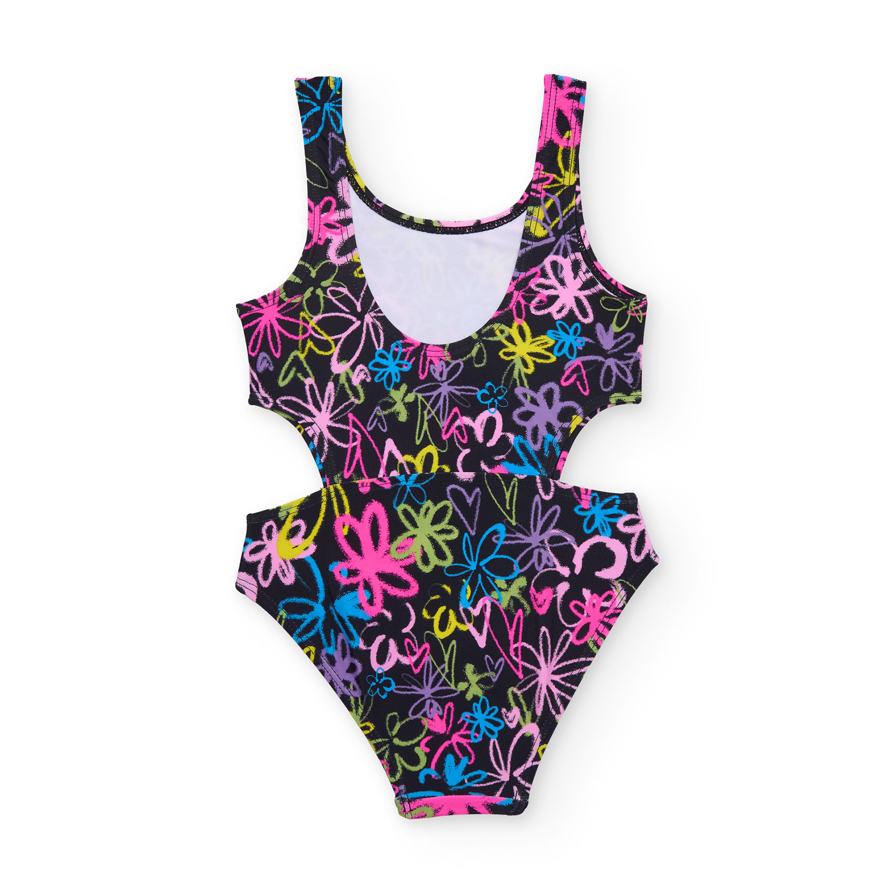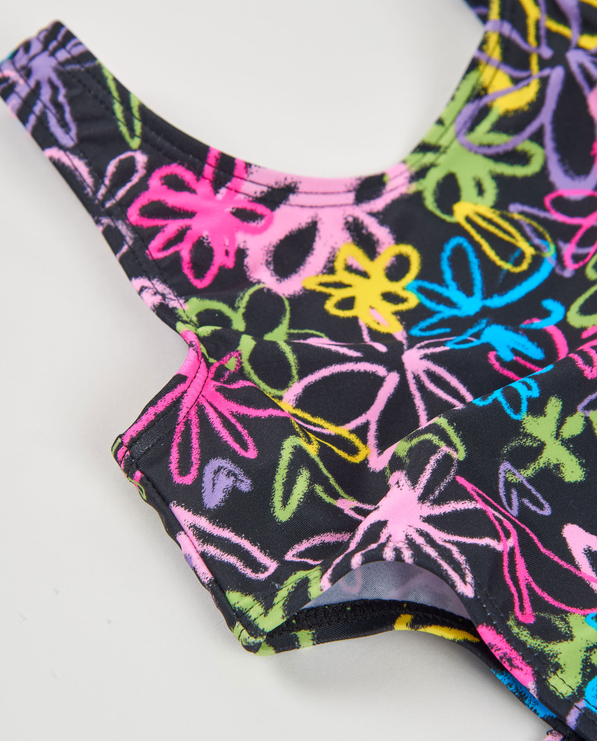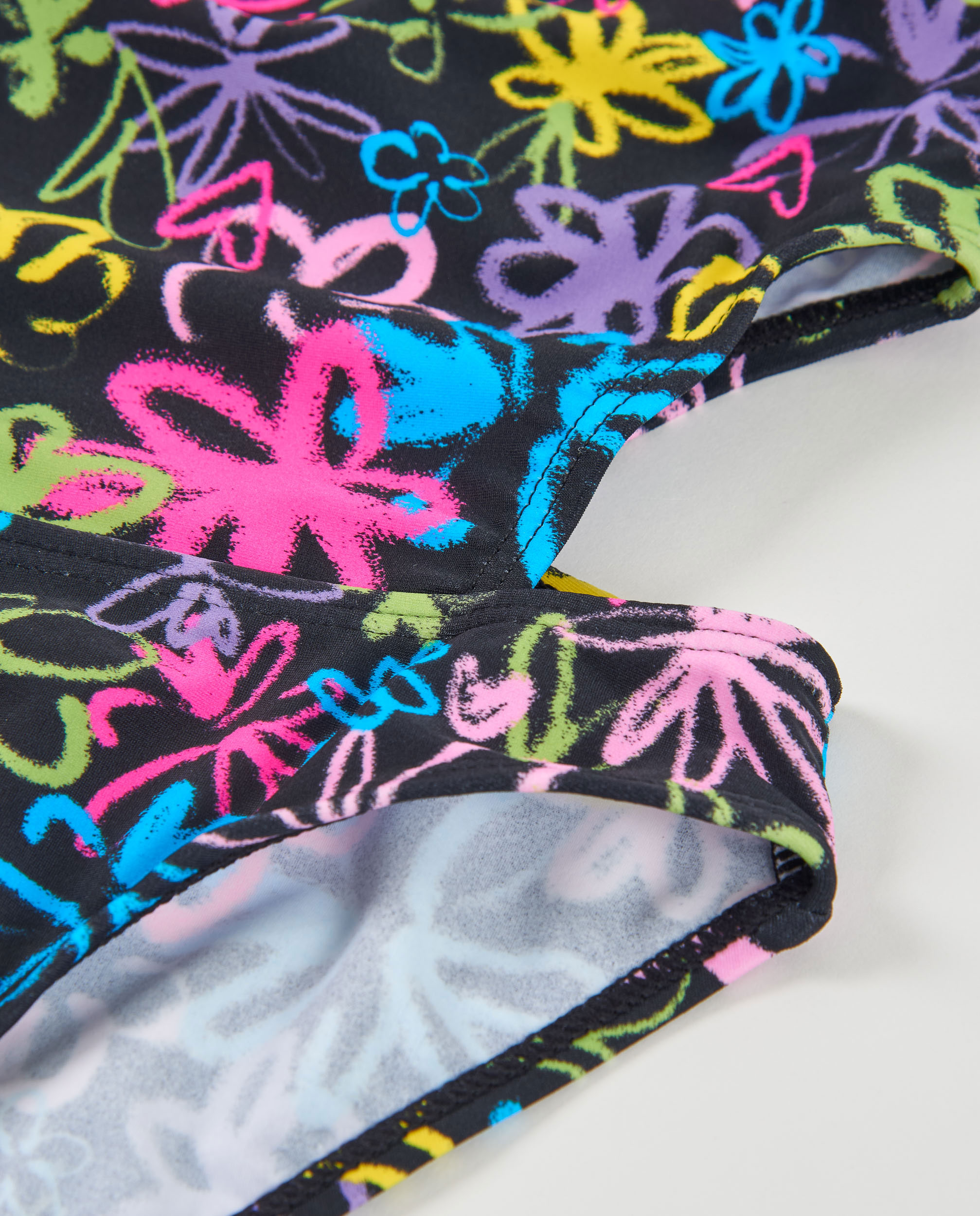 Το παιδικό ολόσωμο μαγιό για κορίτσια Nathkids σε μαύρη βάση με εντυπωσιακό πολύχρωμο floral print αποτελεί μια μοντέρνα και ιδιαίτερα προσεγμένη καλοκαιρινή επιλογή που συνδυάζει στυλ και άνεση. Το έντονο μοτίβο με λουλούδια σε ζωηρές αποχρώσεις ροζ, κίτρινου, μπλε και πράσινου δημιουργεί δυναμική αντίθεση πάνω στο μαύρο φόντο, χαρίζοντας ένα παιχνιδιάρικο αλλά ταυτόχρονα fashion αποτέλεσμα. Διαθέτει σταθερές φαρδιές τιράντες και στρογγυλή λαιμόκοψη για σωστή εφαρμογή και άνετη κίνηση, ενώ η διακριτική cut-out λεπτομέρεια στα πλαϊνά της μέσης προσθέτει σύγχρονο χαρακτήρα χωρίς να μειώνει τη σταθερότητα του ολόσωμου σχεδίου. Το ελαστικό, μαλακό ύφασμα αγκαλιάζει απαλά το σώμα, στεγνώνει γρήγορα και είναι ανθεκτικό σε χλώριο και αλάτι, διατηρώντας τα χρώματα ζωντανά ακόμη και μετά από συχνή χρήση. Ιδανικό για παραλία, πισίνα και καλοκαιρινές διακοπές, προσφέρει ασφάλεια, ελευθερία κινήσεων και εντυπωσιακή εμφάνιση σε κάθε μικρή fashionista.