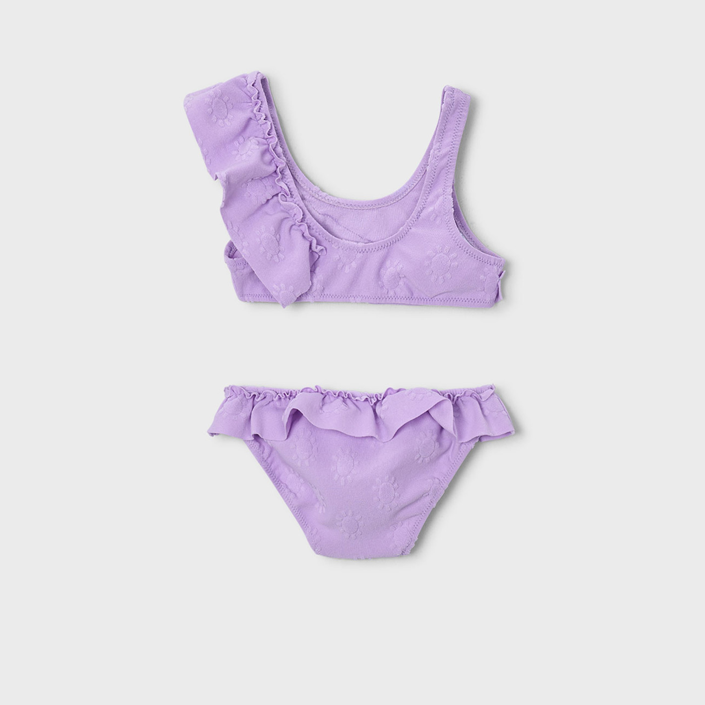 Εντυπωσιακό παιδικό μπικίνι Mayoral σε ζωηρή λιλά απόχρωση, ιδανικό για τις καλοκαιρινές εξορμήσεις στη θάλασσα και την πισίνα. Το σετ ξεχωρίζει για τα ρομαντικά βολάν και την ασύμμετρη τιράντα στον ώμο που χαρίζουν στιλ και παιχνιδιάρικη διάθεση.Το απαλό, ελαστικό ύφασμα προσφέρει άνετη εφαρμογή και ελευθερία κινήσεων, ενώ στεγνώνει γρήγορα για πρακτική χρήση όλη μέρα.