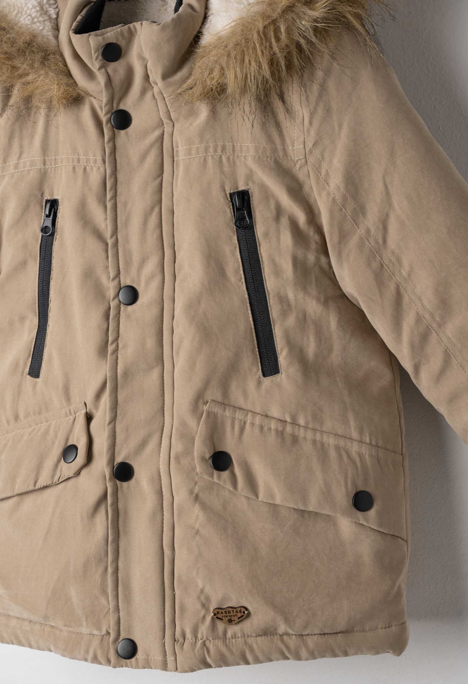 Το παιδικό μπουφάν για κορίτσια Hashtag σε μπεζ χρώμα συνδυάζει πρακτικότητα, στυλ και άνεση για τις κρύες ημέρες του χειμώνα. Κατασκευασμένο από ανθεκτικό ύφασμα υψηλής ποιότητας, προσφέρει ιδανική προστασία από το κρύο και τον αέρα, ενώ η εσωτερική επένδυση με απαλή γούνα εξασφαλίζει ζεστασιά όλη μέρα.