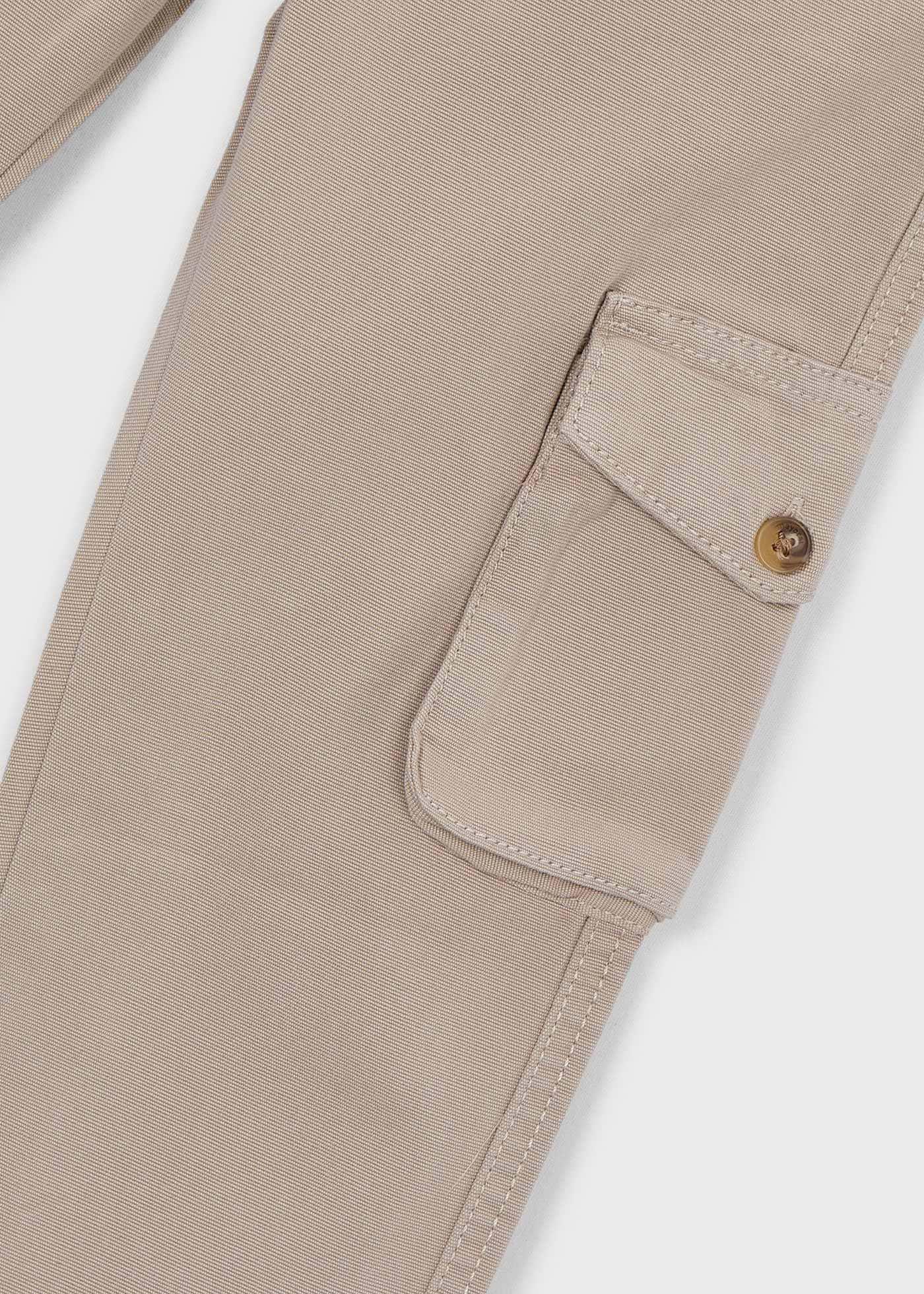 Το παιδικό παντελόνι Mayoral για αγόρια σε μπεζ απόχρωση αποτελεί μια κομψή και πρακτική επιλογή για καθημερινές αλλά και πιο προσεγμένες εμφανίσεις. Με cargo σχεδιασμό και ουδέτερο χρώμα, συνδυάζει άνεση, λειτουργικότητα και μοντέρνο στυλ, καλύπτοντας κάθε ανάγκη του παιδιού.Κατασκευασμένο από ποιοτικό και ανθεκτικό βαμβακερό ύφασμα, προσφέρει ευχάριστη αίσθηση στο δέρμα και ελευθερία κινήσεων. Διαθέτει πλαϊνές cargo τσέπες με καπάκι, καθώς και μπροστινές και πίσω τσέπες, προσθέτοντας πρακτικότητα και casual χαρακτήρα. Η κλασική γραμμή και το άνετο κόψιμο το καθιστούν ιδανικό για καθημερινή χρήση, σχολείο ή βόλτες.