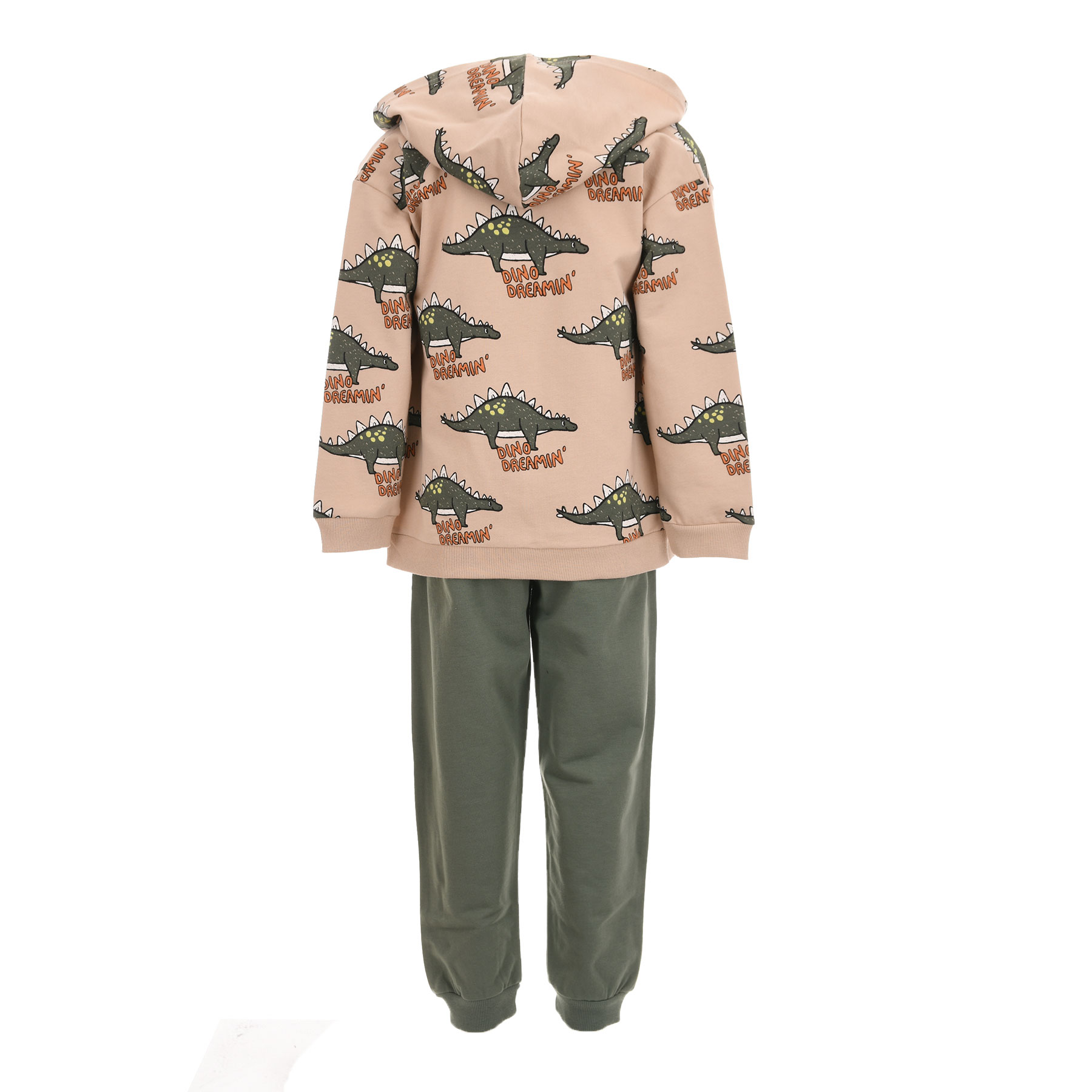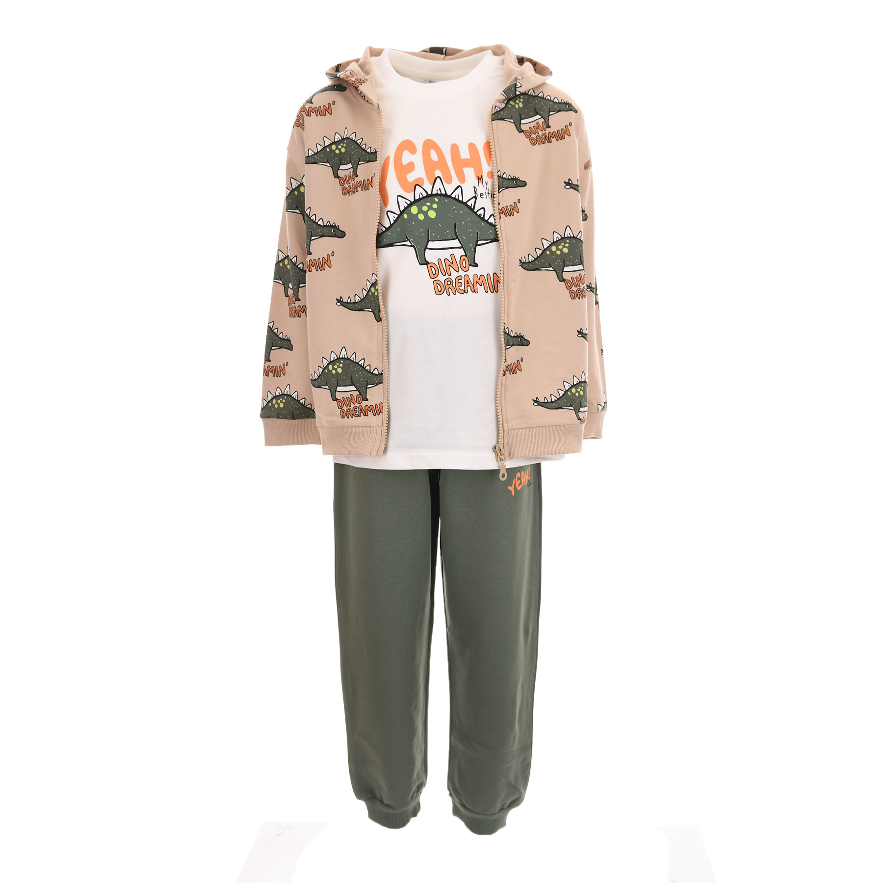 Παιδικό σετ Dino για αγόρια Trax 3 τεμαχίων σε μπεζ-πράσινο συνδυασμό, ιδανικό για μικρούς εξερευνητές που λατρεύουν τους δεινόσαυρους. Το σετ περιλαμβάνει μπεζ ζακέτα με κουκούλα και φερμουάρ, διακοσμημένη με all-over τύπωμα δεινόσαυρους, εκρού κοντομάνικο μπλουζάκι με εντυπωσιακό σχέδιο Dino Dreamin στο μπροστινό μέρος και πράσινο παντελόνι φόρμας με λάστιχο στη μέση και στα μπατζάκια για άνετη και σταθερή εφαρμογή. Κατασκευασμένο από απαλό βαμβακερό ύφασμα, προσφέρει άνεση, ευκολία κινήσεων και ευχάριστη αίσθηση καθ όλη τη διάρκεια της ημέρας, ιδανικό για σχολείο, βόλτες και παιχνίδι. Ο πρακτικός σχεδιασμός των 3 τεμαχίων επιτρέπει πολλαπλούς συνδυασμούς, δημιουργώντας διαφορετικά looks με ένα μόνο σετ. Ένα μοντέρνο και ποιοτικό παιδικό σετ Trax που συνδυάζει λειτουργικότητα, άνεση και παιχνιδιάρικο design με θέμα τους δεινόσαυρους.