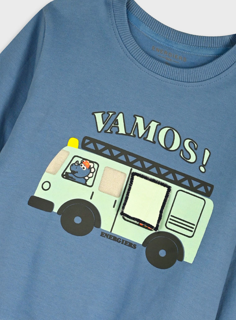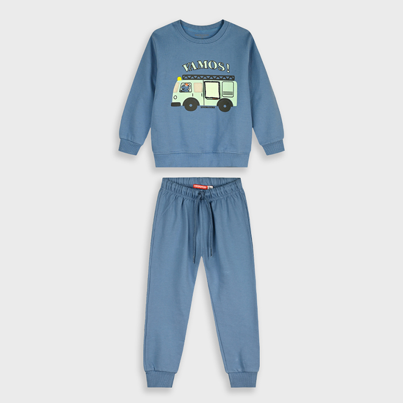 Παιδικό σετ φόρμας για αγόρια από την Energiers σε μοντέρνα μπλε απόχρωση, ιδανικό για άνετες και στιλάτες εμφανίσεις όλη μέρα. Το σετ αποτελείται από μπλούζα φούτερ και παντελόνι φόρμας, προσφέροντας ελευθερία κινήσεων και άνεση στο σχολείο, τη βόλτα ή το παιχνίδι.Η μπλούζα διαθέτει στρογγυλή λαιμόκοψη και εντυπωσιακό τύπωμα στο μπροστινό μέρος με χαρούμενο σχέδιο οχήματος και τη λέξη VAMOS!, που χαρίζει παιχνιδιάρικο χαρακτήρα. Τα μανίκια και το τελείωμα έχουν ελαστικές μανσέτες για καλύτερη εφαρμογή και προστασία από το κρύο.Το παντελόνι φόρμας έχει λάστιχο στη μέση με ρυθμιζόμενο κορδόνι για σταθερό και άνετο κράτημα, ενώ τα ελαστικά τελειώματα στους αστραγάλους προσφέρουν πρακτικότητα και μοντέρνο look.Κατασκευασμένο από μαλακό βαμβακερό ύφασμα χωρίς χνούδι (αχνούδιαστο), το σετ είναι ιδανικό για μεταβατικές εποχές όπως άνοιξη και φθινόπωρο, αλλά και για καθημερινή χρήση στο σπίτι ή στις δραστηριότητες.