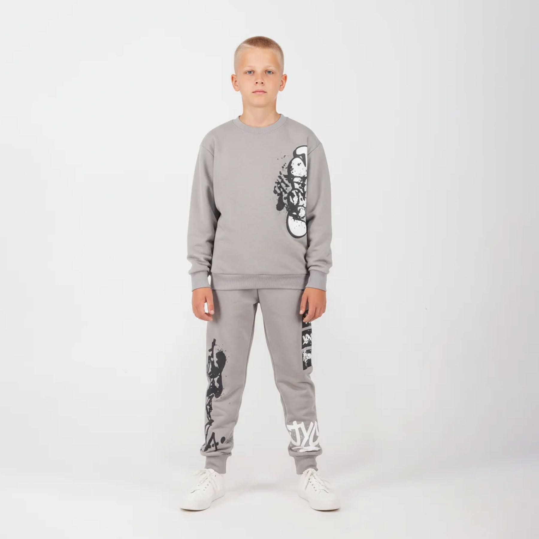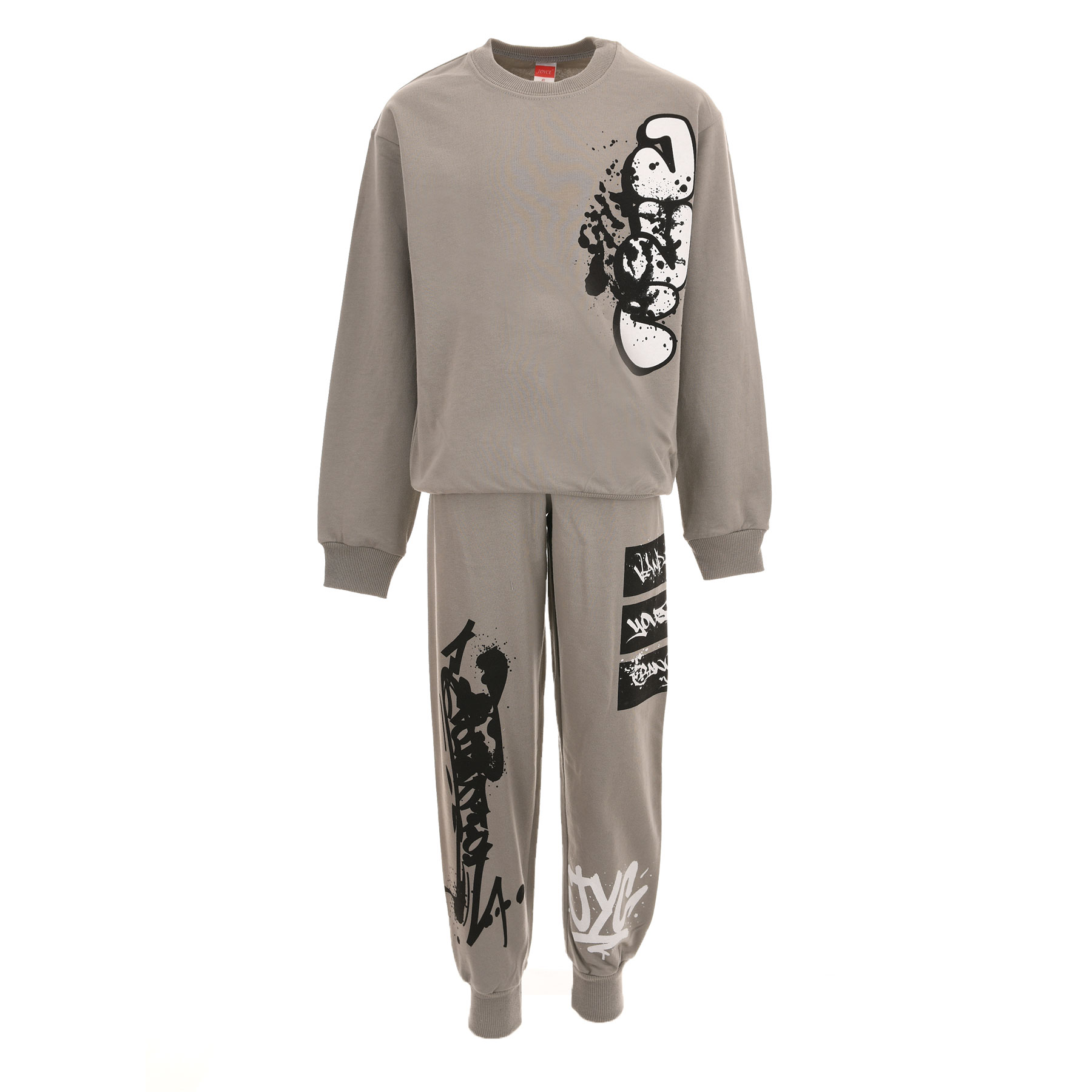 Μοντέρνο παιδικό σετ φόρμας Joyce σε γκρι απόχρωση, ιδανικό για αγόρια που θέλουν άνεση αλλά και στυλ στις καθημερινές τους εμφανίσεις. Το σετ περιλαμβάνει φούτερ και παντελόνι φόρμας με urban graphic prints, δημιουργώντας ένα δυναμικό streetwear look που ξεχωρίζει.Η αχνούδιαστη εσωτερική επένδυση προσφέρει ζεστασιά και απαλότητα, καθιστώντας το τέλειο για σχολείο, βόλτες και δραστηριότητες.