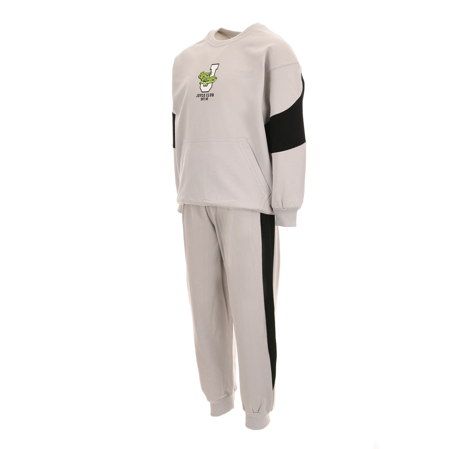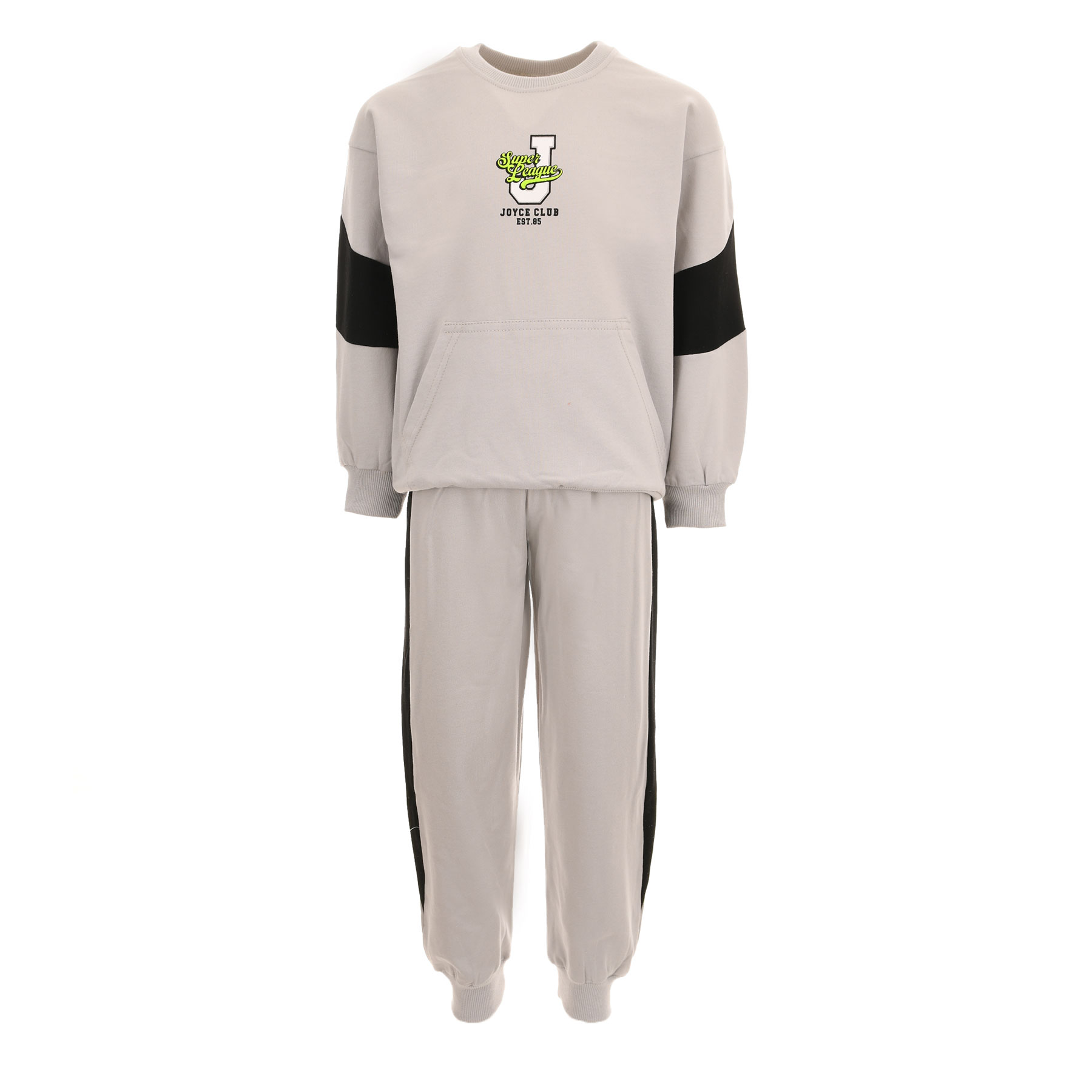 ʼνεση, στυλ και πρακτικότητα σε ένα ολοκληρωμένο παιδικό σετ φόρμας Joyce! Το αγορίστικο σετ σε μοντέρνα γκρι απόχρωση είναι ιδανικό για καθημερινή χρήση στο σχολείο, στις δραστηριότητες ή στη βόλτα.Το φούτερ διαθέτει διακριτικό τύπωμα στο στήθος και μοντέρνες χρωματικές αντιθέσεις στα μανίκια, προσφέροντας sporty look. Η μπροστινή τσέπη τύπου kangaroo χαρίζει πρακτικότητα, ενώ τα λάστιχα σε μανίκια και τελείωμα εξασφαλίζουν σταθερή εφαρμογή.Το παντελόνι φόρμας με ελαστική μέση και μπατζάκια με ριμπ τελείωμα προσφέρει ελευθερία κινήσεων και άνεση όλη μέρα.Αχνούδιαστο εσωτερικά, αποτελεί ιδανική επιλογή για φθινόπωρο και άνοιξη.