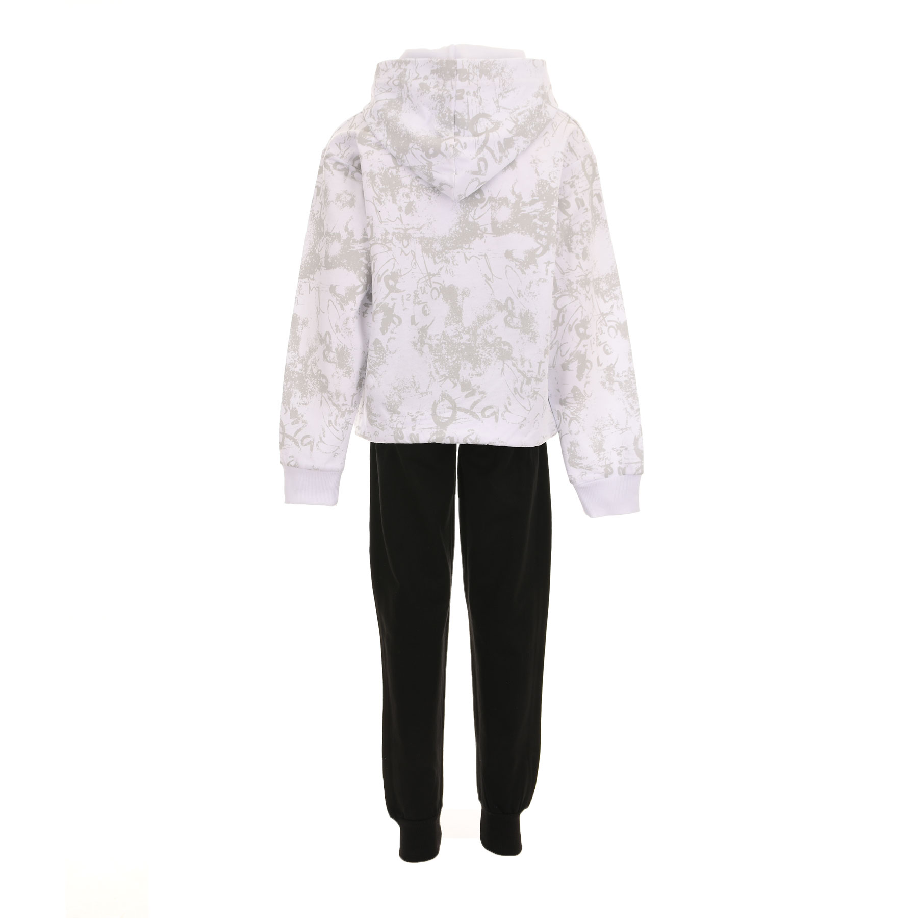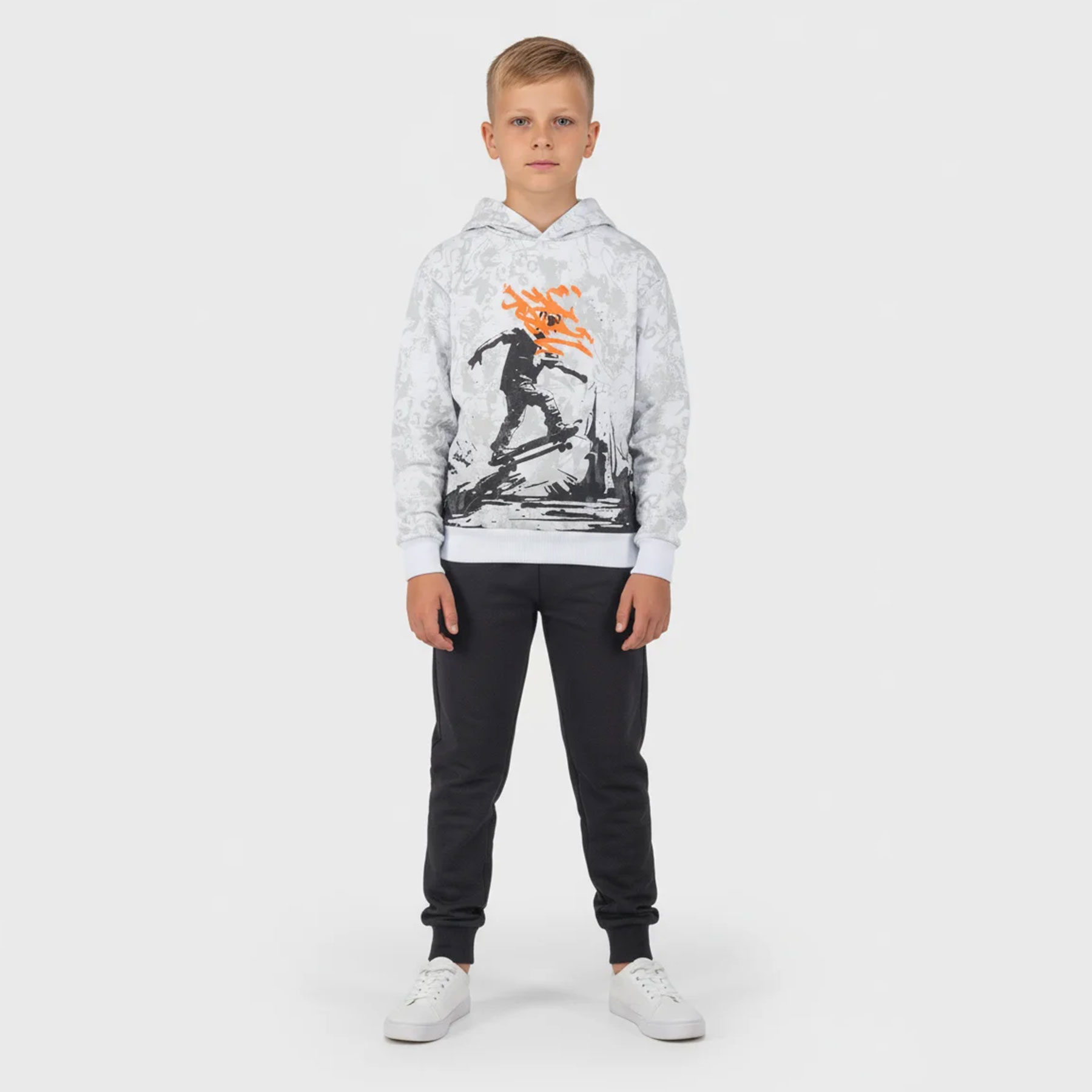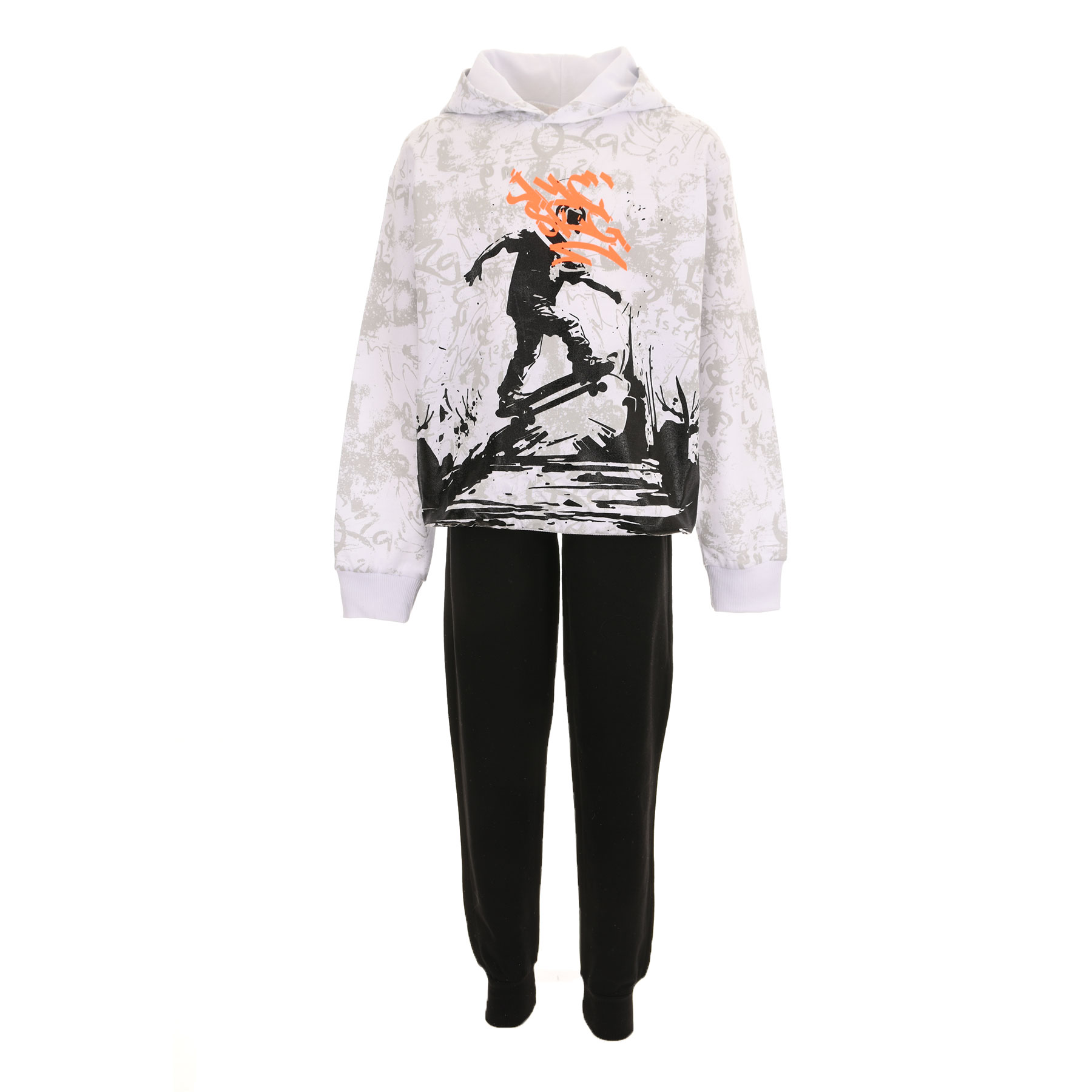Μοντέρνο και δυναμικό σετ φόρμας Joyce για αγόρια που αγαπούν το street style. Το σετ περιλαμβάνει λευκό αχνούδιαστο μπλουζάκι με κουκούλα και εντυπωσιακή στάμπα skater, σε συνδυασμό με μαύρο παντελόνι φόρμας για πρακτικότητα και άνεση στην καθημερινότητα.Ιδανική επιλογή για δραστήρια παιδιά που θέλουν cool εμφάνιση στο σχολείο, στη βόλτα ή στο παιχνίδι.