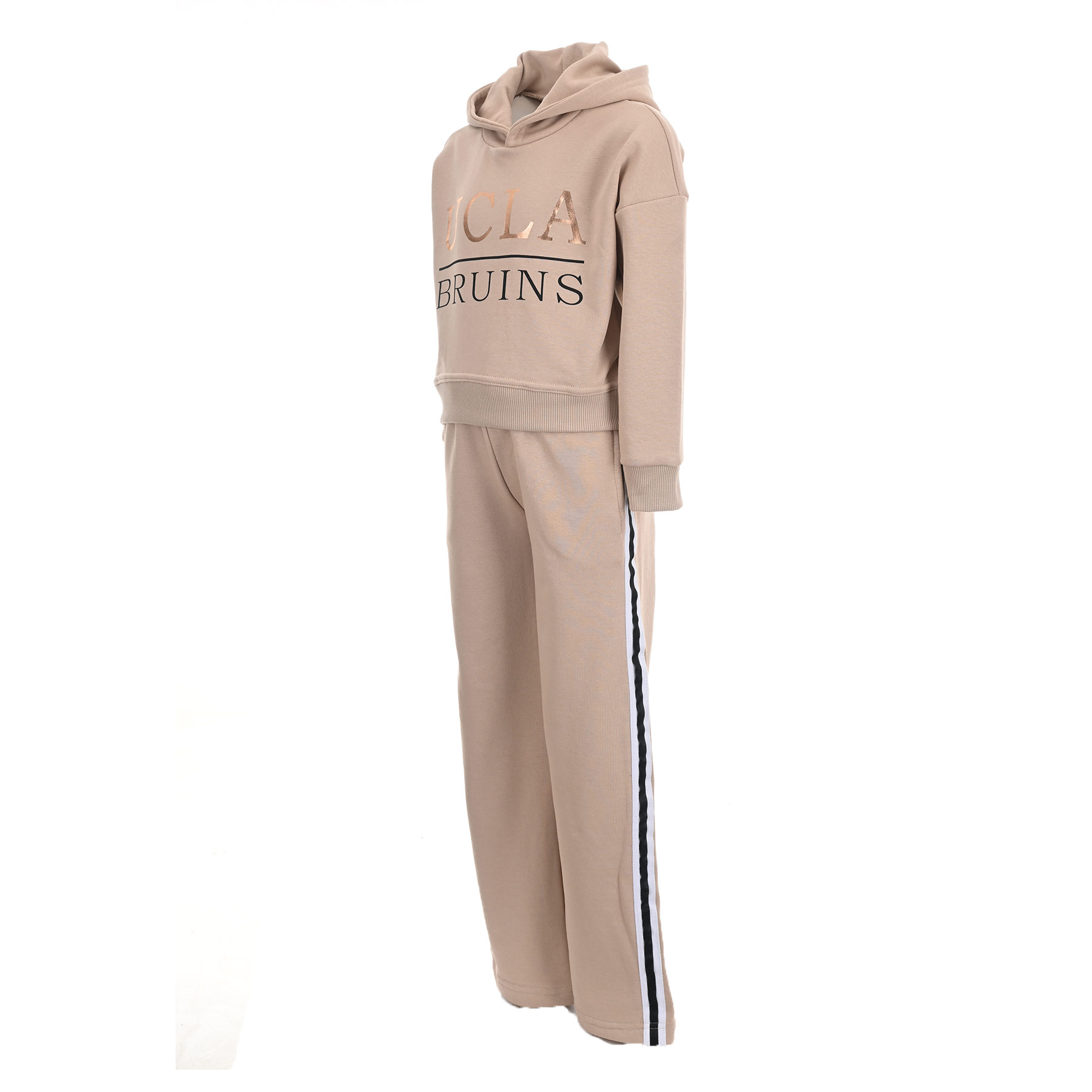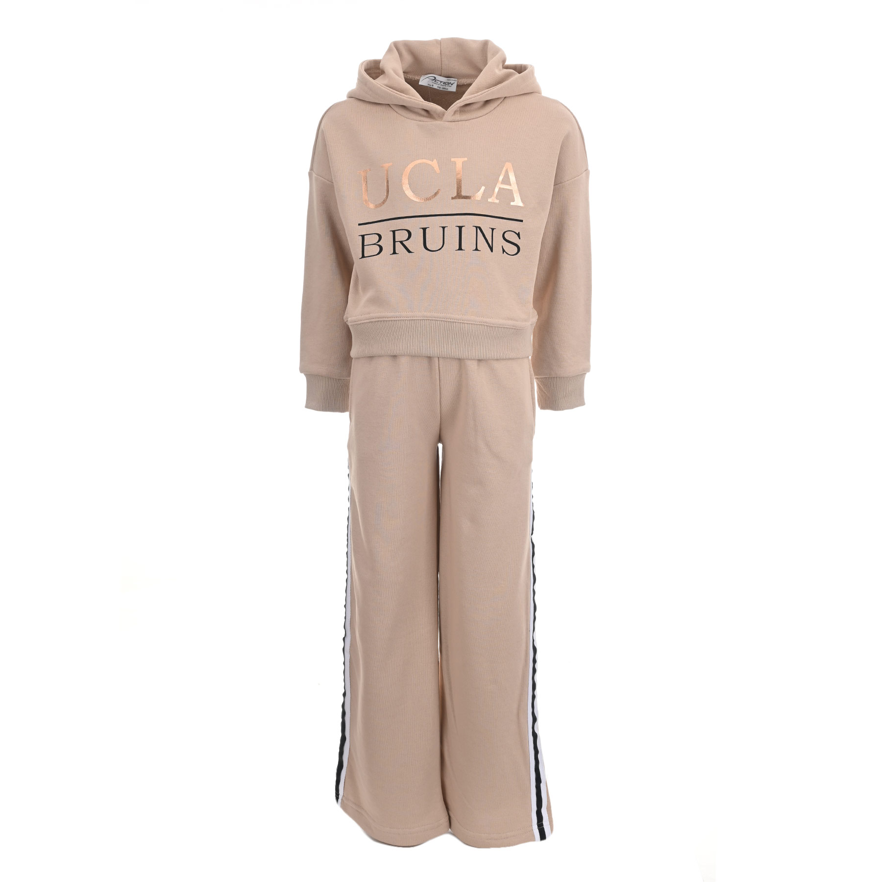 Ανανεώστε το στυλ της μικρής σας με αυτό το άνετο και κομψό παιδικό σετ φόρμα για κορίτσια Action Sportswear σε μπεζ απόχρωση. Το σετ περιλαμβάνει μπλούζα φούτερ με κουκούλα και μοντέρνα στάμπα "UCLA Bruins" καθώς και παντελόνι σε ίσια γραμμή με πλαϊνές ρίγες σε λευκό και μαύρο χρώμα. Η αχνούδιαστη υφή στο εσωτερικό προσφέρει απαλότητα και ζεστασιά, ιδανική για το σχολείο, τις βόλτες ή τις καθημερινές δραστηριότητες.