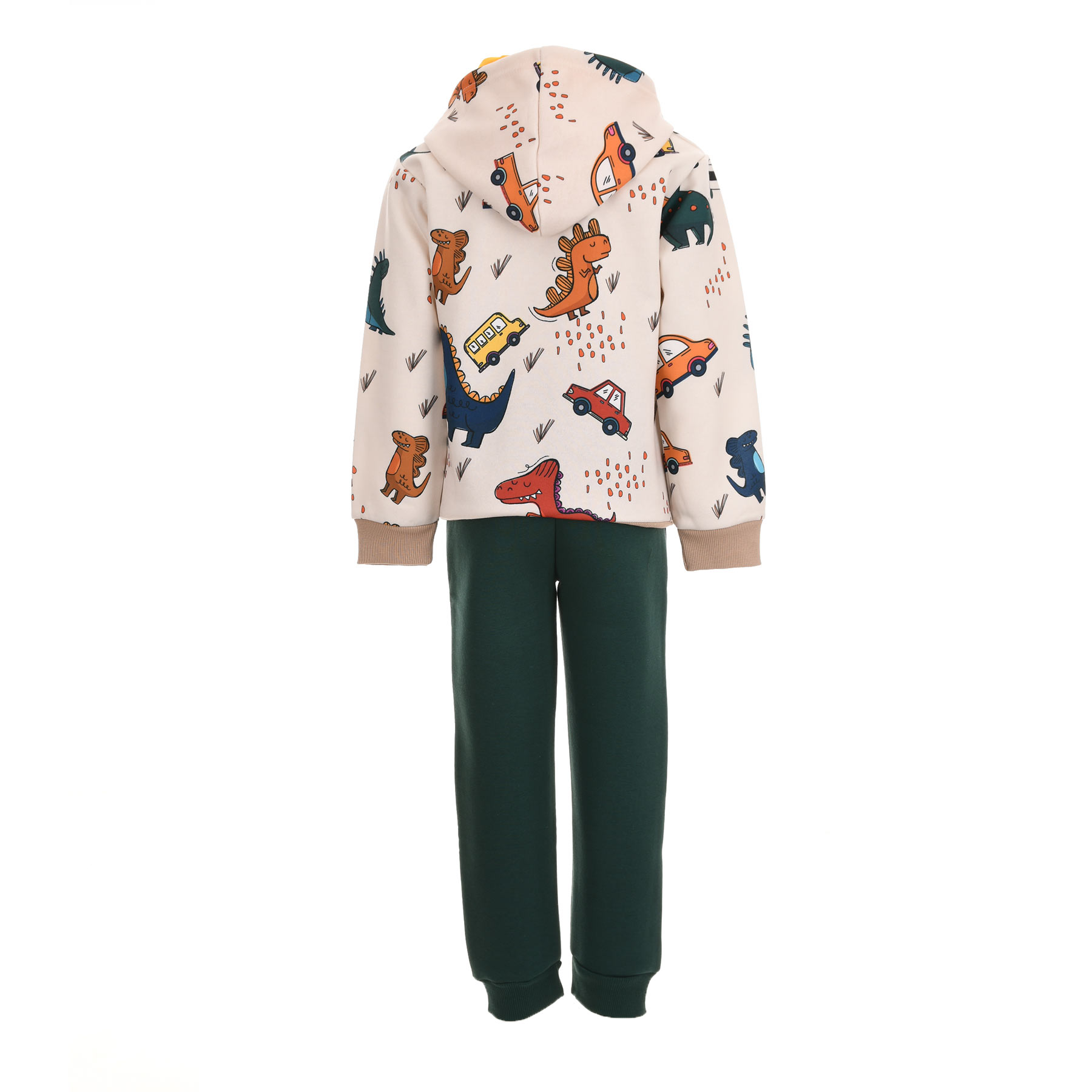 Η μπλούζα διαθέτει εντυπωσιακό μοτίβο με δεινόσαυρους, κουκούλα με εσωτερική επένδυση σε ζεστή κίτρινη απόχρωση, μπροστινή τσέπη τύπου καγκουρό και ριμπ τελειώματα στα μανίκια και τη μέση. Το παντελόνι σε πράσινο σκούρο χρώμα διαθέτει ελαστική μέση και λάστιχα στους αστραγάλους, εξασφαλίζοντας άνετη και σταθερή εφαρμογή.