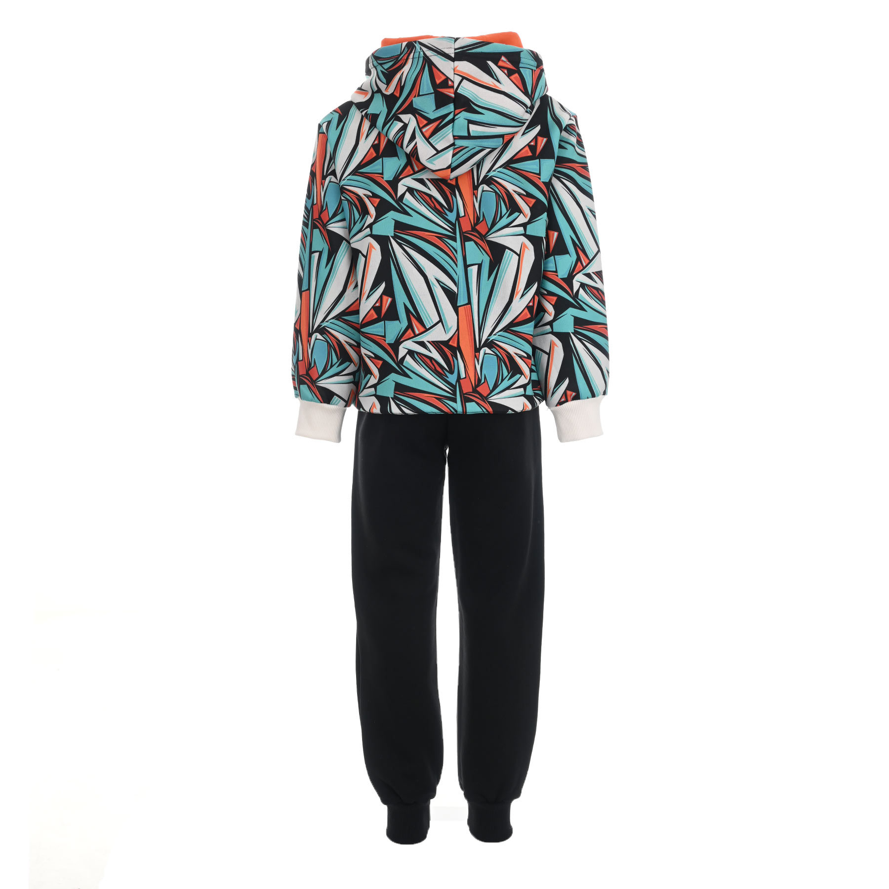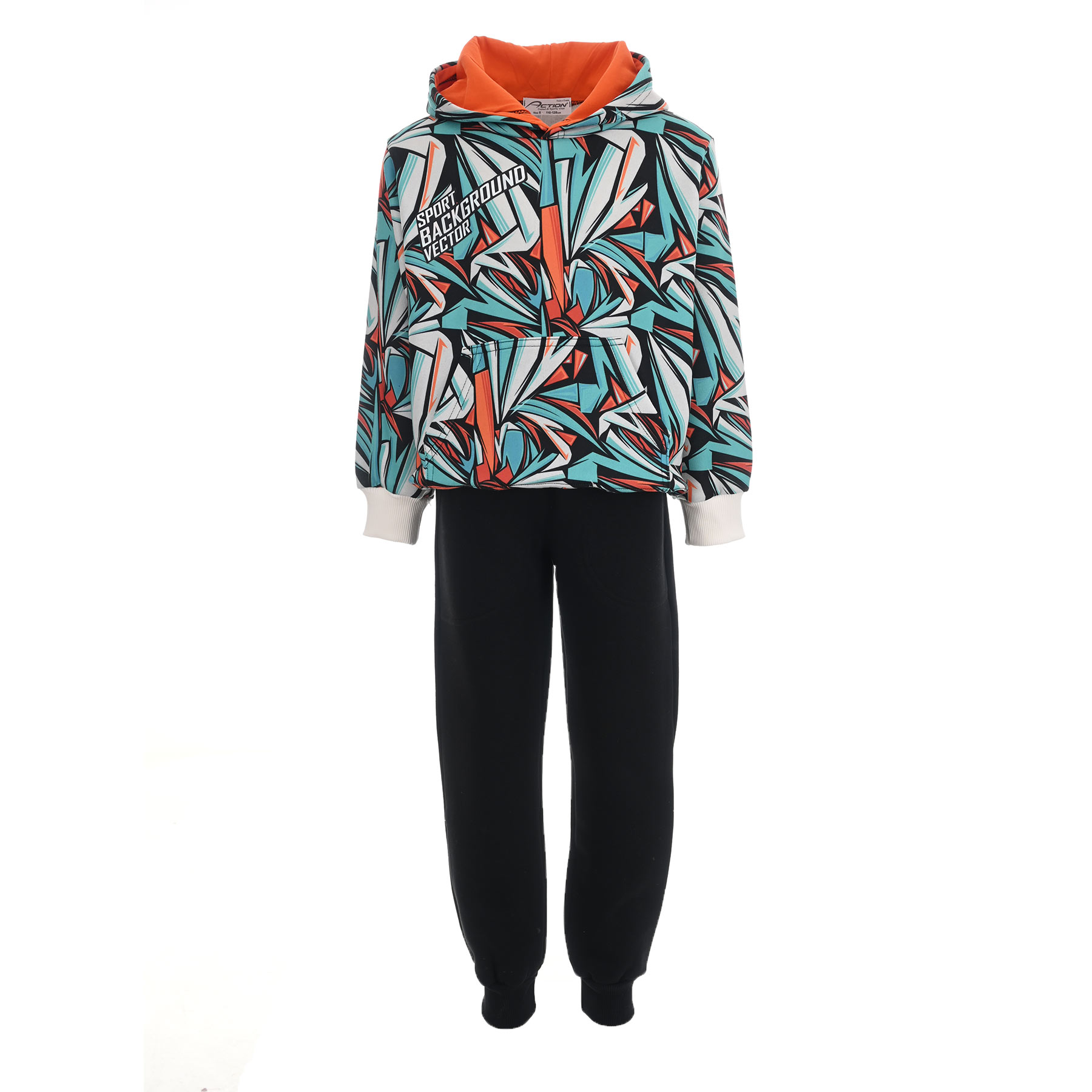 Η μπλούζα διαθέτει εντυπωσιακό γεωμετρικό σχέδιο σε πράσινους, πορτοκαλί και μαύρους τόνους, κουκούλα με πορτοκαλί εσωτερική επένδυση, μπροστινή τσέπη τύπου καγκουρό και τύπωμα SPORT BACKGROUND VECTOR στο στήθος. Το παντελόνι είναι σε μαύρη απόχρωση, με λάστιχο στη μέση και στα μπατζάκια για τέλεια εφαρμογή και ελευθερία κινήσεων.