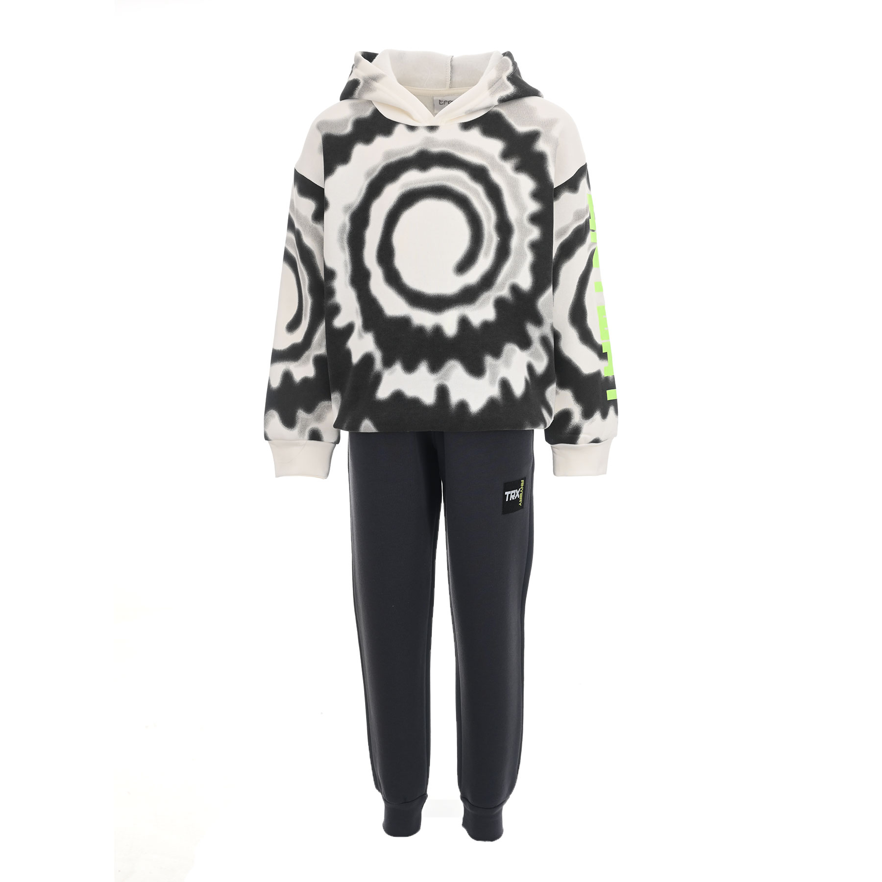 Το παιδικό σετ φόρμα φούτερ για αγόρια Trax σε εκρού ανθρακί χρώμα συνδυάζει στυλ, άνεση και ζεστασιά για όλες τις καθημερινές δραστηριότητες. Το σετ περιλαμβάνει φούτερ με κουκούλα σε μοντέρνο tie-dye σχέδιο και έντονα neon γράμματα στο πίσω μέρος, καθώς και παντελόνι φόρμας σε ανθρακί χρώμα με λάστιχο στη μέση και στους αστραγάλους για άψογη εφαρμογή.