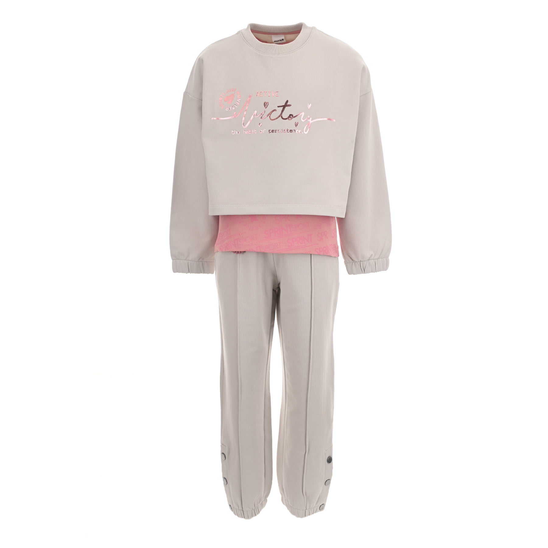 Ανανεώστε τη γκαρνταρόμπα της μικρής σας με το παιδικό σετ φόρμα φούτερ για κορίτσια 3 τμχ Sprint σε μπεζ - ροζ απόχρωση, που συνδυάζει άνεση και μοντέρνο στιλ. Το σετ περιλαμβάνει τρία κομμάτια: