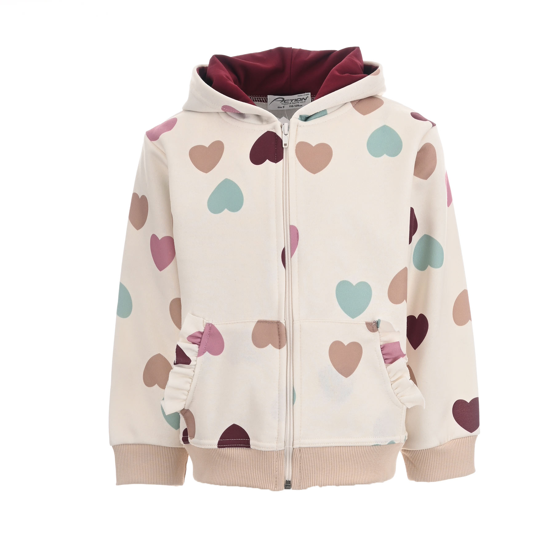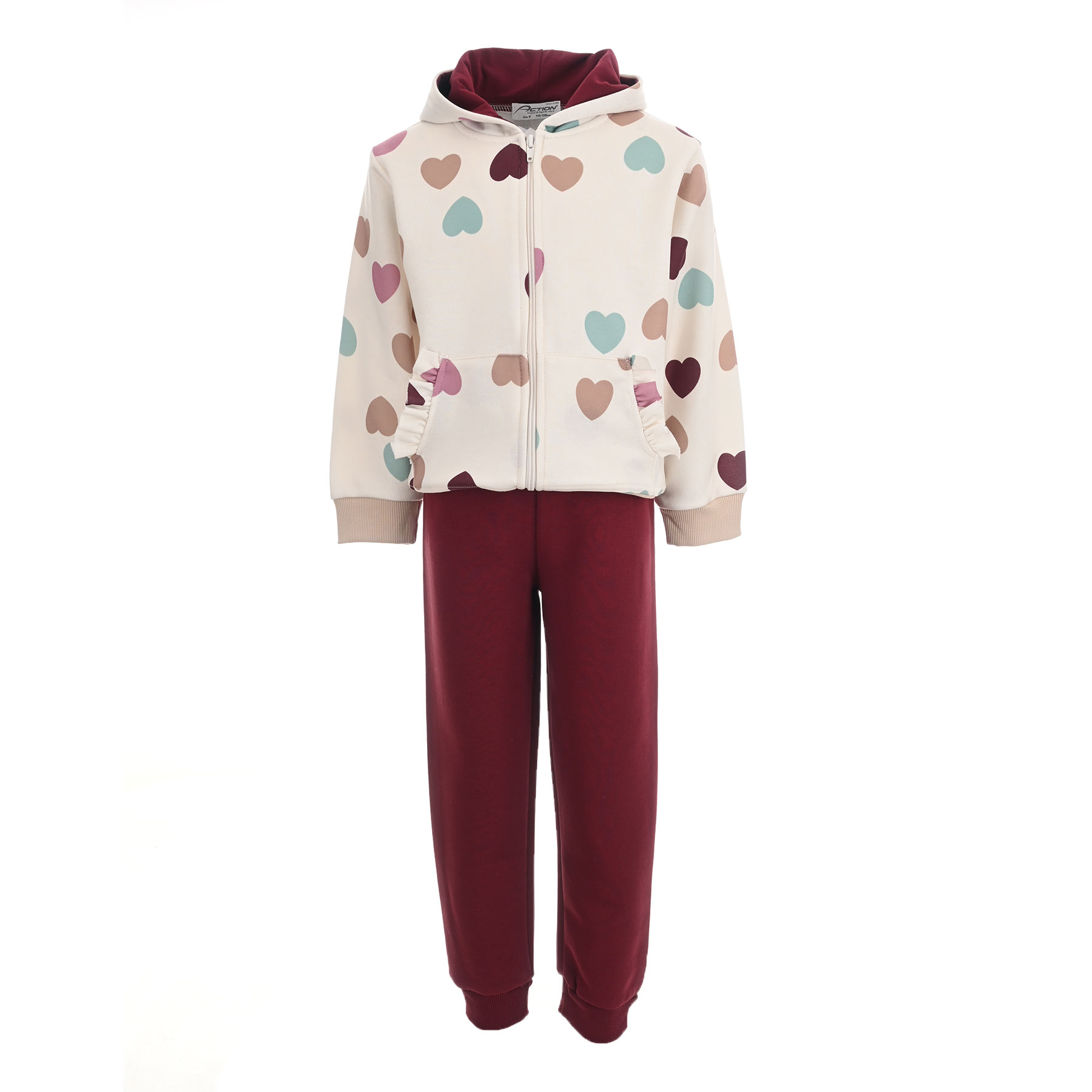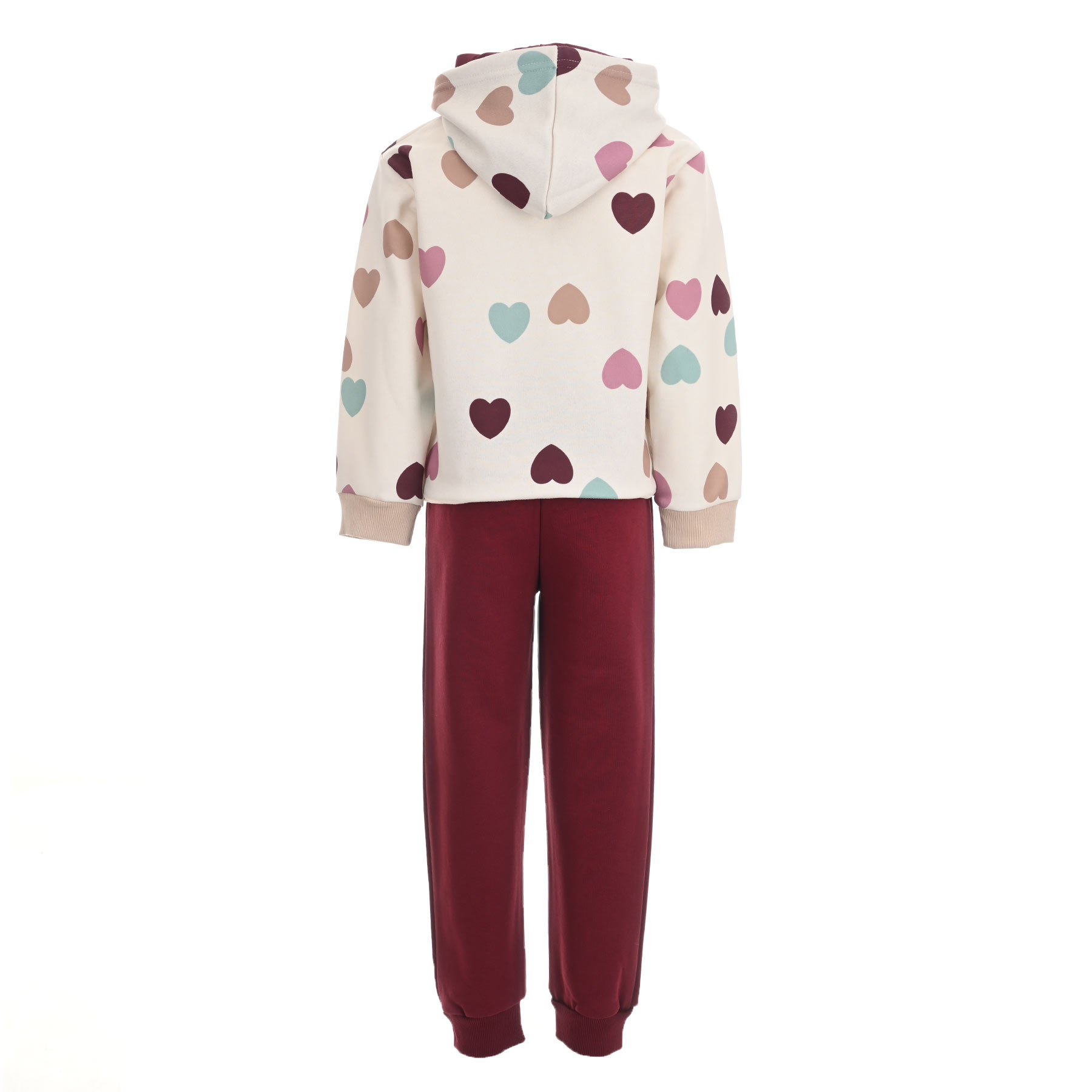 Χαρίστε στο κορίτσι σας άνεση και στυλ με αυτό το υπέροχο παιδικό σετ φόρμας φούτερ για κορίτσια της Action Sportswear, ιδανικό για τις καθημερινές δραστηριότητες και το σχολείο. Το σετ αποτελείται από ζακέτα με κουκούλα σε απαλό μπεζ χρώμα και πολύχρωμο print με καρδούλες, συνδυασμένη με μονόχρωμο παντελόνι φόρμας σε ζεστό μπορντώ.
