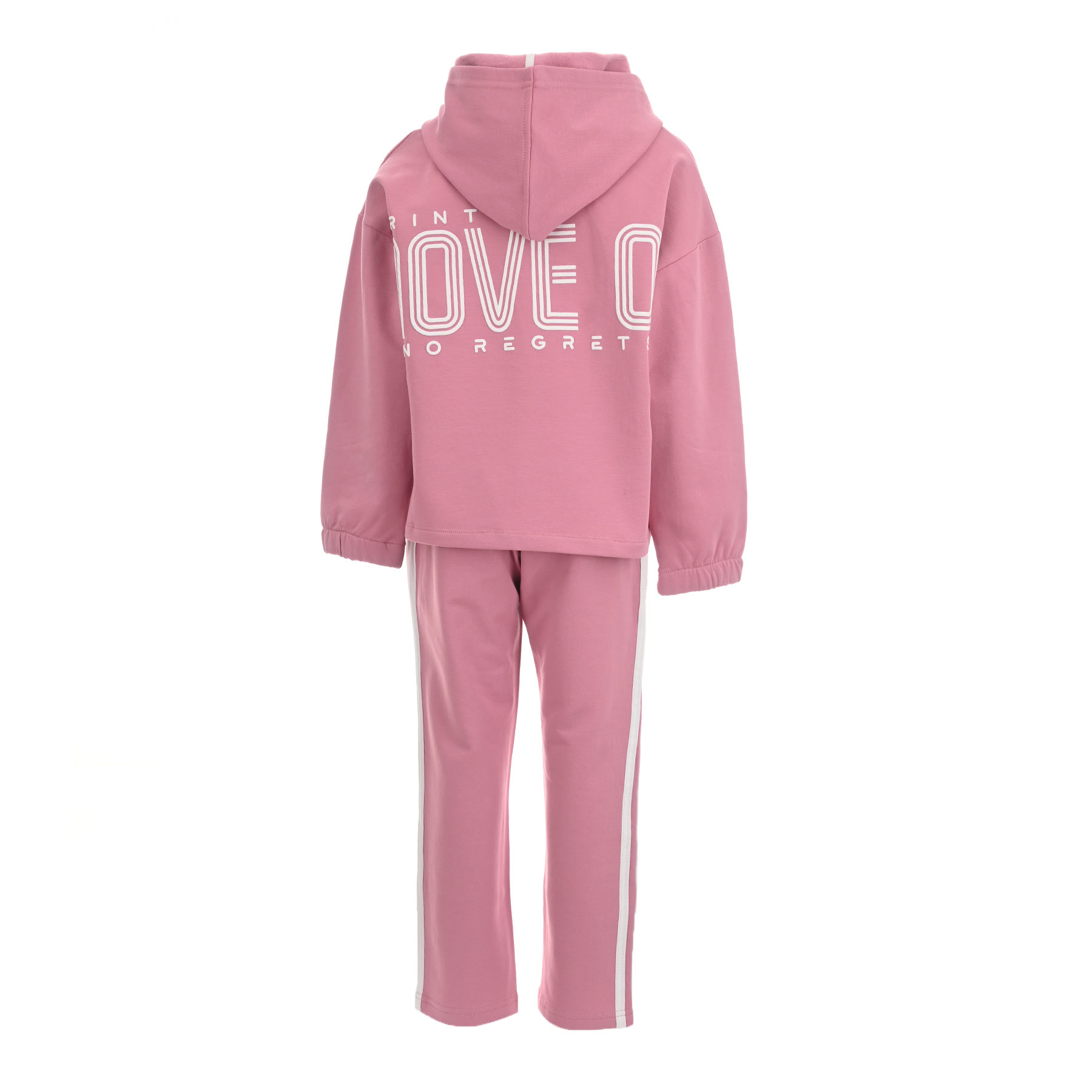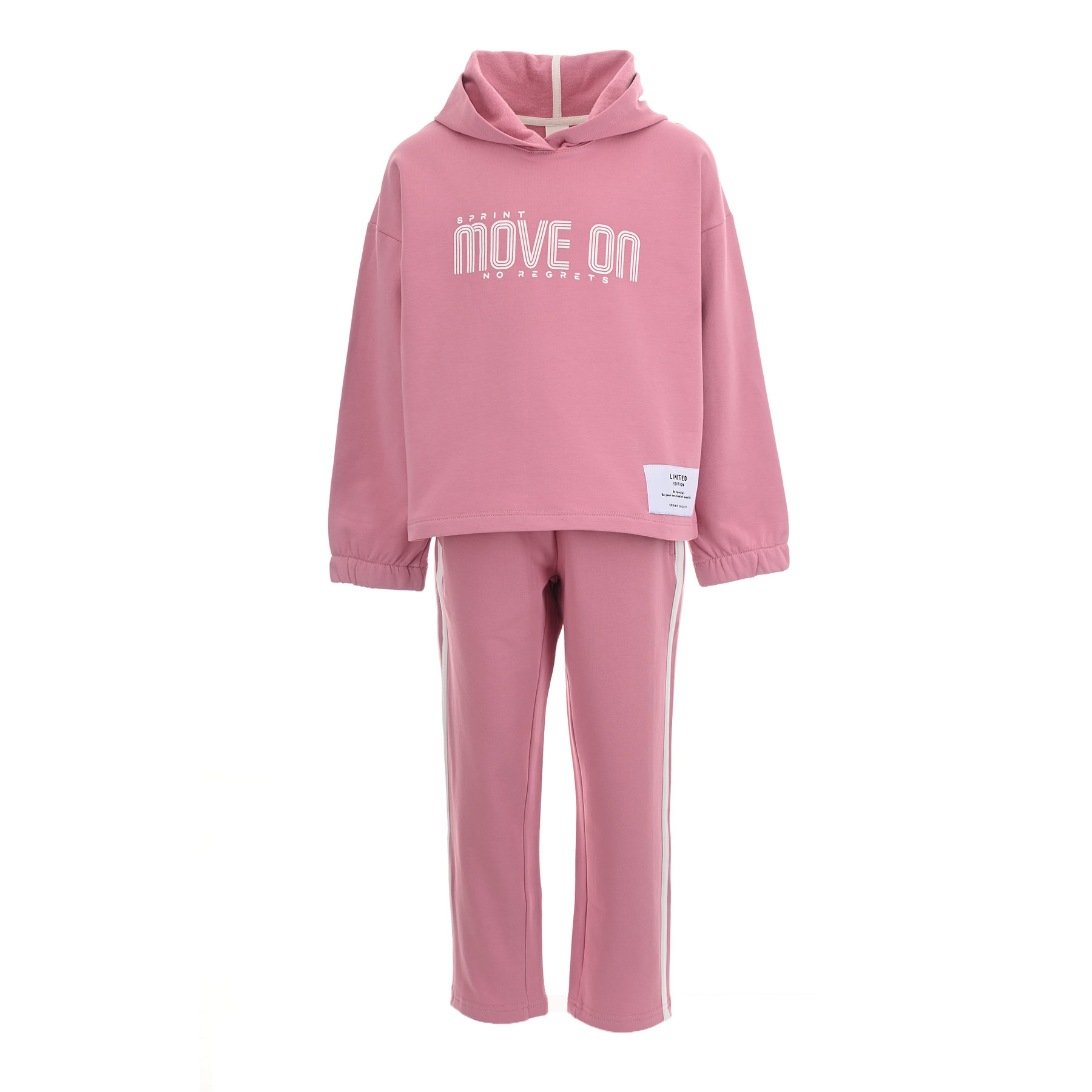 Ανανεώστε τη χειμερινή γκαρνταρόμπα της μικρής σας με αυτό το παιδικό σετ φόρμα φούτερ για κορίτσια Sprint σε ροζ απόχρωση. Το σετ περιλαμβάνει μπλούζα φούτερ με κουκούλα και τύπωμα "Move On - No Regrets" στο μπροστινό και πίσω μέρος, καθώς και παντελόνι φόρμας με πλαϊνές ρίγες σε λευκό χρώμα, για σπορ αλλά και urban streetwear στυλ.