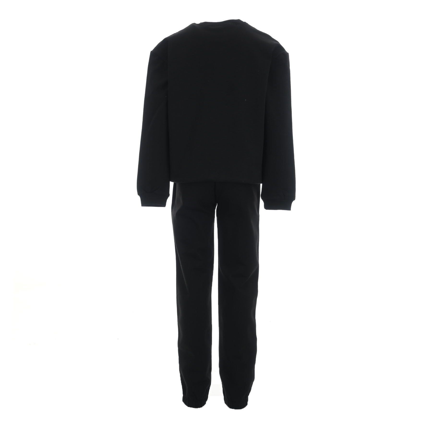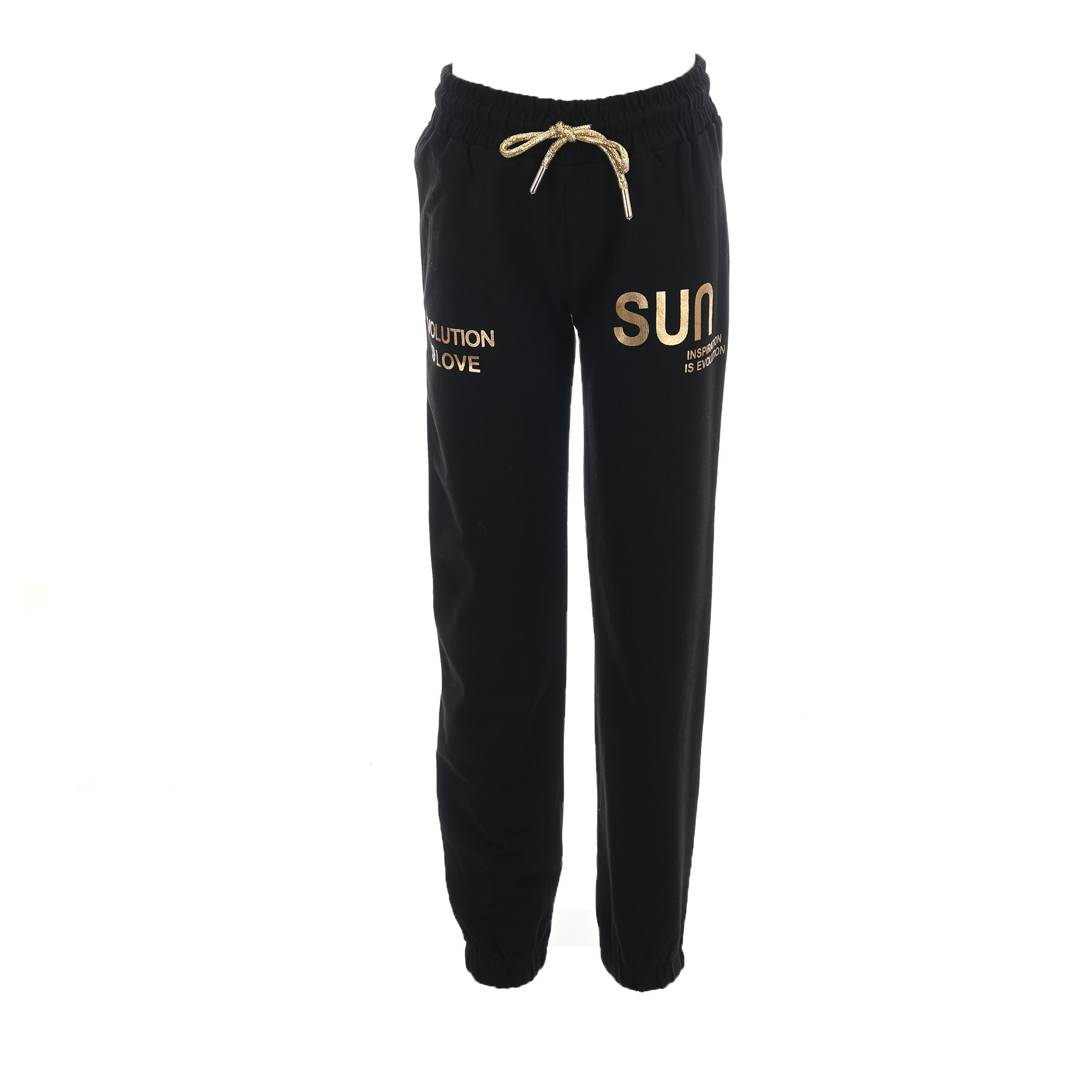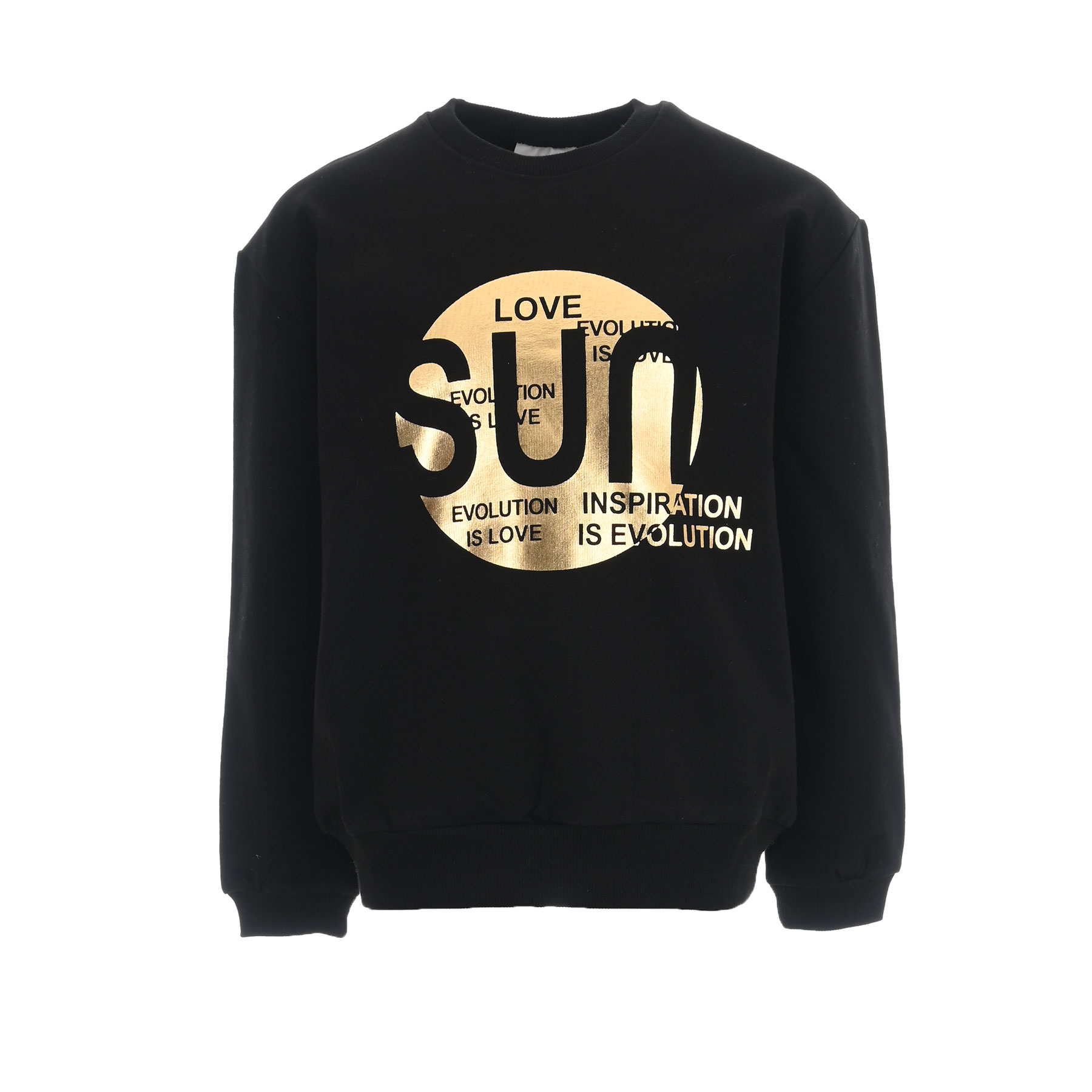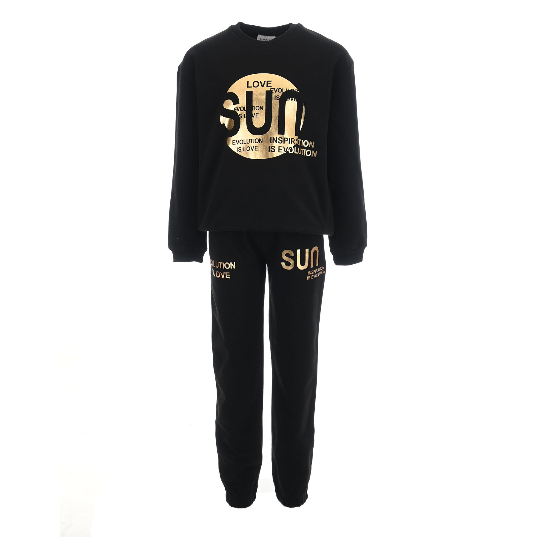 Ανανεώστε τη γκαρνταρόμπα της μικρής σας με το παιδικό σετ φόρμα φούτερ για κορίτσια Trax σε μαύρο χρώμα με εντυπωσιακές χρυσές λεπτομέρειες. Το σετ αποτελείται από ζεστή φούτερ μπλούζα με μοντέρνο τύπωμα SUN σε μεταλλικό χρυσό και αντίστοιχο παντελόνι φόρμας με λάστιχο στη μέση και στους αστραγάλους για άνετη εφαρμογή.