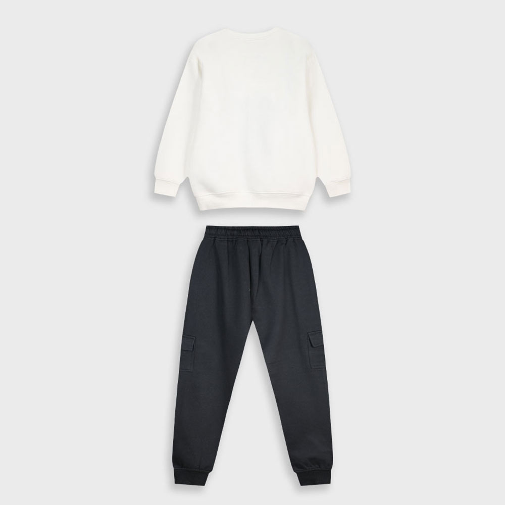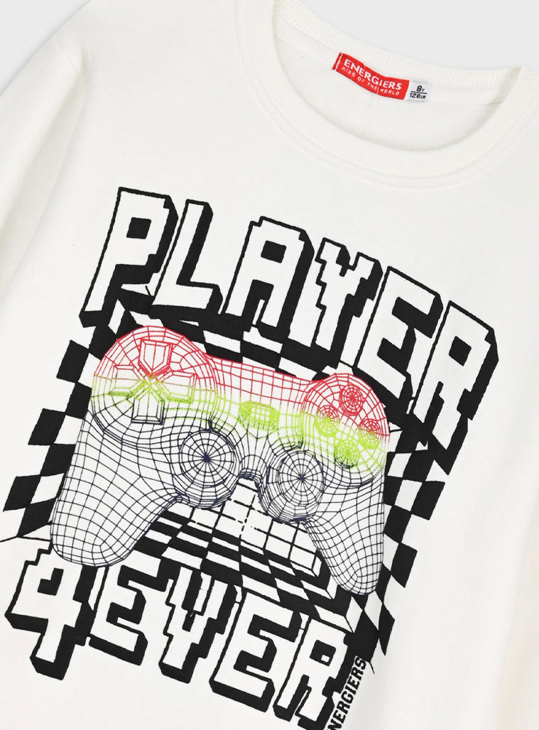 Το σετ φόρμας Energiers αποτελεί την ιδανική επιλογή για κάθε μικρό gamer! Περιλαμβάνει φούτερ σε εκρού χρώμα με εντυπωσιακό τύπωμα "Player 4ever" και χειριστήριο βιντεοπαιχνιδιών, συνδυασμένο με άνετο παντελόνι φόρμας σε μαύρο χρώμα με πρακτικές τσέπες cargo.