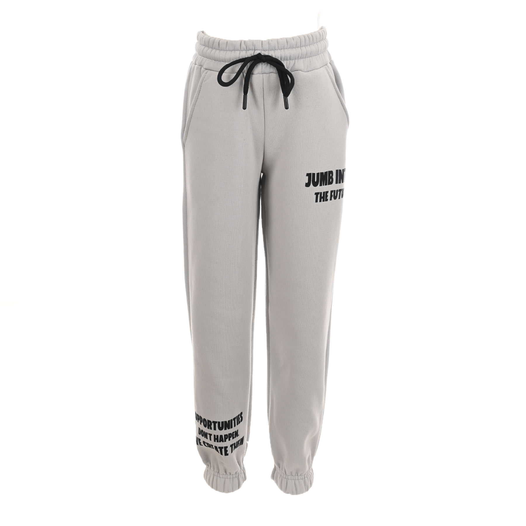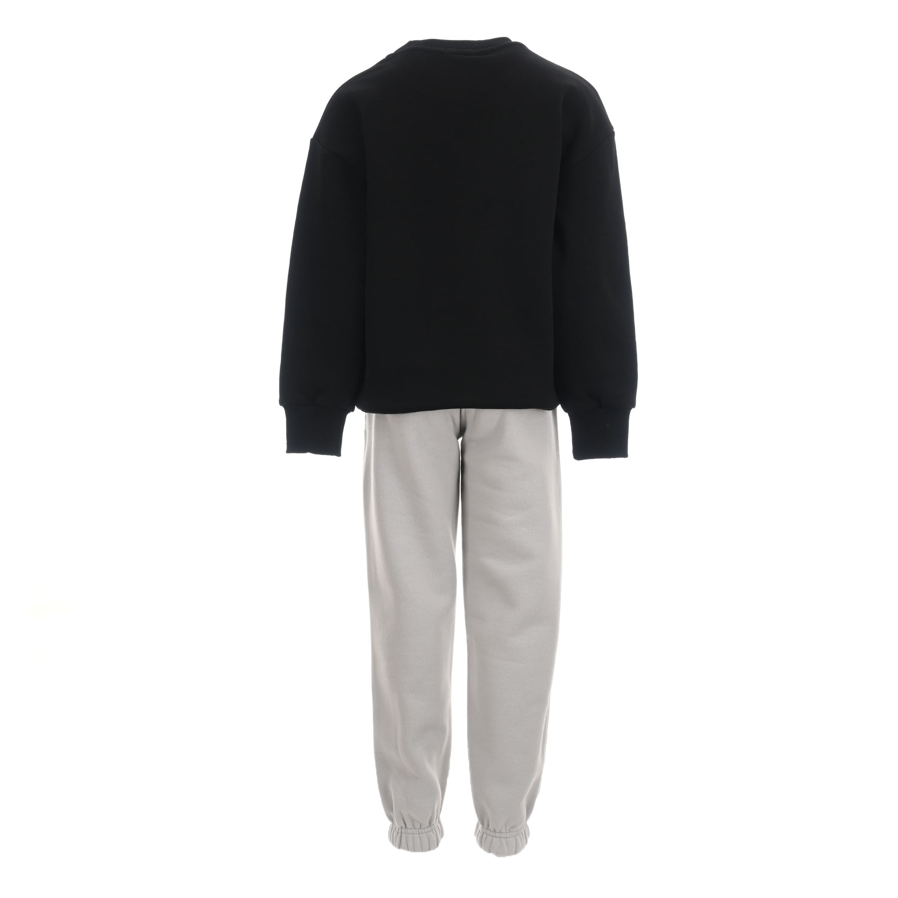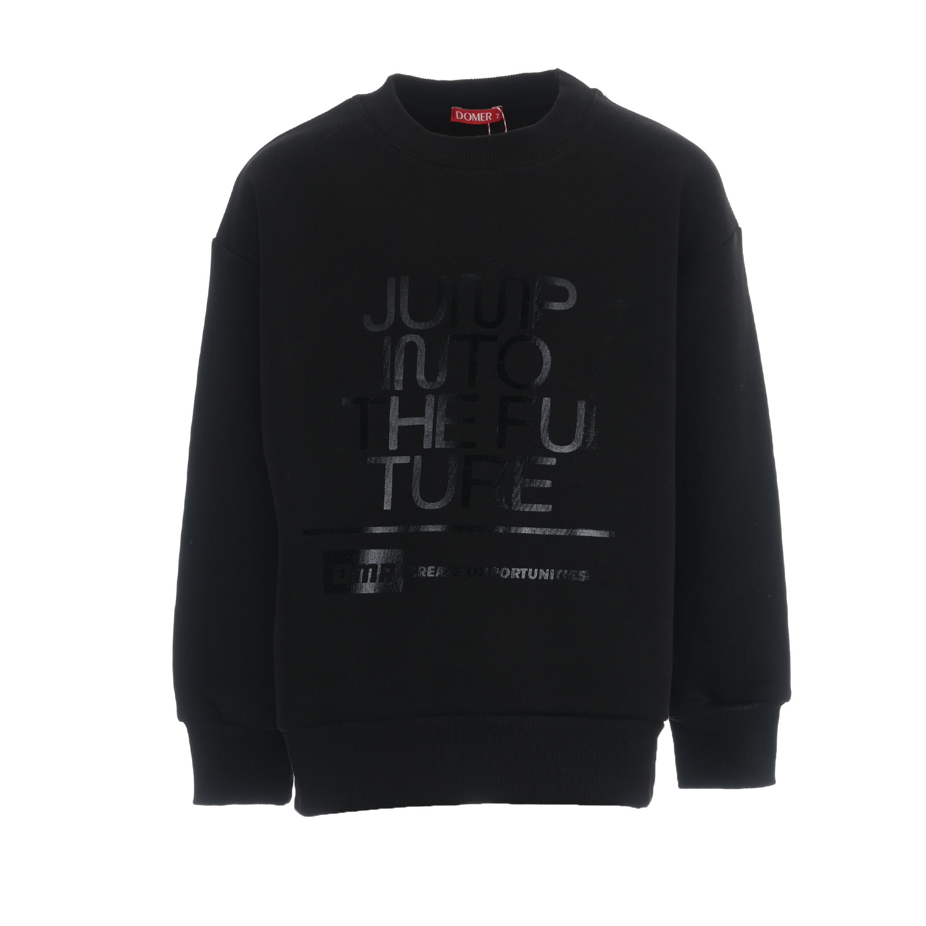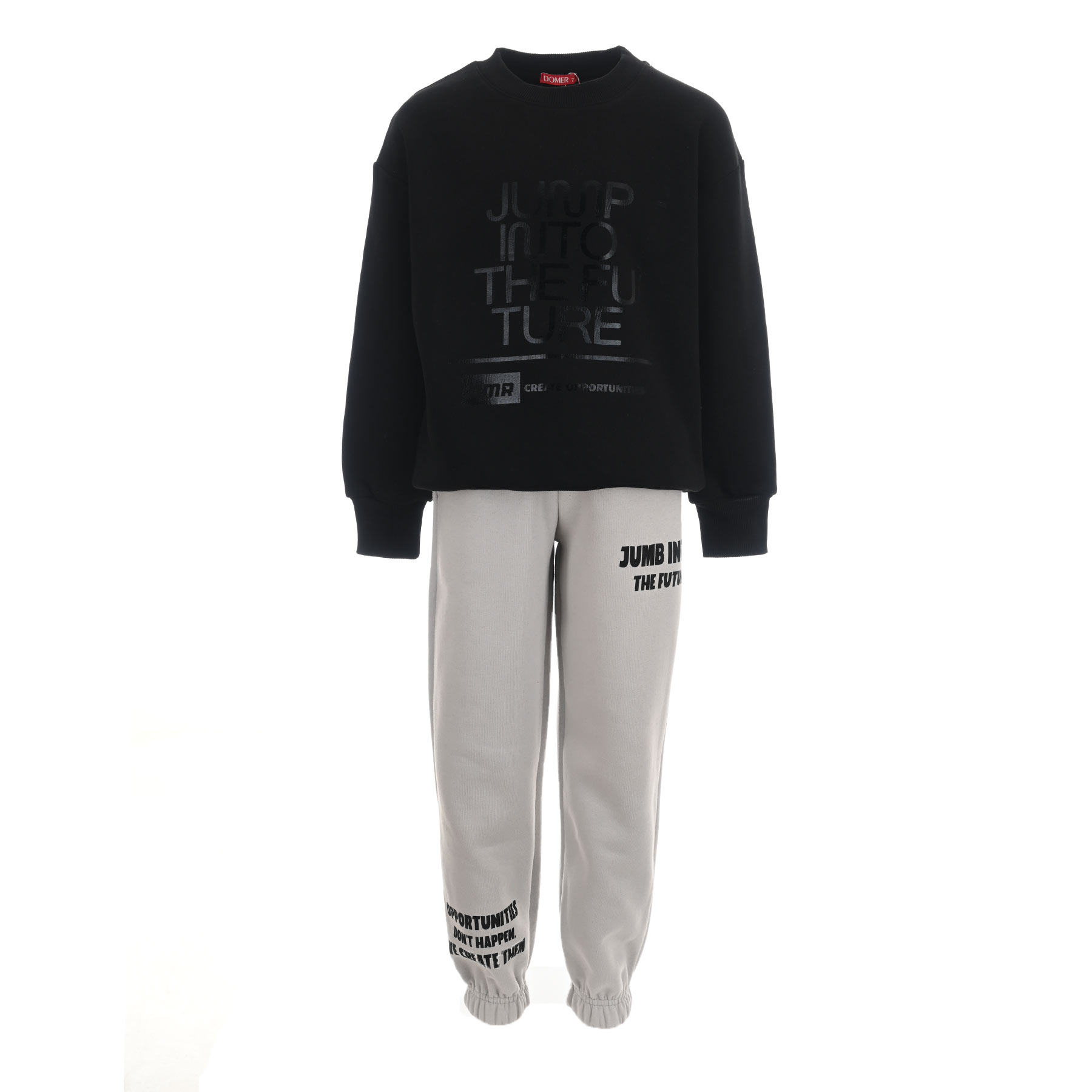 Το παιδικό σετ φόρμας Domer σε μαύρο-γκρι συνδυασμό είναι η ιδανική επιλογή για αγόρια που αγαπούν το άνετο αλλά και μοντέρνο στυλ. Η μπλούζα σε κλασικό μαύρο χρώμα διαθέτει εντυπωσιακή γυαλιστερή στάμπα Jump Into The Future στο στήθος, προσδίδοντας urban χαρακτήρα, ενώ το παντελόνι σε γκρι απόχρωση συμπληρώνει αρμονικά το look με επιγραφές στο πόδι που δίνουν μια streetwear πινελιά.