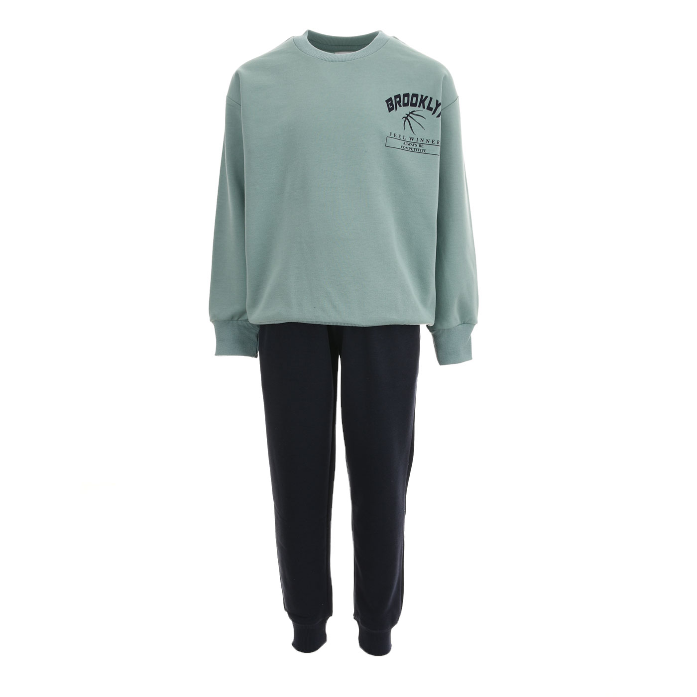 Ανανεώστε το παιδικό ντύσιμο με αυτό το μοντέρνο παιδικό σετ φόρμας για αγόρια σε μοναδικό συνδυασμό μέντας και μαρέν. Ένα ολοκληρωμένο σύνολο που συνδυάζει άνεση, ποιότητα και σύγχρονο sporty στυλ, ιδανικό για το σχολείο, τις βόλτες και τις καθημερινές δραστηριότητες.Η μπλούζα φούτερ σε απόχρωση μέντας ξεχωρίζει για τον minimal σχεδιασμό μπροστά και το εντυπωσιακό τύπωμα στην πλάτη με μπασκετικό θέμα και δυναμικό μήνυμα, χαρίζοντας urban χαρακτήρα. Διαθέτει στρογγυλή λαιμόκοψη, ελαστικές μανσέτες και μαλακή υφή που προσφέρει άνετη εφαρμογή όλη μέρα.Το παντελόνι φόρμας σε μαρέν χρώμα συμπληρώνει ιδανικά το σύνολο, με ελαστική μέση για σταθερή εφαρμογή και μπατζάκια με λάστιχο που αγκαλιάζουν το πόδι χωρίς να πιέζουν. Το ύφασμα είναι απαλό και ανθεκτικό, κατάλληλο για έντονη καθημερινή χρήση.