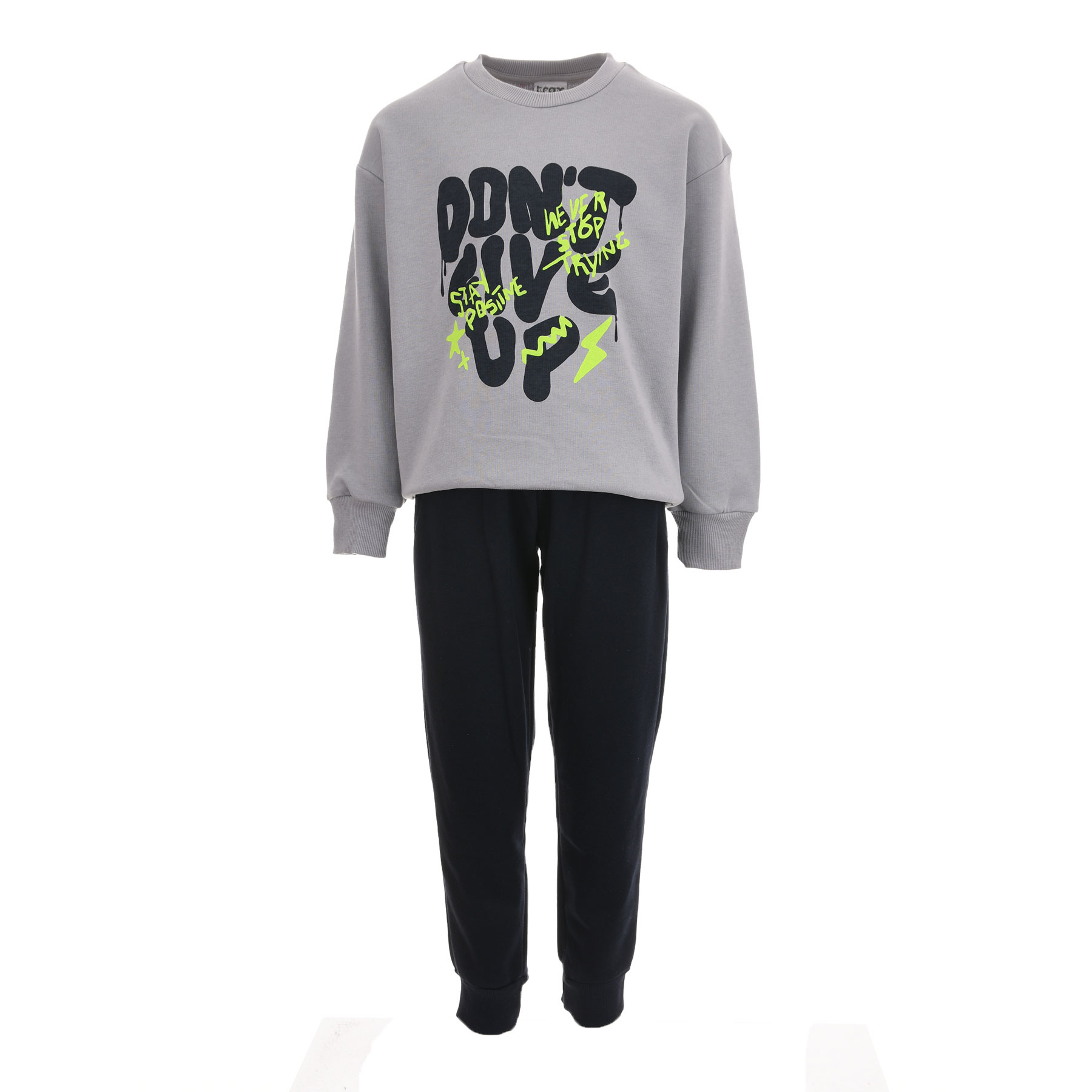 Παιδικό σετ φόρμας αχνούδιαστη Trax σε γκρι-μαρέν συνδυασμό, ιδανικό για άνεση και ζεστασιά τις πιο δροσερές ημέρες. Το σετ αποτελείται από γκρι φούτερ με μοντέρνο τύπωμα DONT GIVE UP σε μαύρο και neon λεπτομέρειες που χαρίζουν δυναμικό και urban χαρακτήρα, καθώς και από μαρέν παντελόνι φόρμας με λάστιχο στη μέση και στα μπατζάκια για σταθερή εφαρμογή. Η εσωτερική αχνούδιαστη επένδυση προσφέρει απαλή αίσθηση και επιπλέον ζεστασιά, καθιστώντας το ιδανικό για σχολείο, βόλτες και καθημερινές δραστηριότητες. Κατασκευασμένο από ποιοτικό βαμβακερό ύφασμα με ανθεκτικότητα στη χρήση, εξασφαλίζει ελευθερία κινήσεων και άνετη εφαρμογή όλη μέρα. Ένα πρακτικό και στιλάτο παιδικό σετ φόρμας Trax που συνδυάζει άνεση, ποιότητα και σύγχρονο design για αγόρια που αγαπούν το sporty look.