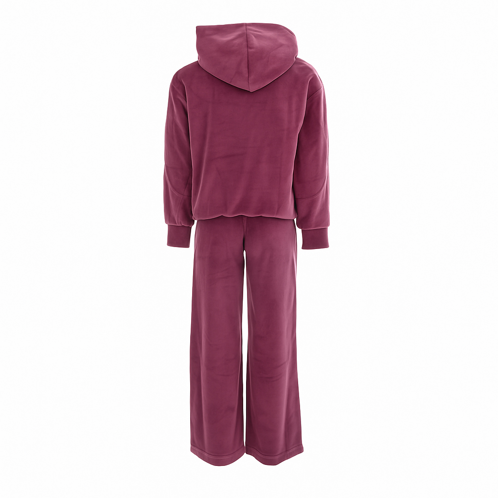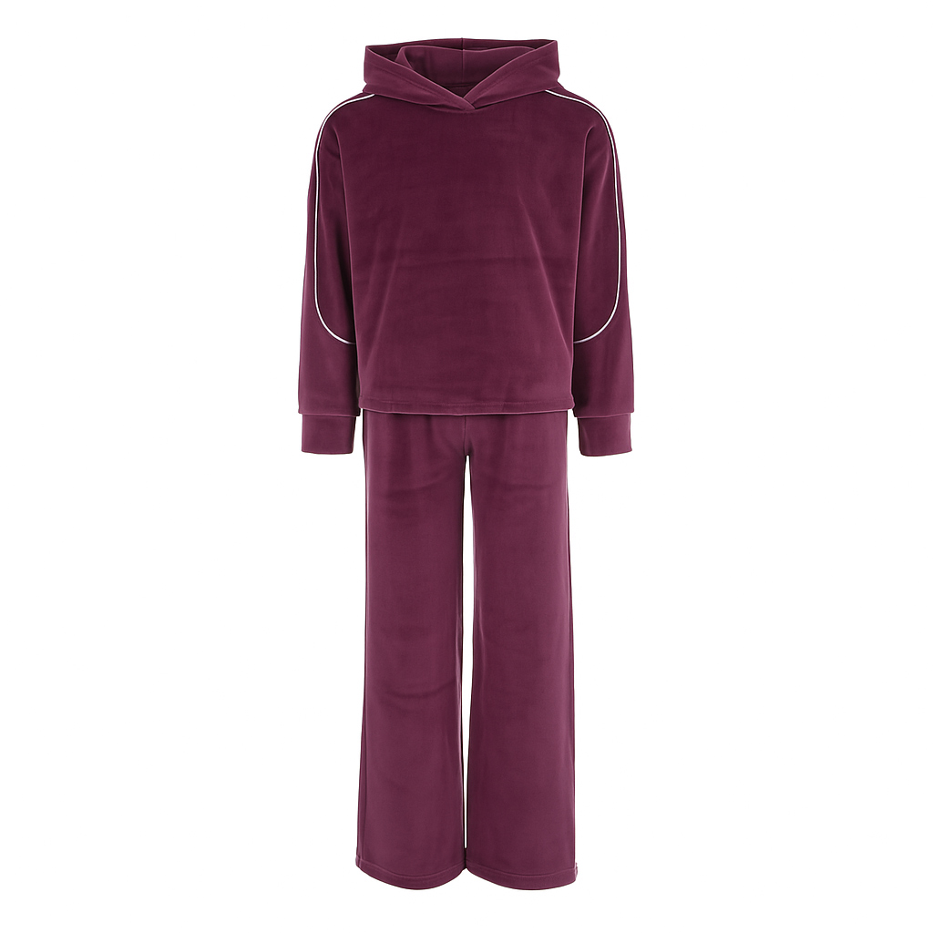 Το σετ αποτελείται από μπλούζα φούτερ με κουκούλα και παντελόνι σε ίσια γραμμή, προσφέροντας τέλεια εφαρμογή και ελευθερία κινήσεων. Το βελουτέ ύφασμα χαρίζει πολυτελή υφή και λάμψη, ενώ οι ασημί ραφές προσθέτουν μια διακριτική, κοριτσίστικη πινελιά.