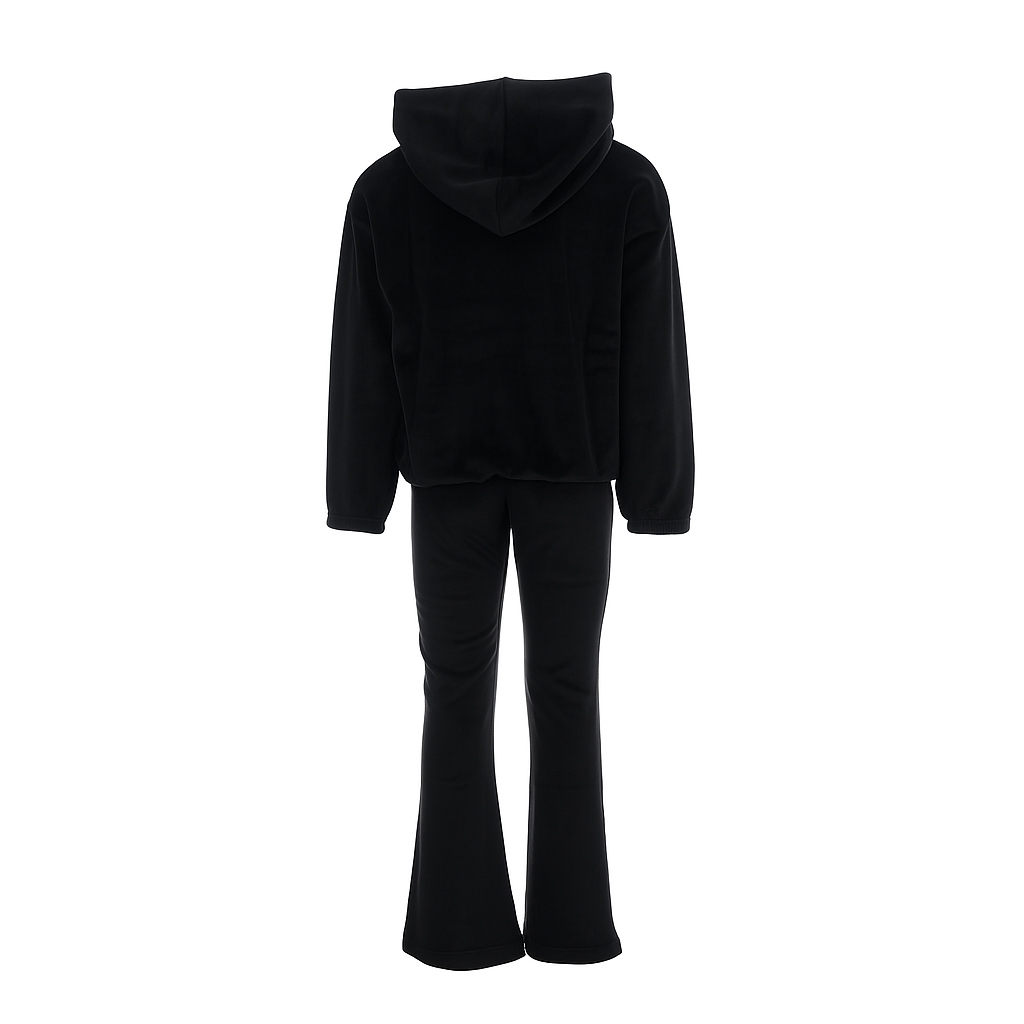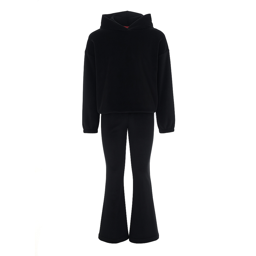 Το σετ περιλαμβάνει μπλούζα φούτερ με κουκούλα και παντελόνι καμπάνα, προσφέροντας μοναδικό look με άνετη εφαρμογή. Το βελουτέ ύφασμα χαρίζει πολυτελή αίσθηση και εξαιρετική απαλότητα, ενώ το μαύρο χρώμα το καθιστά ευκολοφόρετο και κομψό για κάθε περίσταση.