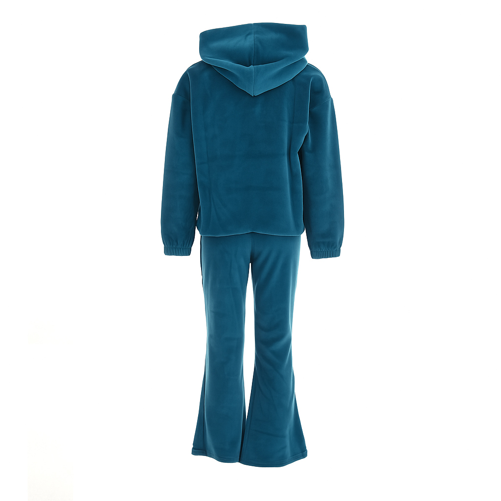 Το σετ περιλαμβάνει μπλούζα φούτερ με κουκούλα και παντελόνι καμπάνα, προσφέροντας μοναδικό look με άνετη εφαρμογή. Το βελουτέ ύφασμα χαρίζει πολυτελή αίσθηση και εξαιρετική απαλότητα, ενώ το ουδέτερο πετρόλ χρώμα το καθιστά ευκολοφόρετο και κομψό για κάθε περίσταση.