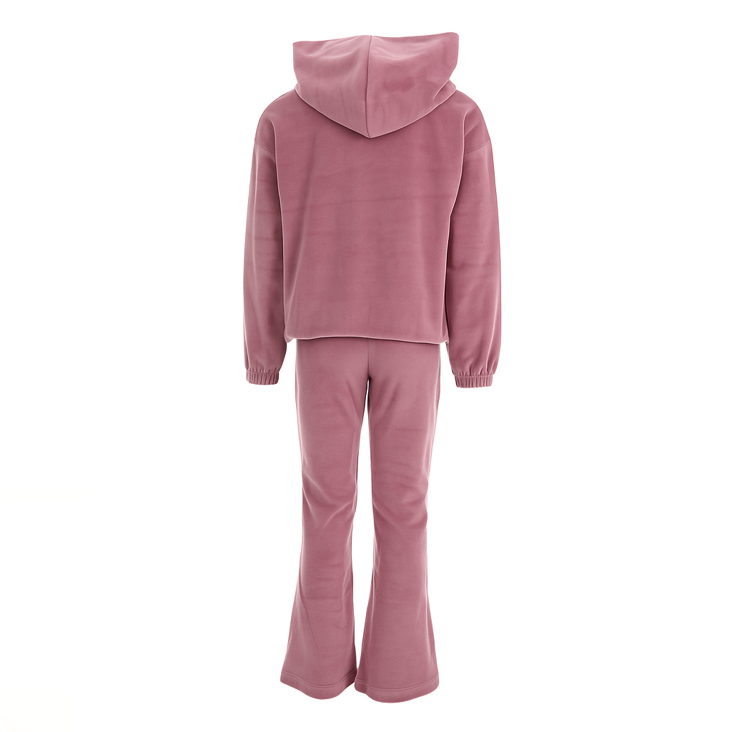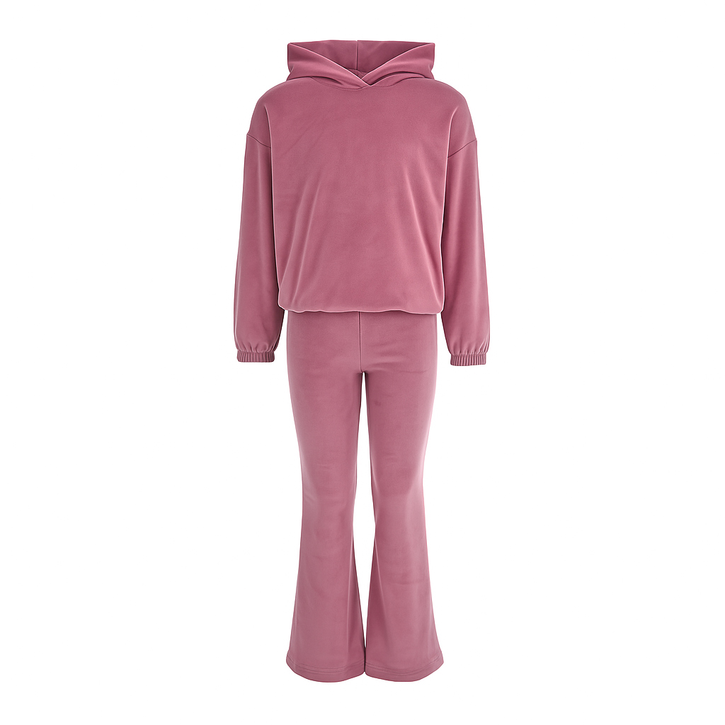Το σετ περιλαμβάνει μπλούζα φούτερ με κουκούλα και παντελόνι καμπάνα, προσφέροντας μοναδικό look με άνετη εφαρμογή. Το βελουτέ ύφασμα χαρίζει πολυτελή αίσθηση και εξαιρετική απαλότητα, ενώ το ουδέτερο σάπιο μήλο χρώμα το καθιστά ευκολοφόρετο και κομψό για κάθε περίσταση.