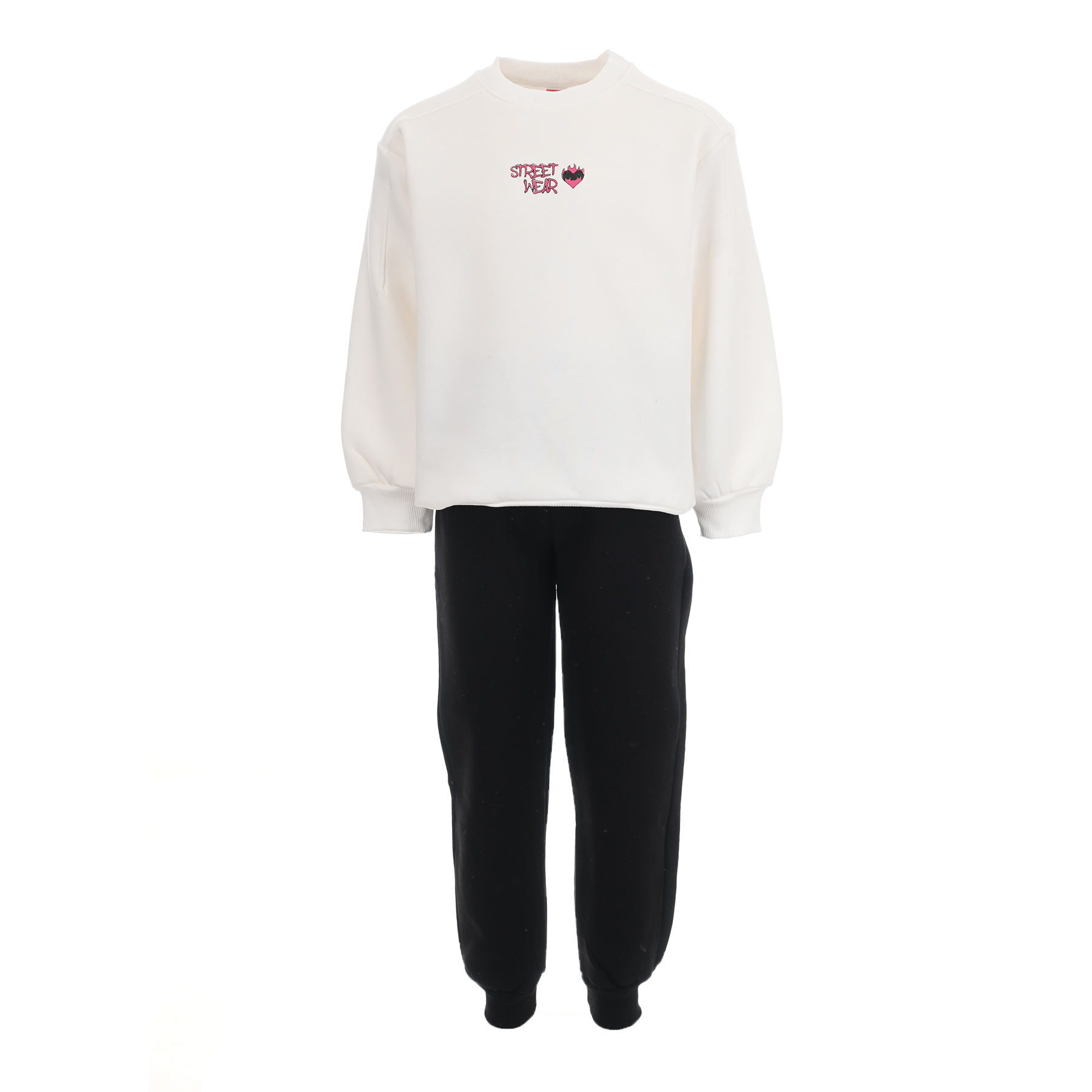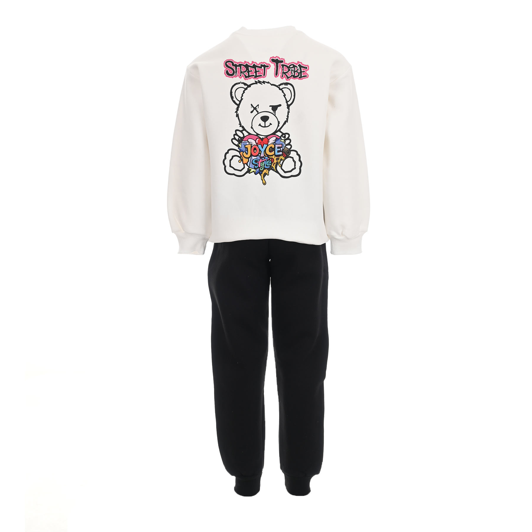Ανανεώστε τη συλλογή της μικρής σας με αυτό το κομψό και άνετο σετ φόρμας Joyce σε εκρού-μαύρο. Το σετ αποτελείται από μπλούζα φούτερ με στρογγυλή λαιμόκοψη και ιδιαίτερο print μπροστά με το λογότυπο Street Wear και μικρή καρδιά, ενώ στο πίσω μέρος ξεχωρίζει το μεγάλο σχέδιο με αρκουδάκι και graffiti λεπτομέρειες που δίνουν urban street στυλ. Το παντελόνι σε μαύρο χρώμα διαθέτει λάστιχο στη μέση και στα τελειώματα για άνετη εφαρμογή και ζεστασιά.