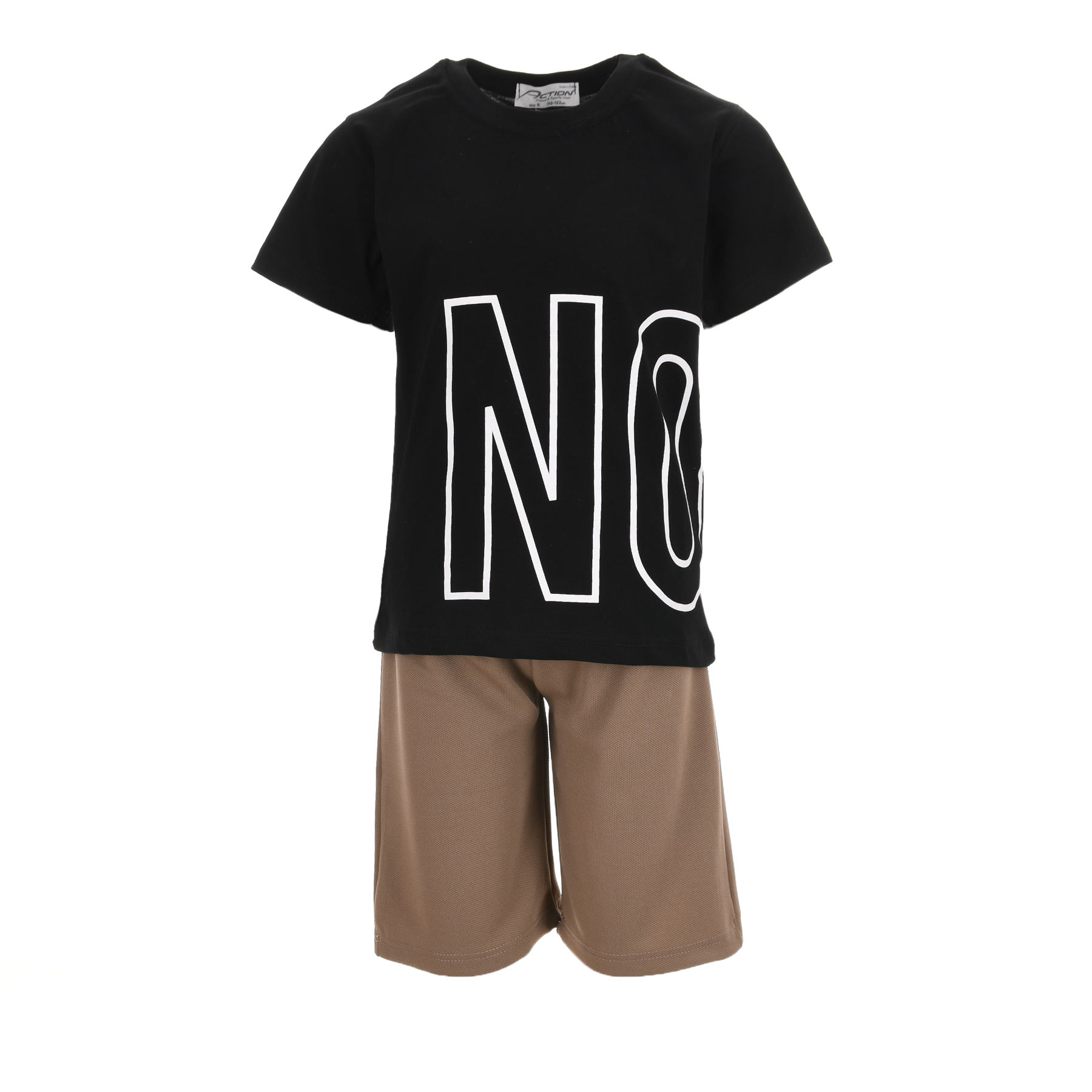 Το παιδικό σετ για αγόρια Action Sportswear σε μαύρο-ταμπά συνδυασμό είναι η τέλεια επιλογή για sporty και μοντέρνες εμφανίσεις. Η μπλούζα με bold τύπωμα NO χαρίζει δυναμικό χαρακτήρα, ενώ το ταμπά σορτσάκι προσθέτει ισορροπία και στυλ στο outfit.