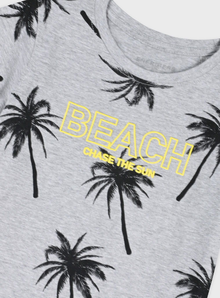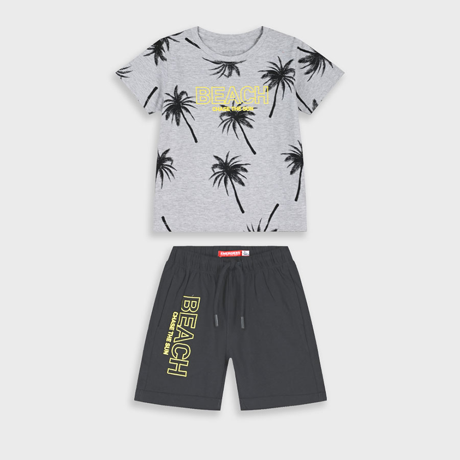 Το παιδικό σετ για αγόρια Energiers σε γκρι-μαύρο είναι η ιδανική επιλογή για casual και άνετες καλοκαιρινές εμφανίσεις. Η μπλούζα με all-over print φοίνικες και το μήνυμα Beach Chase the Sun αποπνέει καλοκαιρινή διάθεση, ενώ το μαύρο σορτσάκι ολοκληρώνει το σύνολο με minimal και πρακτικό στυλ.