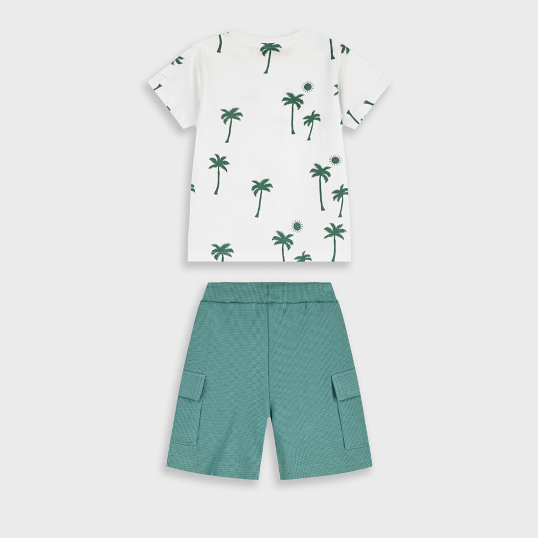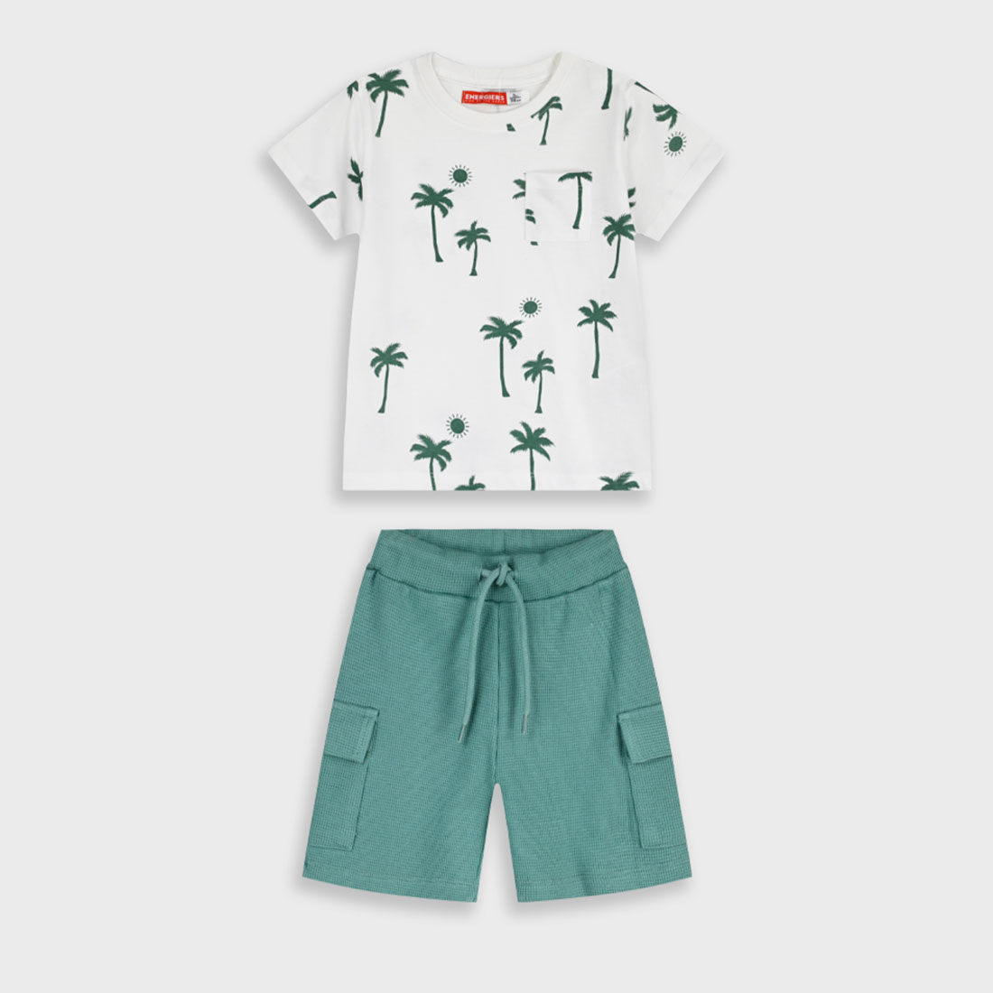 Το παιδικό σετ για αγόρια Energiers λευκό-πράσινο συνδυάζει καλοκαιρινή φρεσκάδα και άνεση σε ένα ολοκληρωμένο outfit. Η λευκή μπλούζα με σχέδιο φοίνικες και διακριτική τσεπούλα δίνει tropical χαρακτήρα, ενώ το πράσινο σορτσάκι με υφή waffle και cargo τσέπες προσφέρει πρακτικότητα και μοντέρνο look.